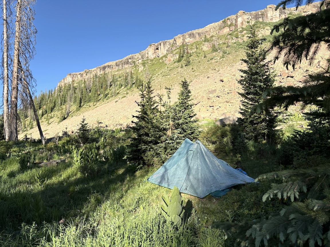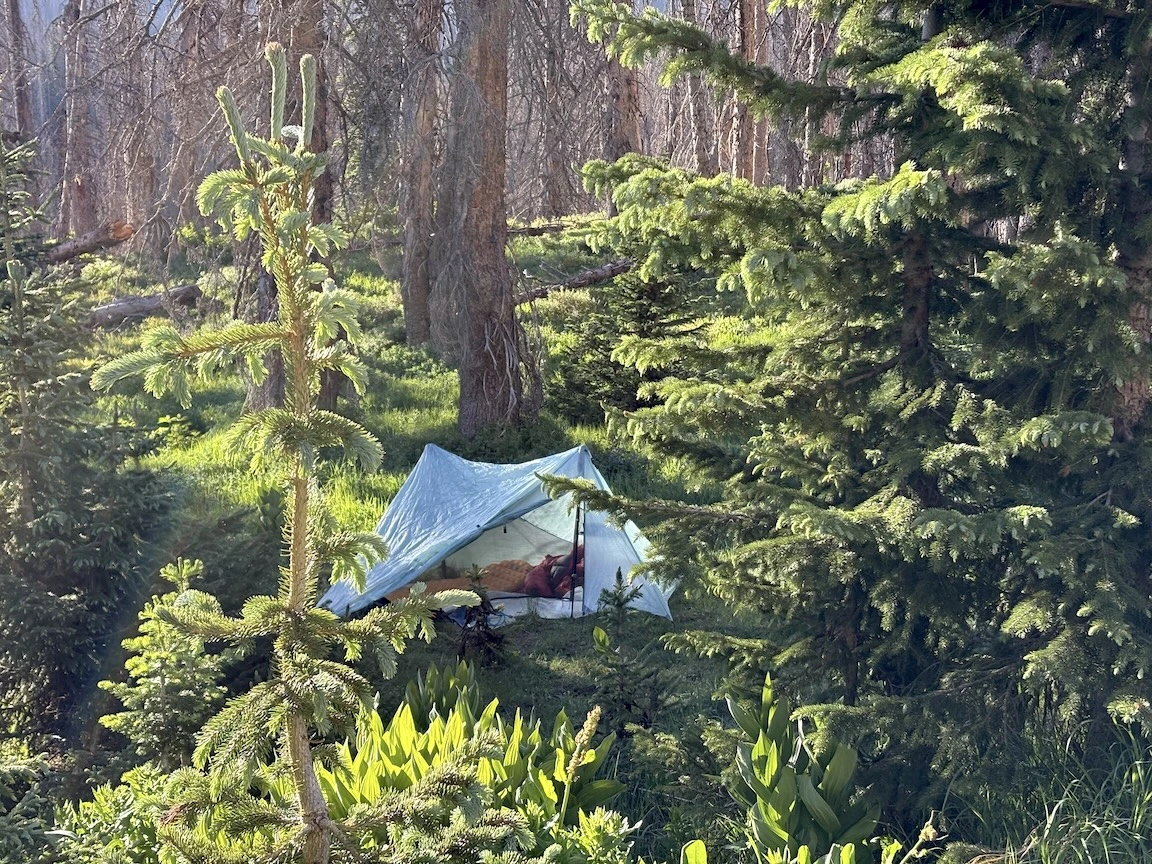 Going back to the trail, we went down a couple of thousand feet to a heavily traveled trail by a river, where we were very lucky to find a campsite with some shelter and privacy. It's amazing to me how most people will choose to pitch their tent right by the side of the trail; we always try to get away from other people.