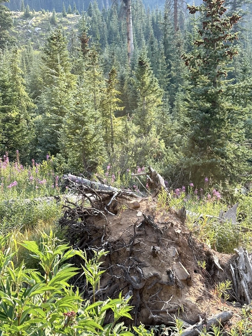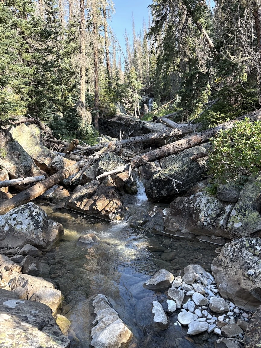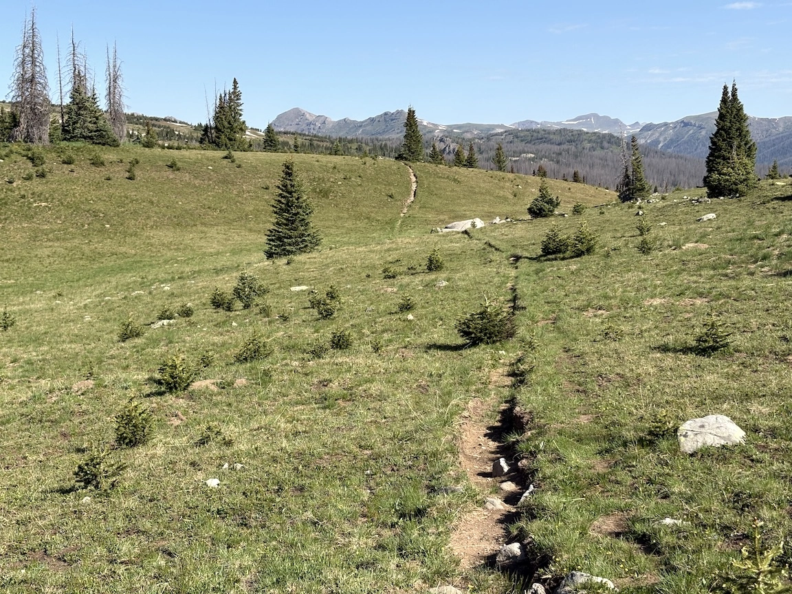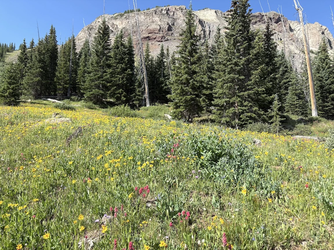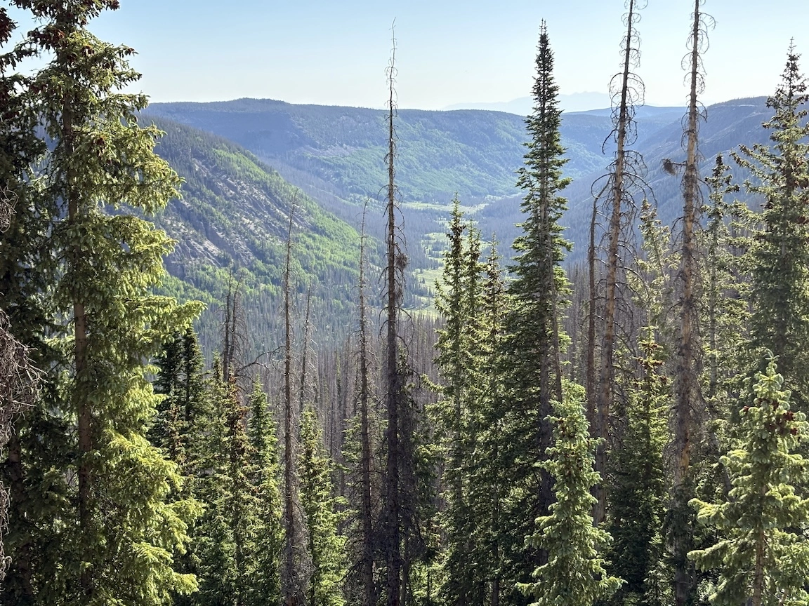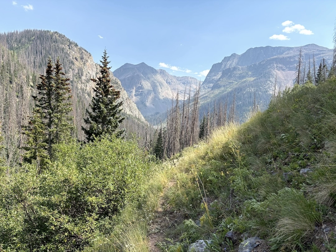 The next morning we first followed the trail down through aspens, then crossed the river and climbed steeply to reach a social trail that traverses the side of a different basin. We enjoyed some views of the river valley and famous peaks, with a bit of color on our way back to the trailhead, and avoided the crowds until rejoining the main trail. While some of the neighboring wilderness areas are probably better for true leaf-peeping, this is a pretty place, and if you venture off the most traveled trails, you can enjoy an illusion of solitude.