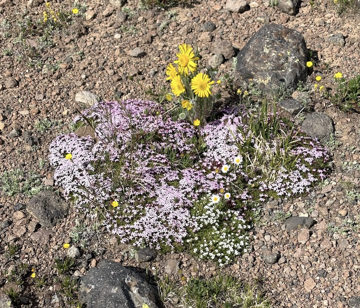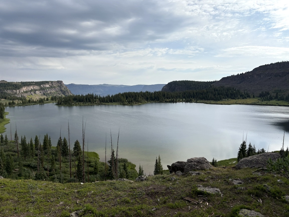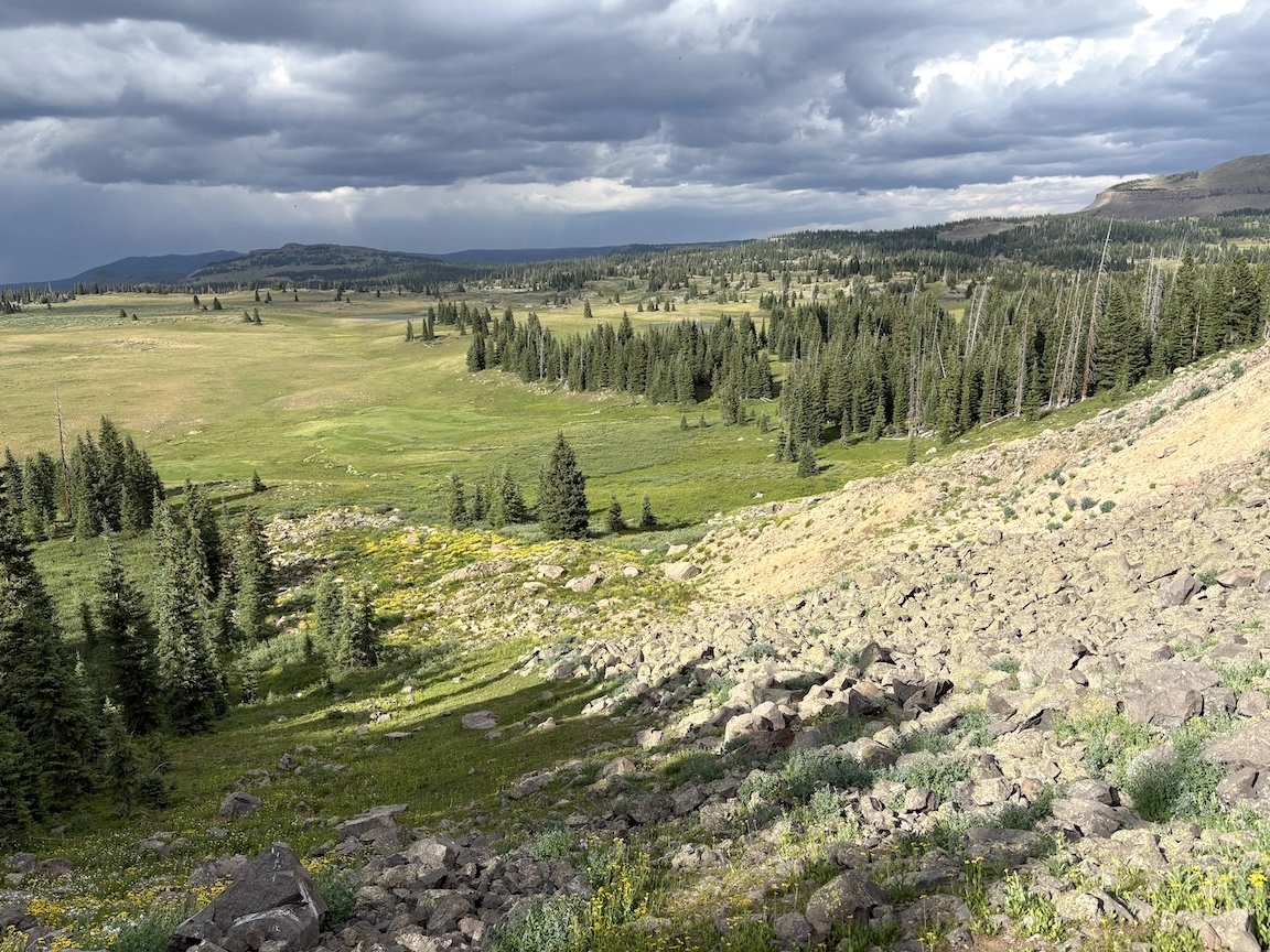We made our way down into the basin and across to a pretty area with some small ponds. It would have been a nice place to camp in less windy conditions. Max spent the whole day hunting and eating giant grasshoppers.