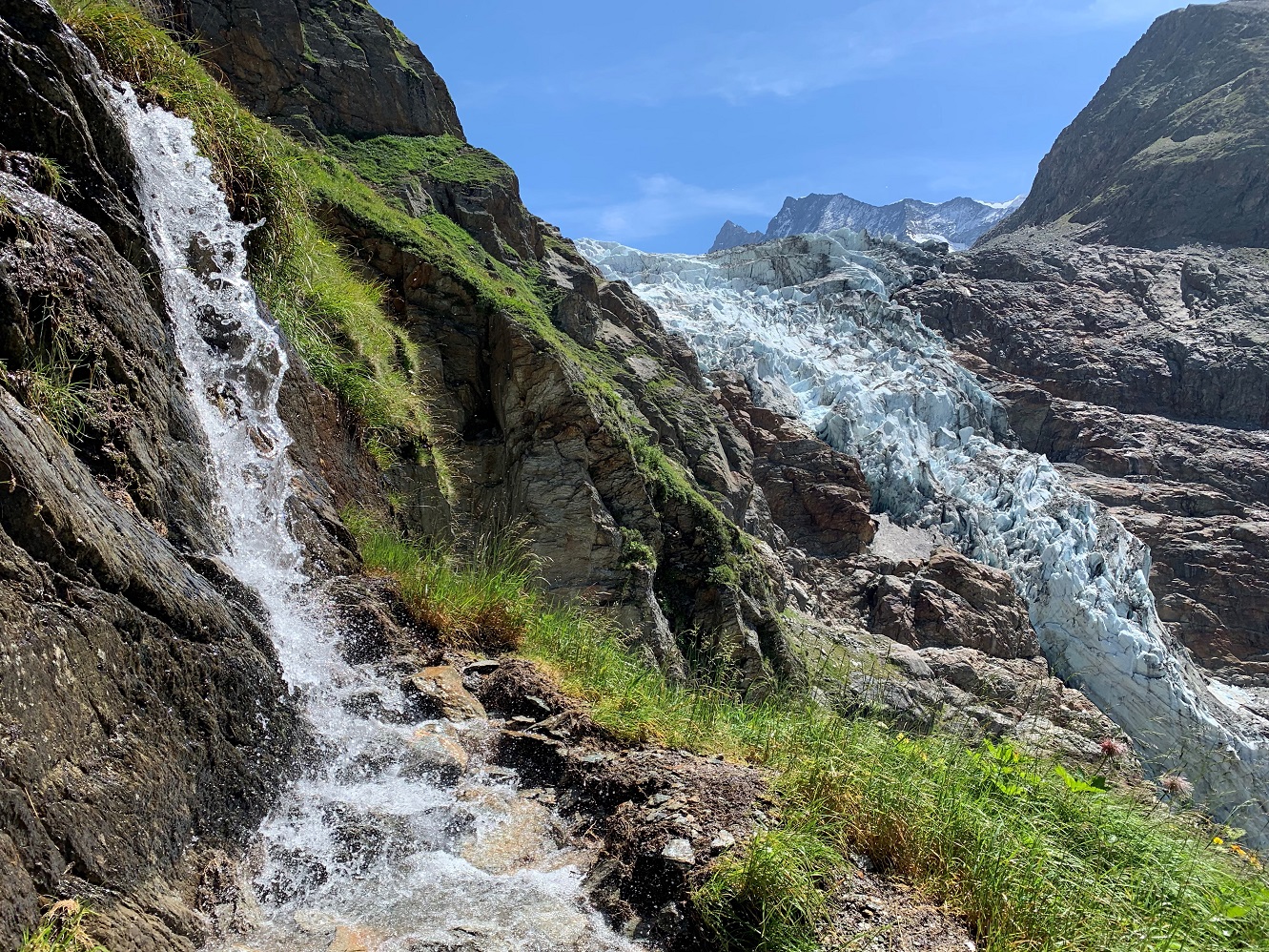 How every glacier I have seen in Switzerland has disappeared : the yellow lines represent where the glacier was about 30+ years ago. The smooth bare-rocks without top-soil are where the melting glacier wash away any loose soil, and moving glaciers carve away the rocks to leave smooth bedrock. In some places one can see strange 'mounds' (or hills, I fail to recall the name, but in relation to the mountains they look small, but are huge) far below the current level of glacier...characterized by unnaturally straight or curved edges ... these are the deposits from where the glacier used to be.