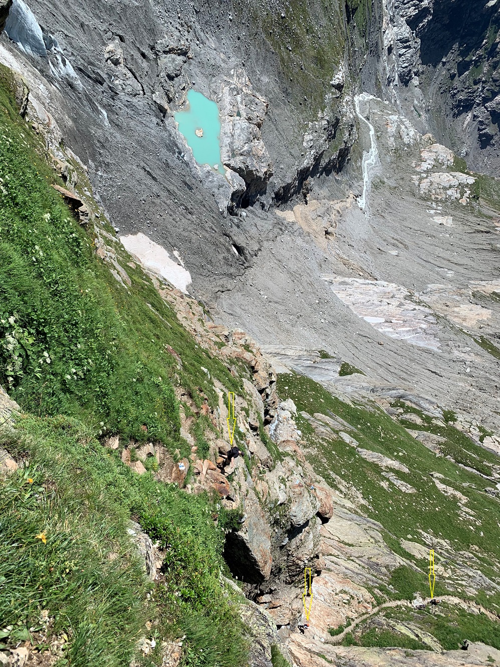 (yellow arrows pointing to the people on the path, going the other way, despite chains to hang on to, one slip/fall here has serious consequences)