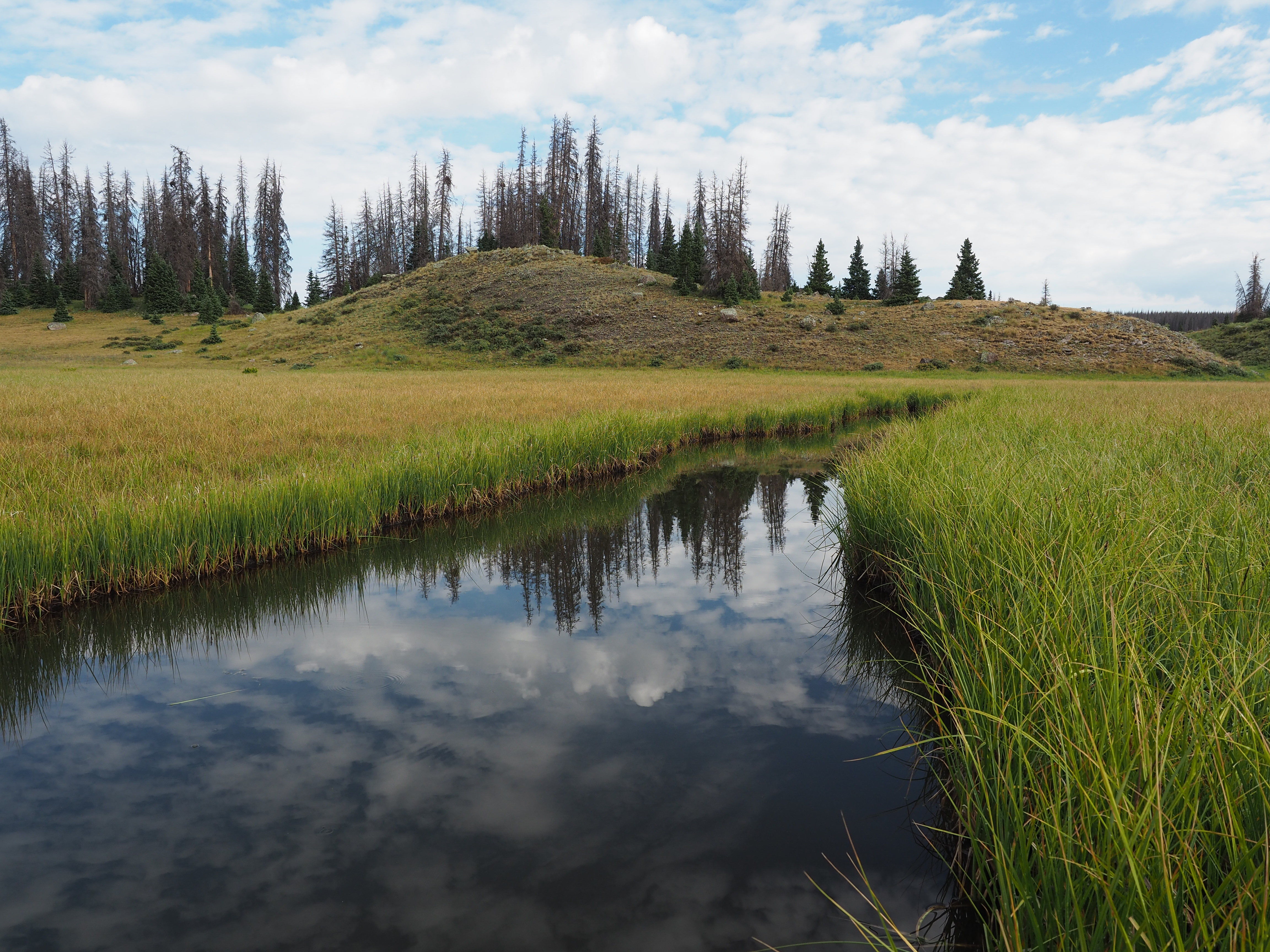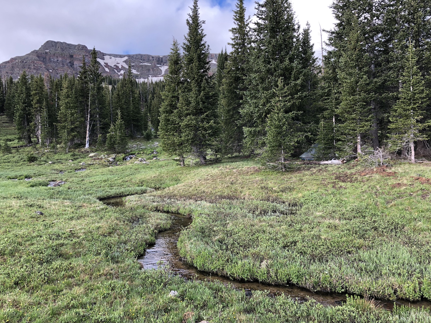 After reaching a plateau (it's not called the Flat Tops for nothing), and then crossing over a cold and snowy ridge, we descended into a huge trail-free valley and camped next to this pretty seasonal creek after the snow stopped. If you look closely, you can see the tent in the trees in the right foreground. This whole valley is just a magical place for me.