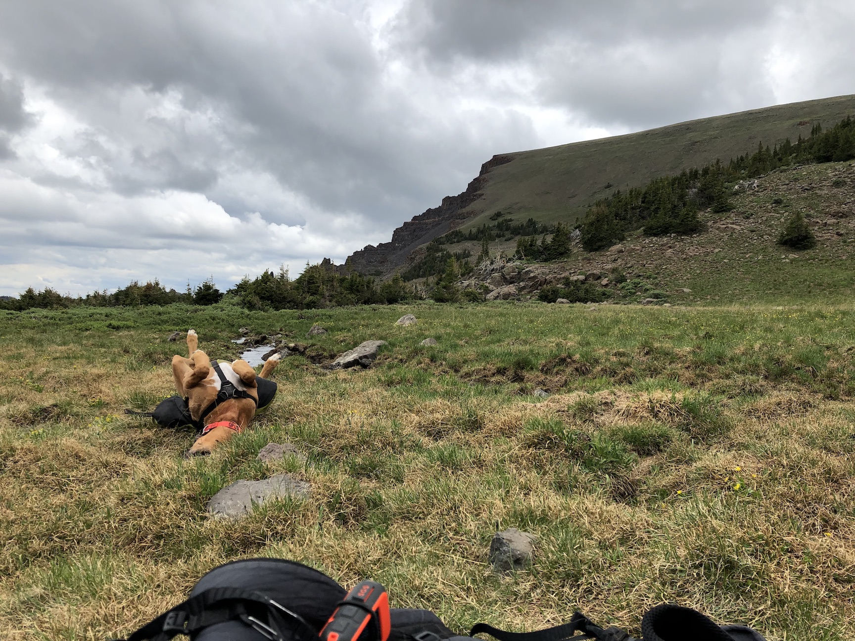 The route climbs out of the valley, navigates around a massive rocky ridgeline (shown in the background of the second photo), down into the adjacent valley and then turns back to climb towards Mandall Pass. Opus took a back-scratch break on the way up. I don't think he was rolling in anything nasty.