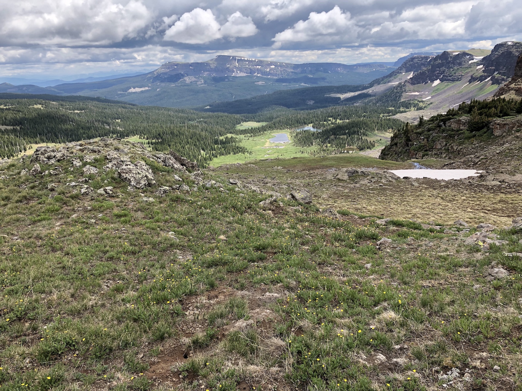 View from Mandall Pass down into the Mandall Lakes drainage with typical Flat Tops terrain in the background.