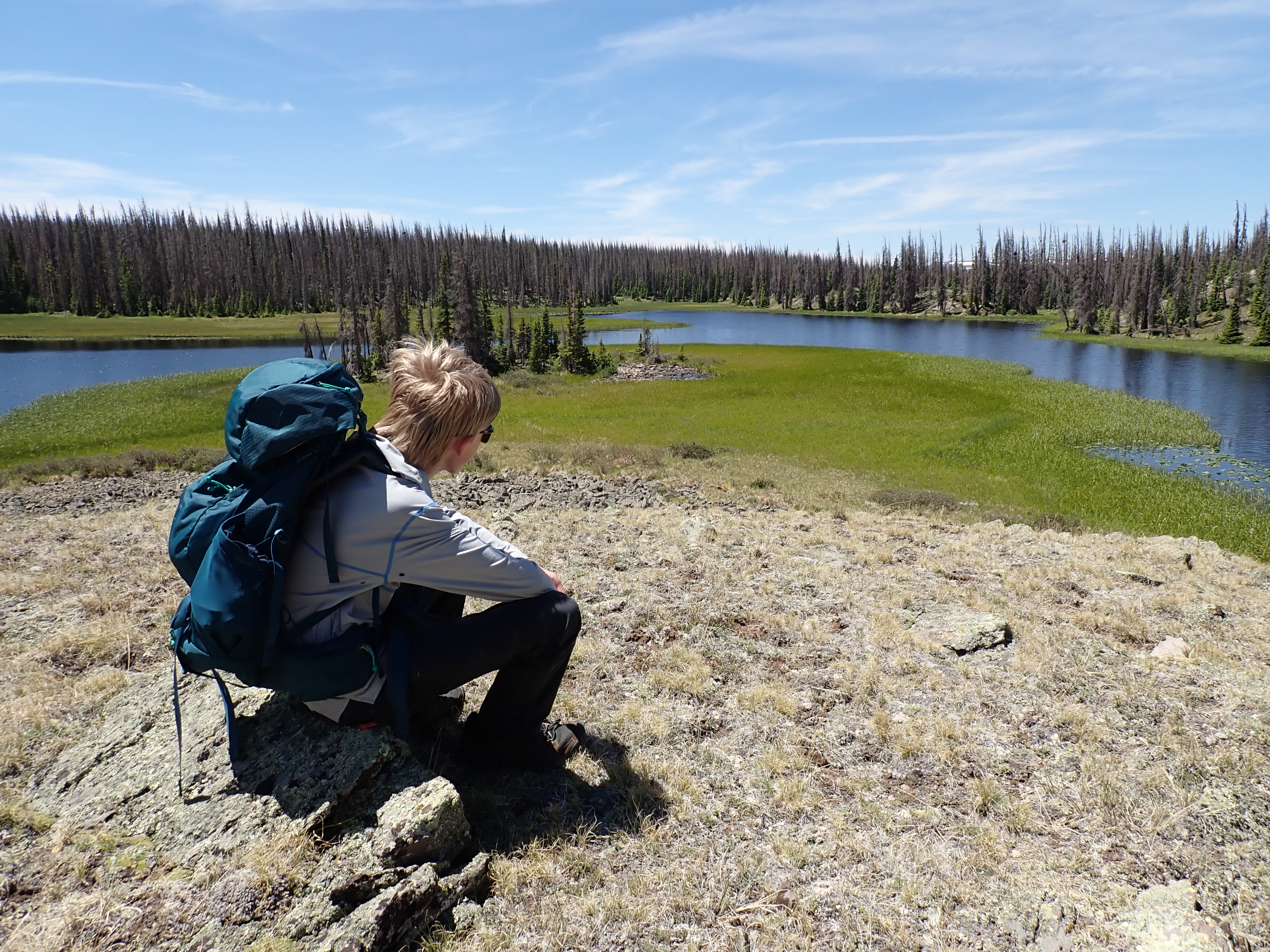This is a really enjoyable loop through an area known as the Little Flat Tops, about half off-trail, that connects the beginning and end via about 2 miles on a dirt road. I've done this trip a number of times, and as is often the case we saw nobody else for three days. The first day was not so great, in fact the temperature plummeted and we were snowed on as we crossed a ridge at about 11.5k ft ... on June 26th if you can believe it. (This is not Alaska,