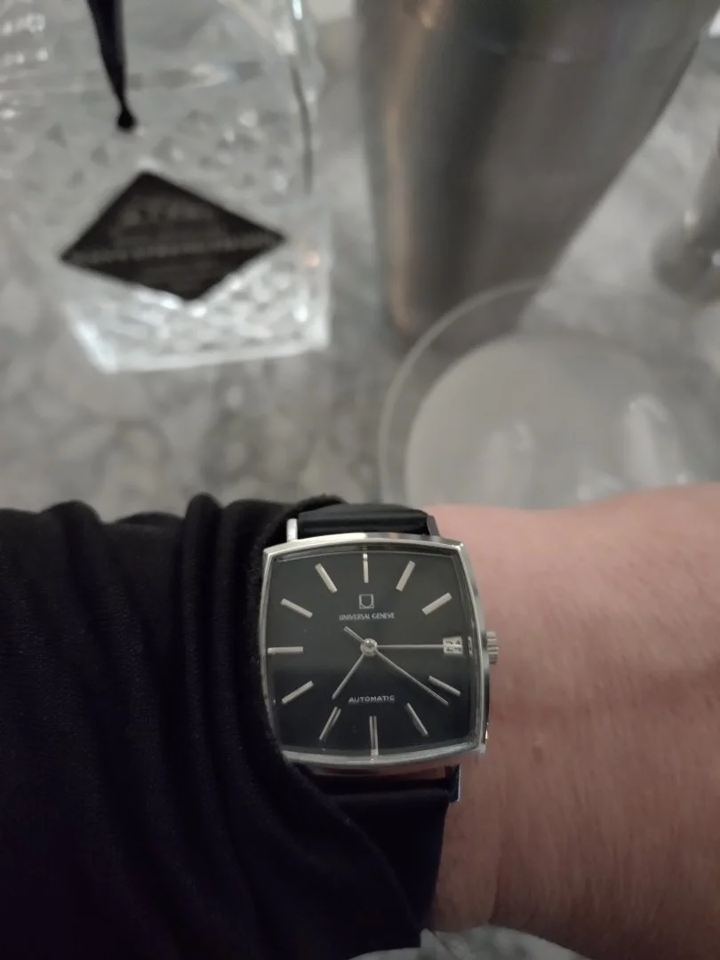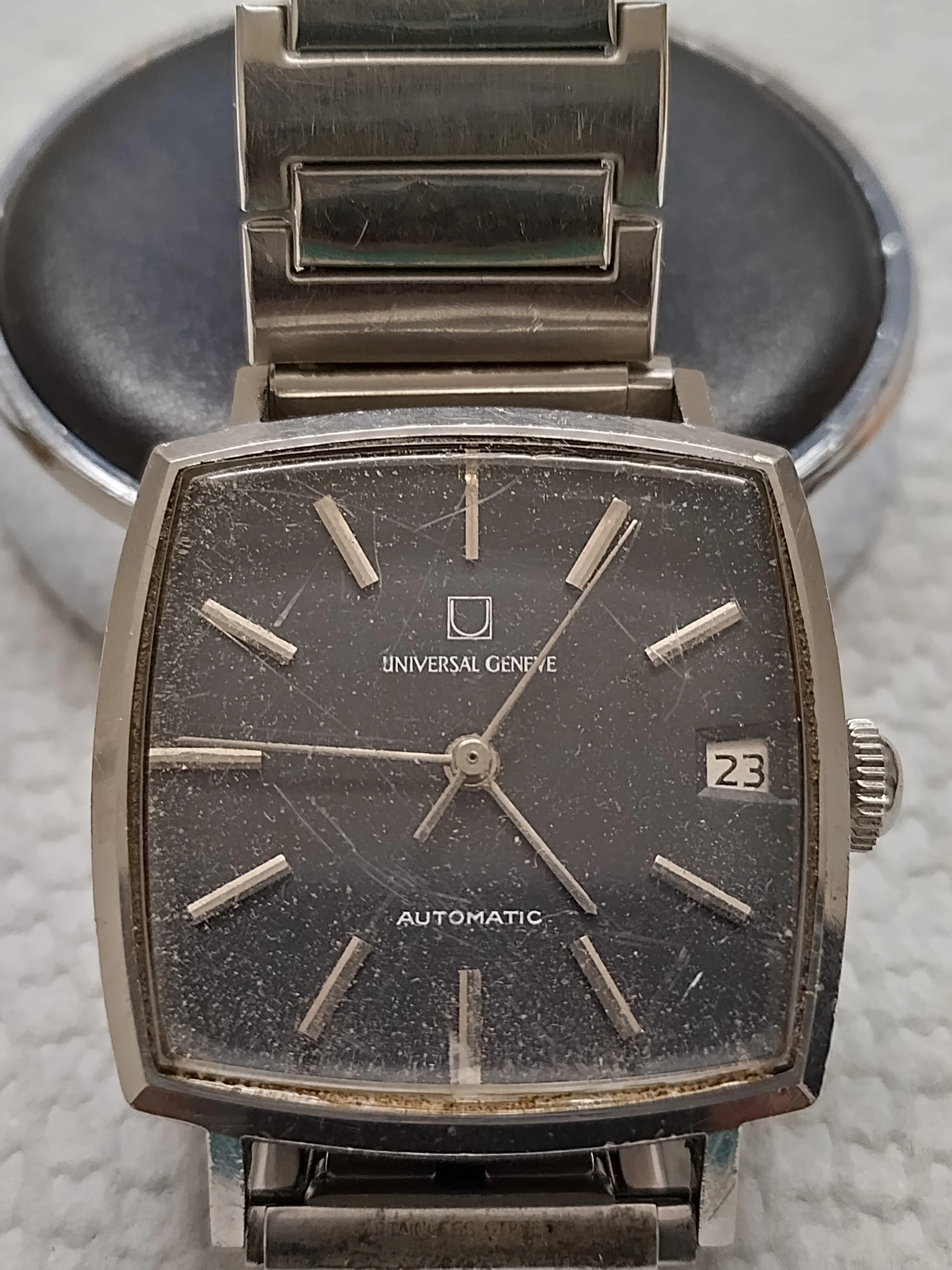 This is a dressier and square late 60s/early 70s version. It wouldn't have any water-resistance due to the snap style clam shell case and isn't marked as such. Based on 5 minutes of Top Quality Internet Research the reference and its relations was made in numerous dial/indices/case combinations and we can see variations to the earlier UG logo (the "fat U" logo on some of the comparison models was 1960-65 and followed by the thin U in the box).