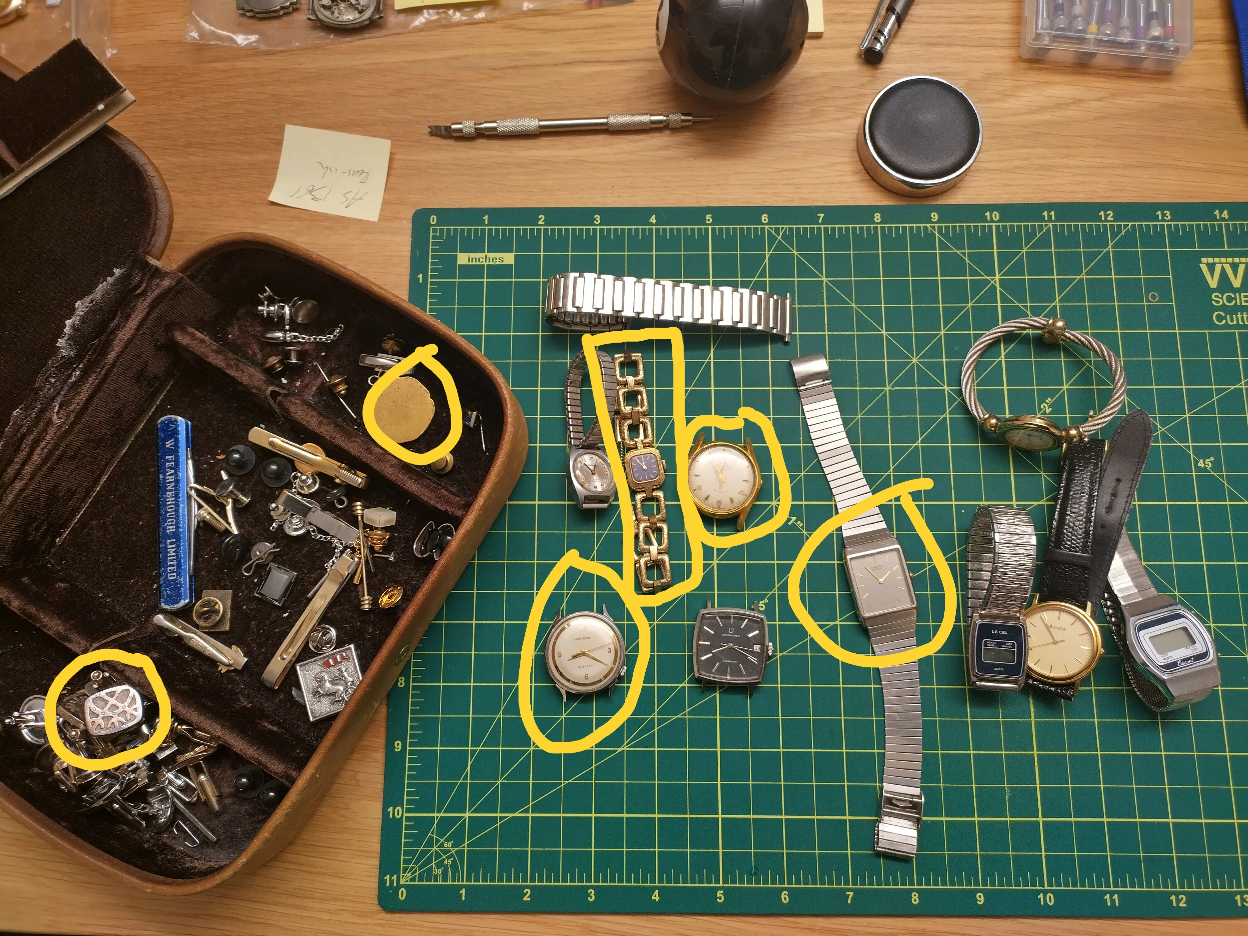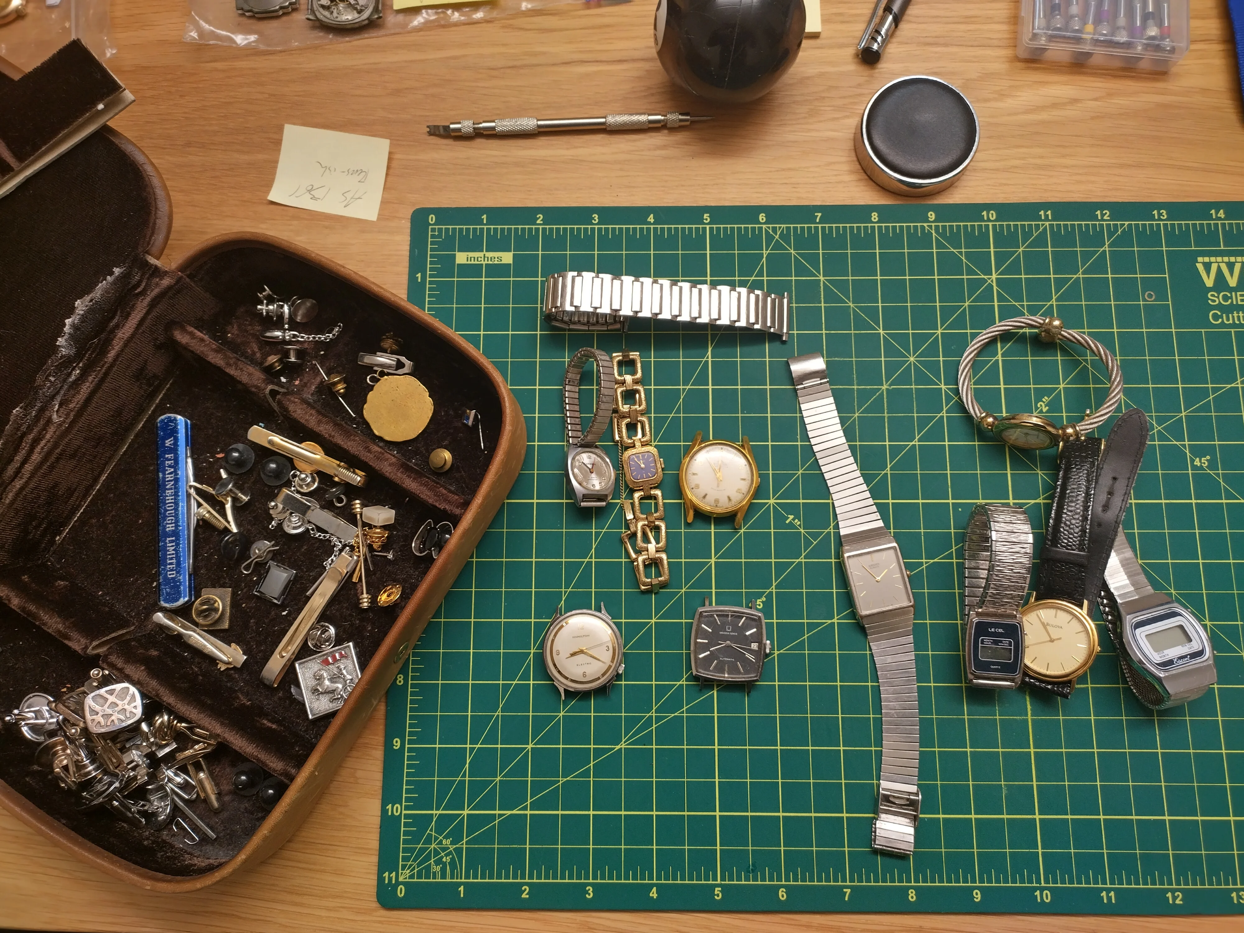 The old boy had a thing for cufflinks, tie clips (including a really cool one with a machine screw on it) and some other watches. Also included: a Hamilton Electric (505 movement) and a vintage Solar (an Eaton's house brand) with a Swiss movement (sadly not a Solar Oyster aka store-brand Rolex).