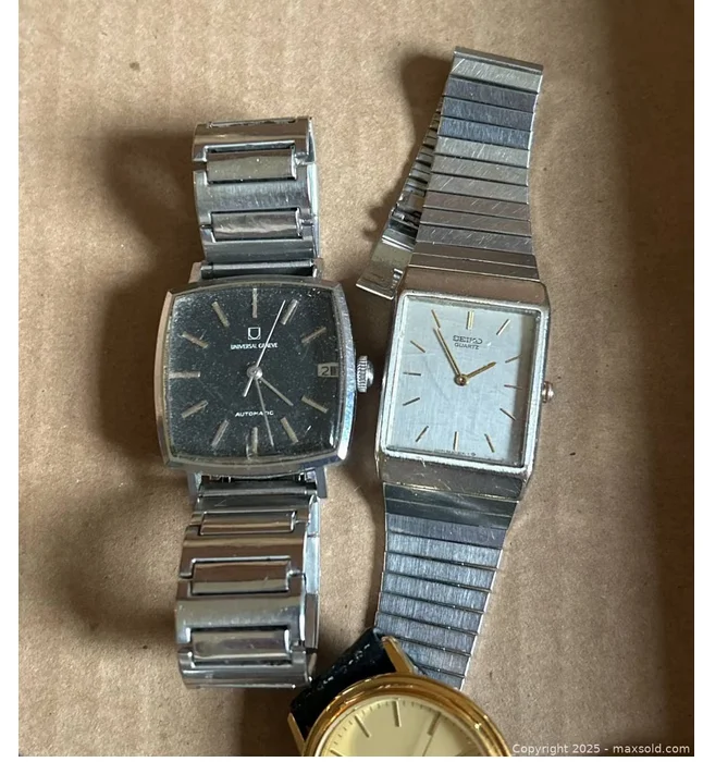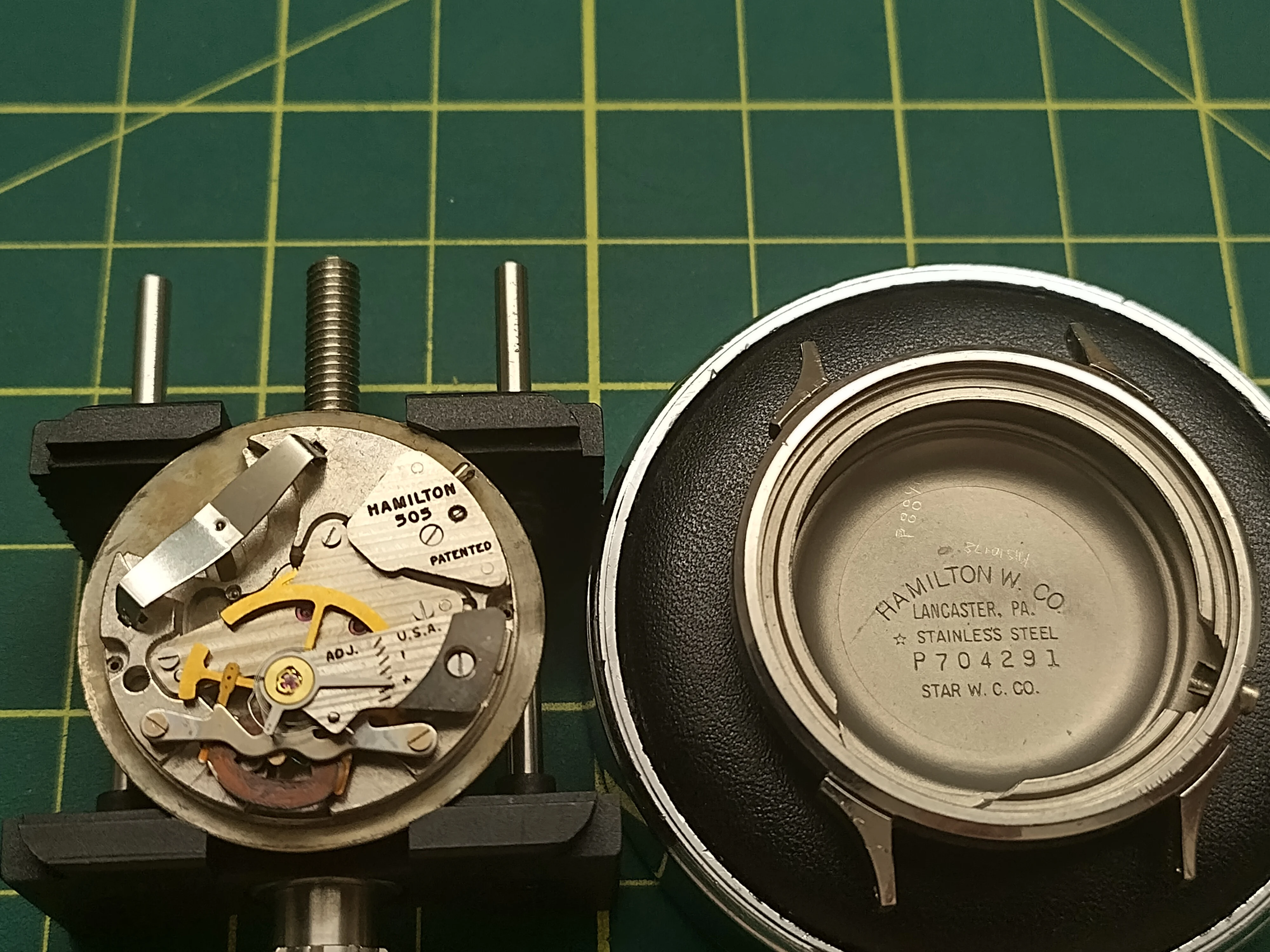 I like the estate sale "dresser top" lot. Always the possibility for something truly good lurking amongst the junk like this lot of "Men's Accessories" In the midst of all the photos, a decent shot of this watch, clearly in filthy condition with an incorrect crown. No way to tell if it was running from the other photos (top tip, always check other photos to see if the seconds has advanced).