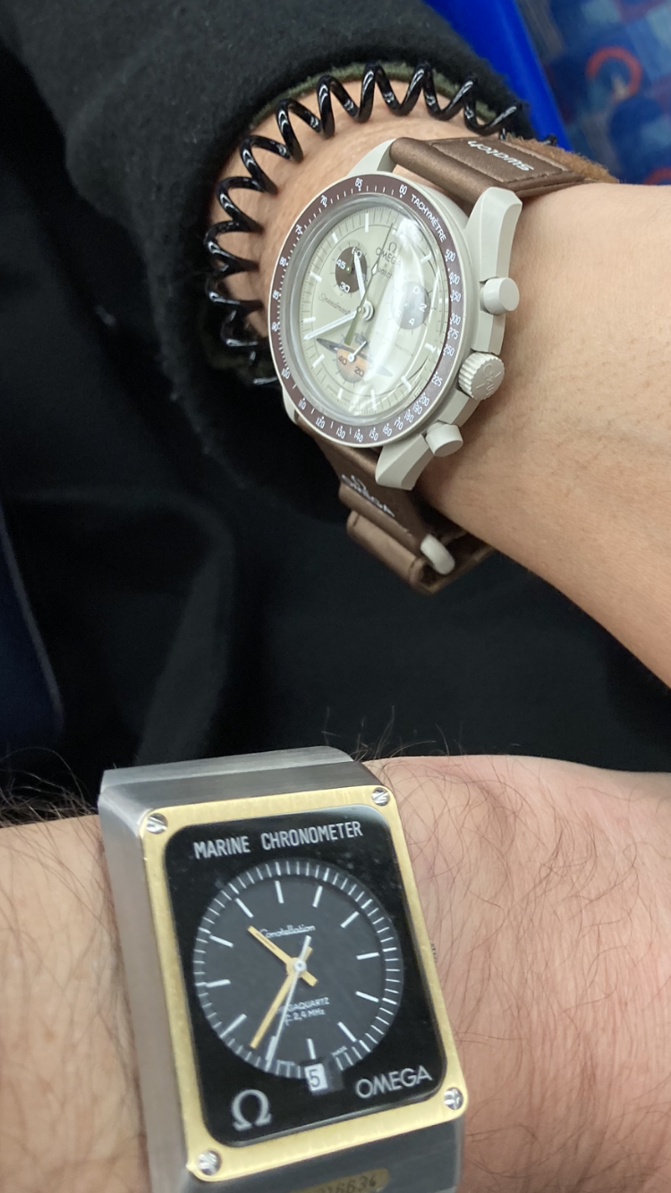 I made a flying visit to the Royal Observatory Greenwich. Home of the prime meridian and arguably the most important timepiece ever made. I thought an Omega Marine Chronometer was apt for the visit. I did not have much time (a bit ironic) so only saw a fraction of what the location has to offer. Certainly, it is well worth a visit. On route I persuaded a young lady on the tube to allow a quick wrist watch check to show off her Saturn Moonswatch which was looking very cool. It is nice to see new and younger people being hooked into the Moonwatch story in my view. It must have been ladies day as on the way back on older lady was sporting a rather nice Santos and she also obliged a quick wrist watch check with me. I did pop in to the Omega boutique at the Royal Exchange which for reasons I wont bore you with was a soul destroying experience. I will stick with my AD I think. I also tried swatch for a Moonswatch (again :0)….. no room at the inn, apparently, they get a couple of Moonswatch in every few days but never know what or when. That is wearing a bit thin for what it is. Still all in all a very enjoyable day in the smoke and nice to see the Harrison timepiece collection. It was also interesting to see how Quartz timekeeping evolved. Looking at the Omega MC compared to earlier efforts I am glad that enjoyed similar development path in terms of size and weight.