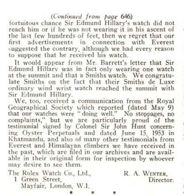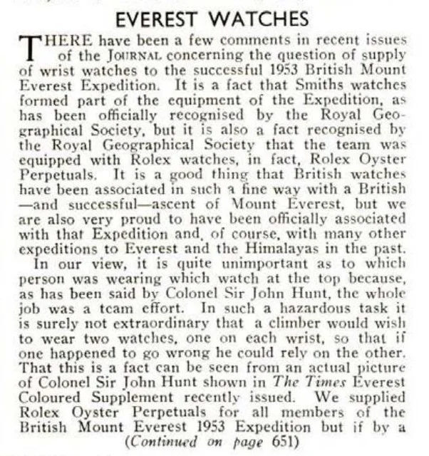 While I’m not here to debate whether Smiths was truly the only watch on Hillary’s ascent to the top of Everest or not, there were two letters of note. One from Smiths (D.W. Barrett, the then-managing director of Smiths Clocks and Watches, as recorded in the September letters page) and one from the managing director of Rolex (taken from page 651 of the October '53 edition of The BHI Horological Journal).