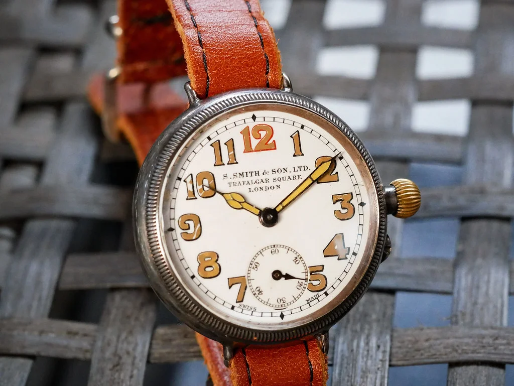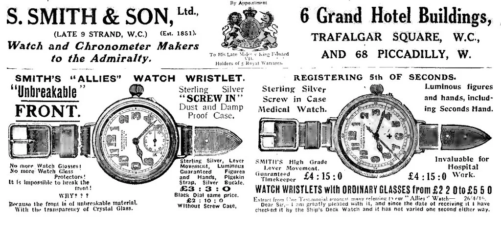 Per the caseback hallmarks, it seems this watch was assayed in London, imported by George Stockwell, and - most importantly - made in 1915. Not only did all these hallmarks coincide with Mallory’s watch, but, as a milwatch enthusiast, that also really got me excited. I had, in my hands, a Smiths “Allies watch”. Issued during the Great War and most likely bought to be used on the field. Here’s an advert of such a watch.
