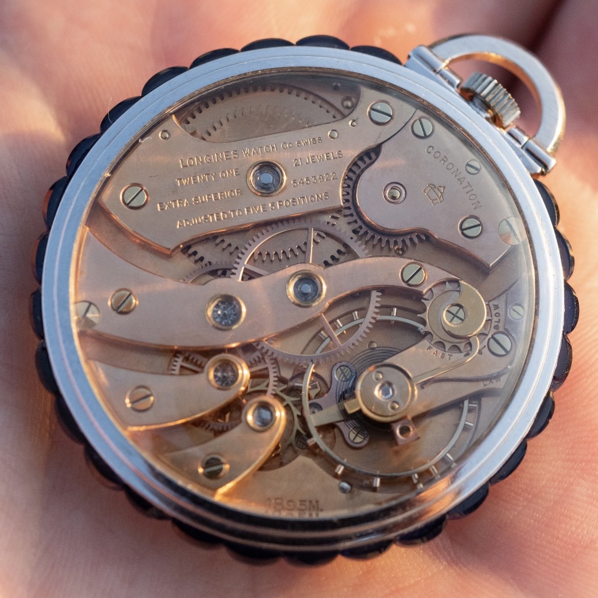 -The star of the show is the movement, of course. The general architecture is that of a 17.95M but we have 5 adjustments, an “Extra Superior” designation, and what appears to be diamond or clear sapphire jewelling (right down to the pallet stones!) and what I’m assuming (but not certain) is rose gold plate on… well, everything. Interestingly, the Archive response that was shared with me by the auction house fails to mention ANY of the bling, and identifies the movement only as a 17.95M, vs. the 18.95M it is stamped with. Googling around, it appears that 18.95M was the “extra superior” version of the 17.95M.