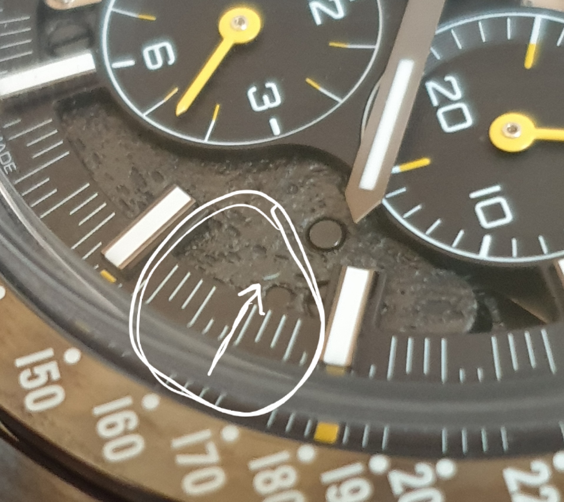 ·Hello guys, new to the forum and glad to join it! I purchased a speed master (Apollo 8) 2 days back. Today while I was looking at the time, my eyes went to a spot were I thought it is a fine hair like structure on the dial. After inspection, it appears to be an engraving and not a hair-like structure.