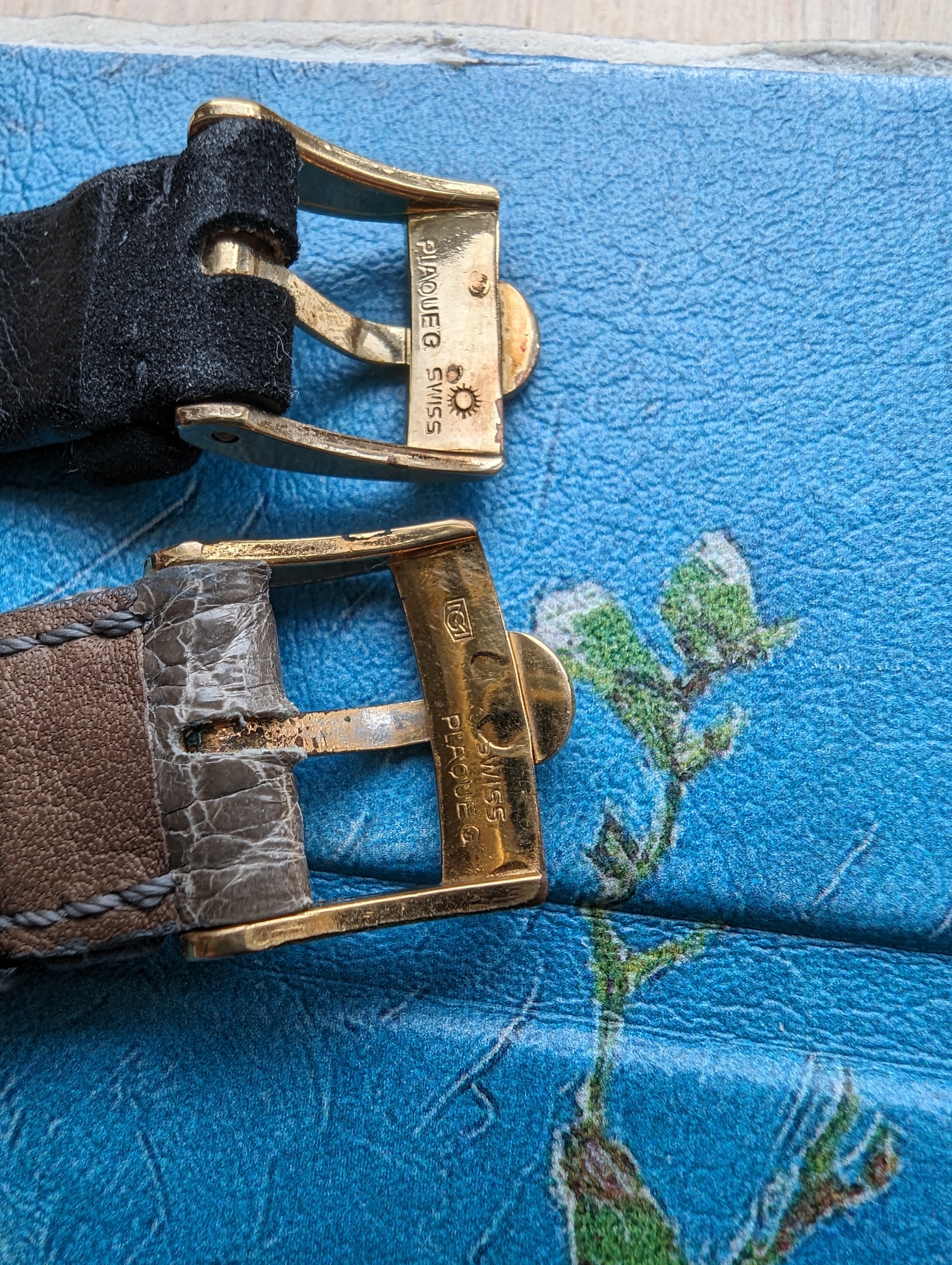 A very rare 18 mm gold-plated buckle by AW. (Below the 16 mm GM. )