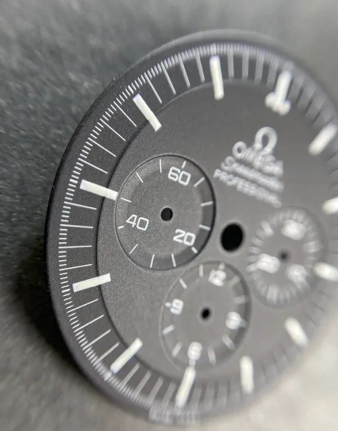 I’ve recently seen photos online of what appears to be a stepped dial (step dial) for the Omega Speedmaster Professional 145.022, with the service part number 064PP3052001. This is surprising, since most sources say modern Omega service dials for the 861/1861 are flat, not stepped.