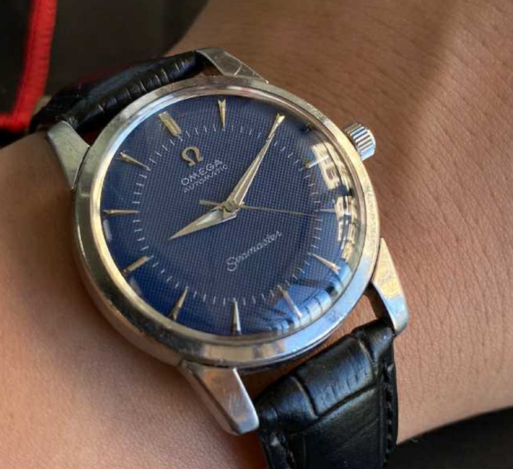 Its redial for sure ... i also believe that omega never made any blue dial on this 50* series..crown also not matching one.case not in good condition..in my opinion it should not cost more than 350-400..other's opinion may differ