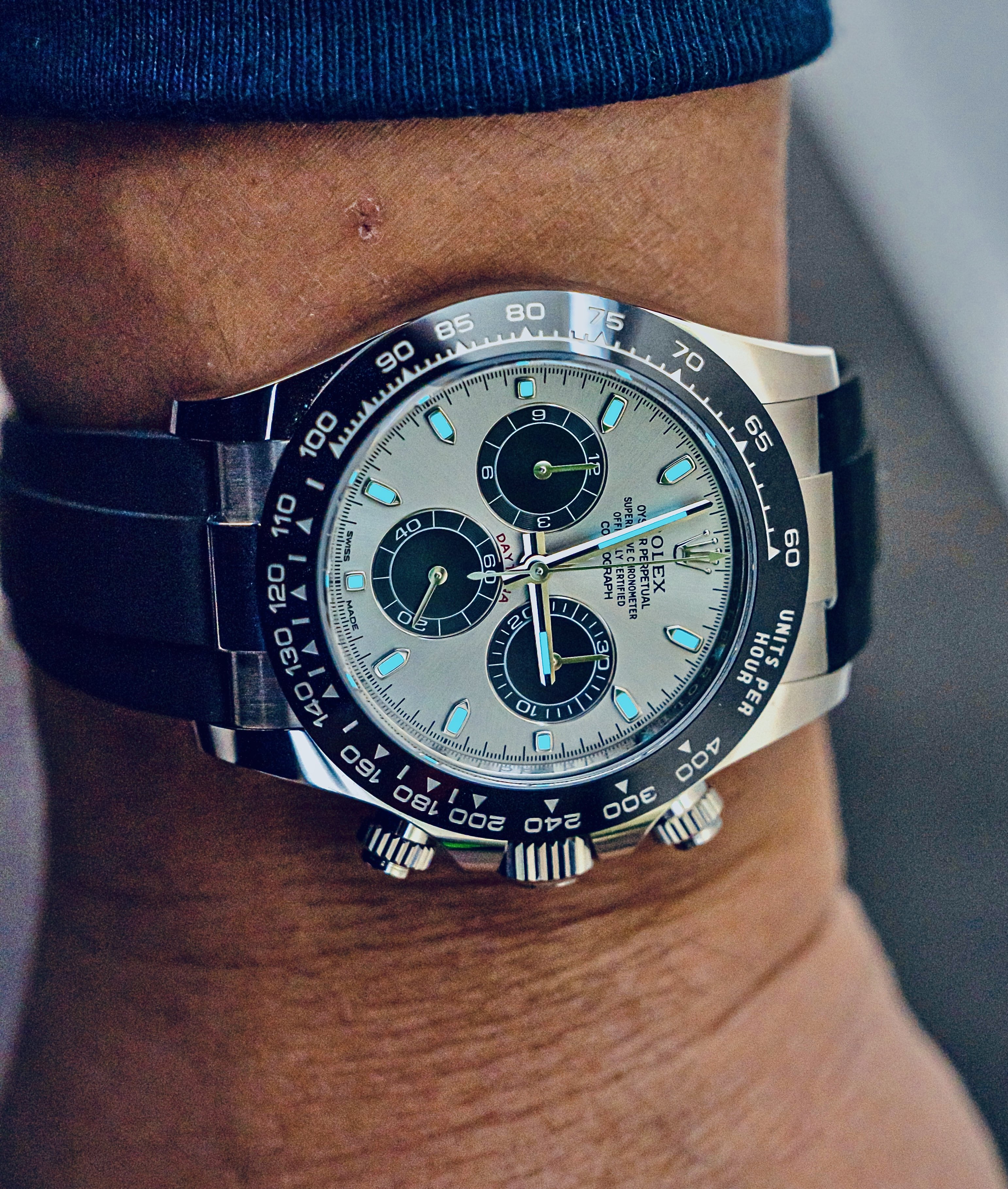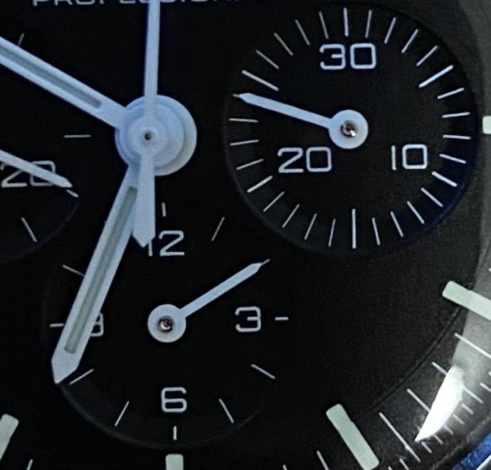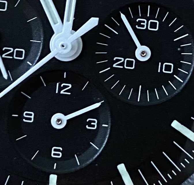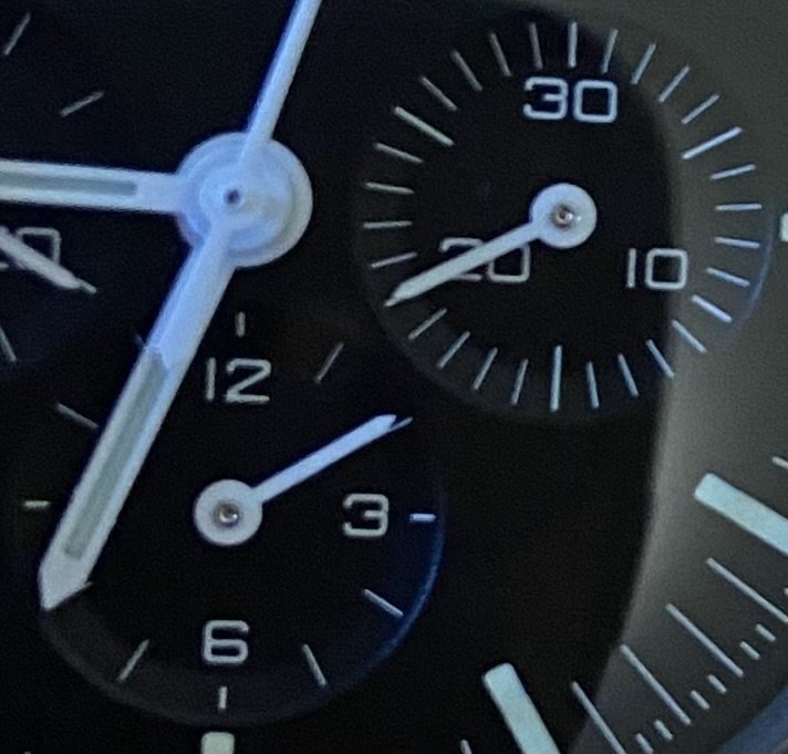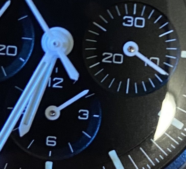 So there's that with mine to start with but it's a little hard to gauge because of the tail of the Tachymeter hand obscuring the view. Then when I press the button to start the Tachymeter it seems like the Hour register hand jumps ahead a fraction further but that could be a figment of my imagination when all things are considered.