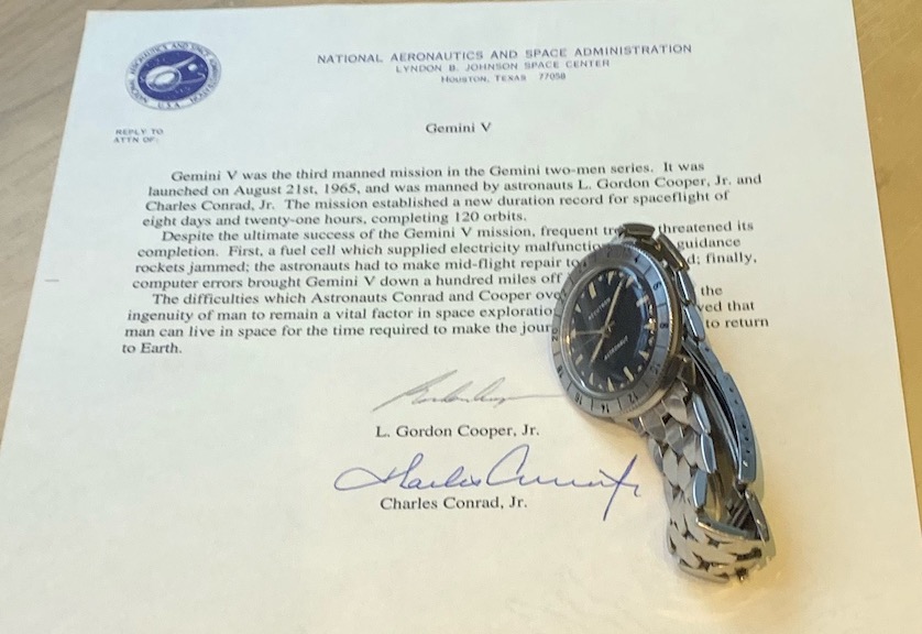 It's been said that there were between 500 and 1200 of these, based on extant serial numbers. So not many. Plus how many from 1962 are still around? The prices of these don't reflect the scarcity or the significance. The Bulova Accutron Astronaut watch itself is a pretty marvelous watch in the whole space history world. This 1962 is amazing because it's before Bulova knew that pilots were wearing their watches in the outer atomosphere, after which they added the "Astronaut" on the dial late in 62 and 63. Kindof like Omega finding out that their Speedmasters were being worn in space.