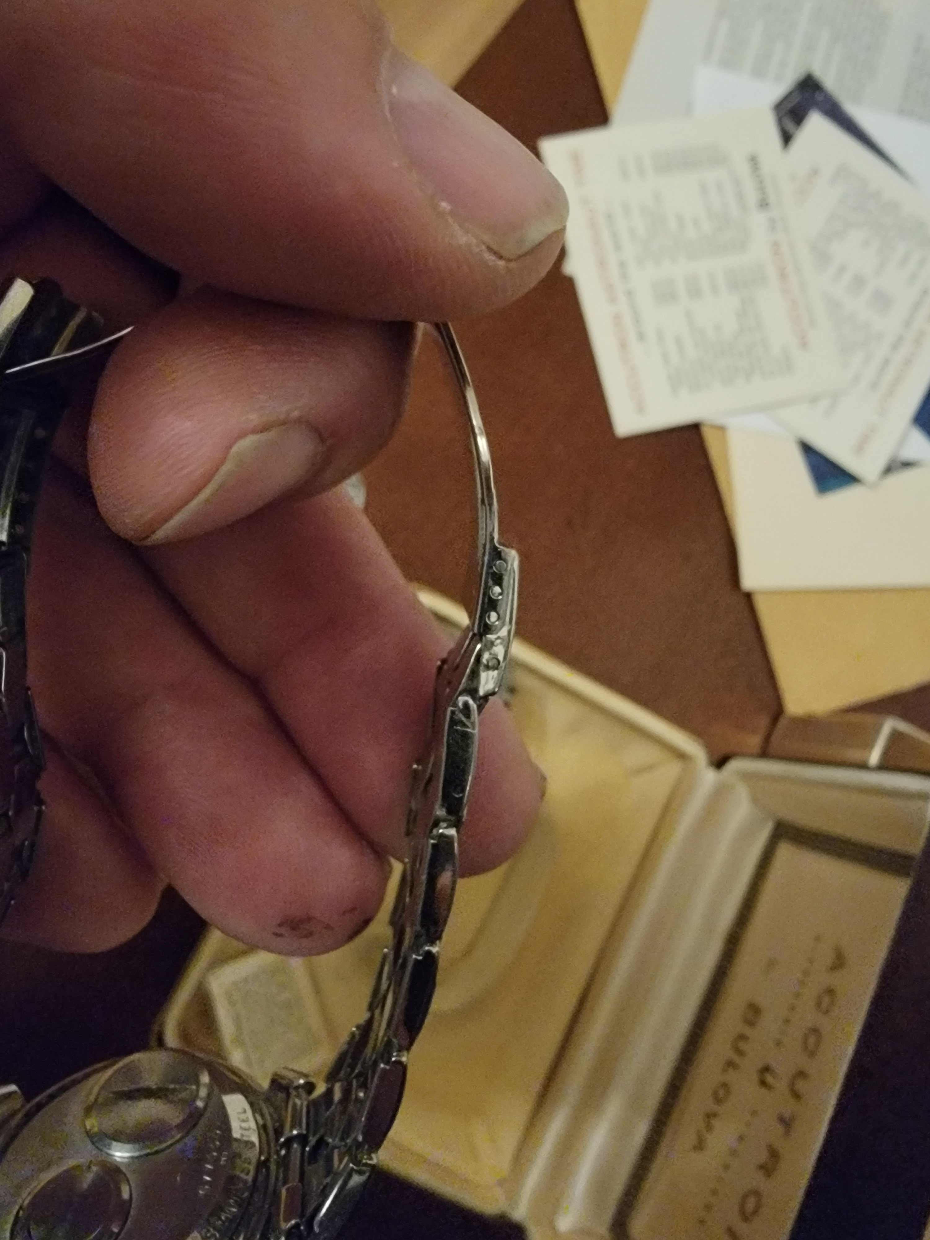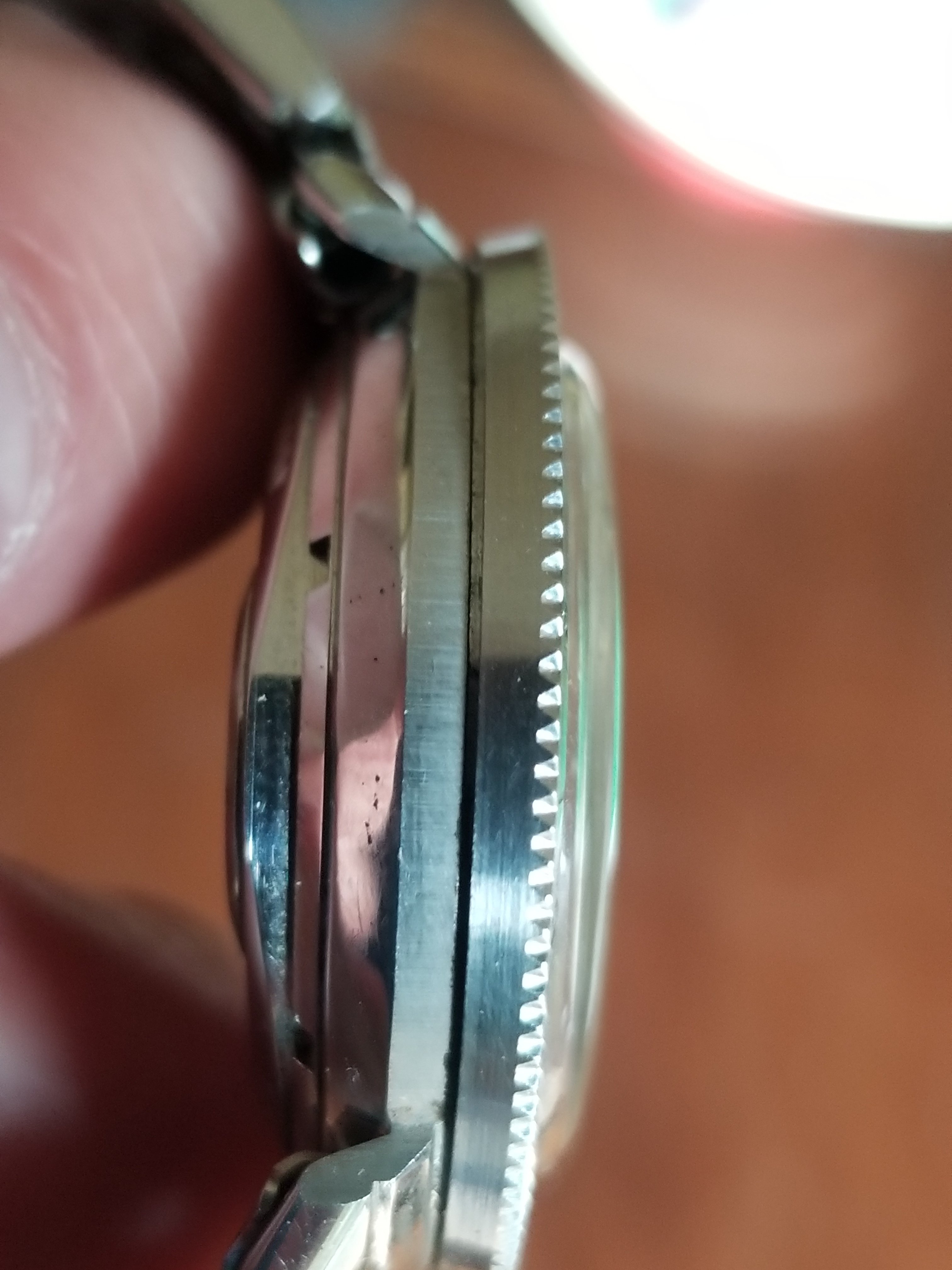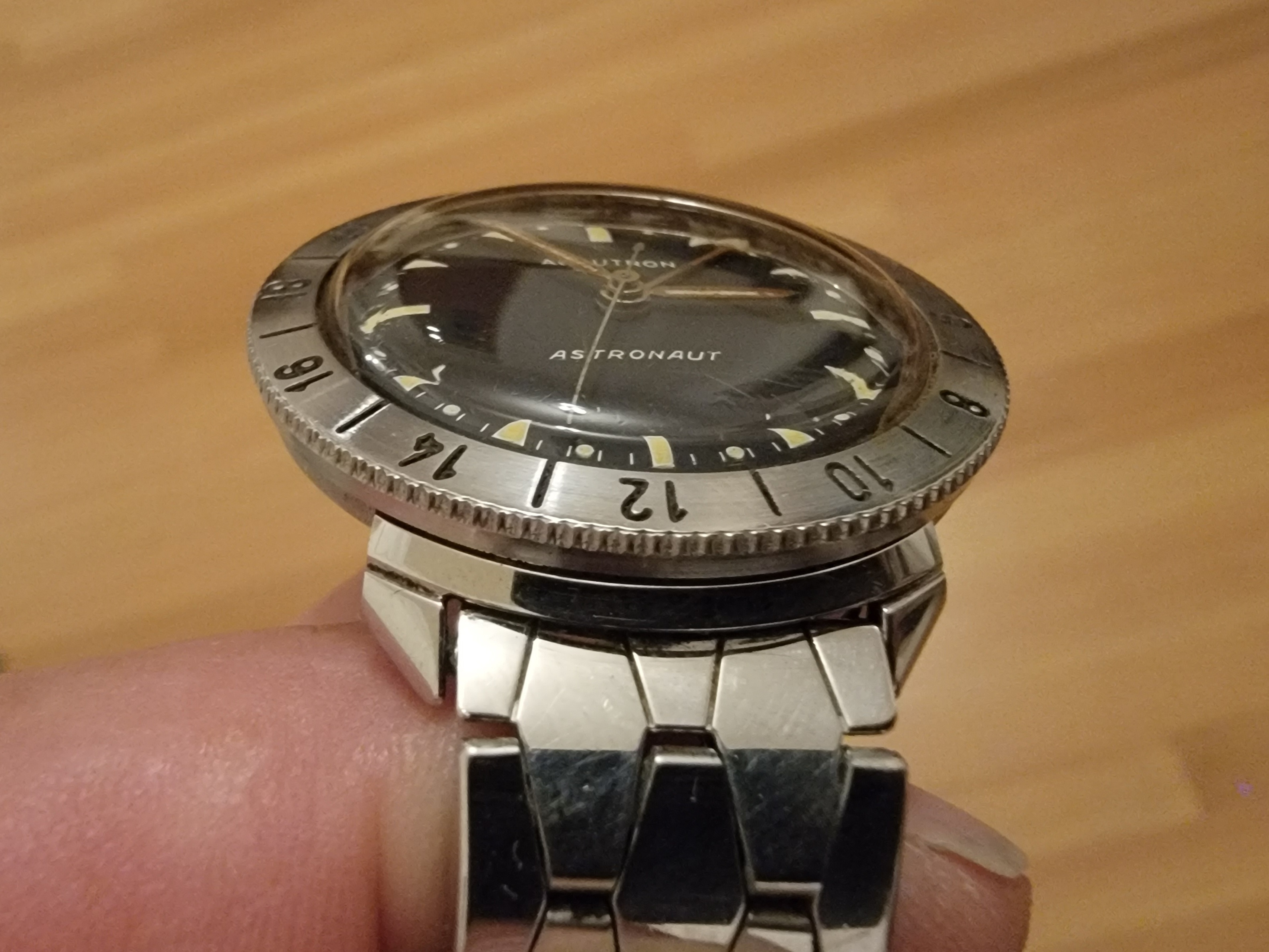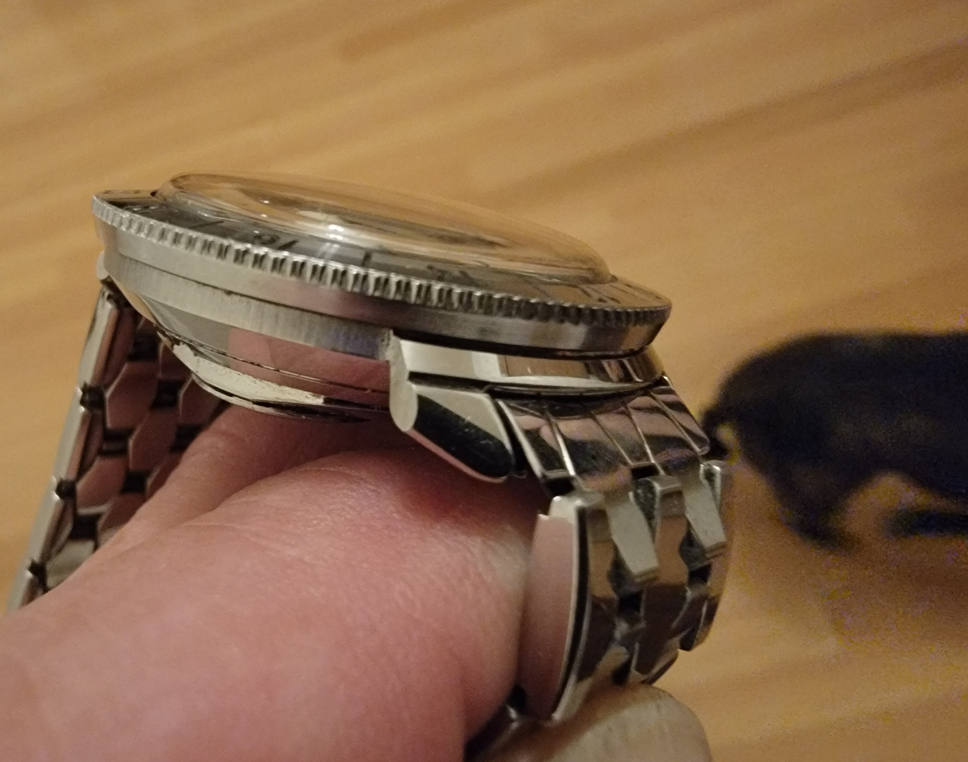This just arrived today. It's taken a long time to get here. It is not working (yet) so I will need to send it out for service. But it looks unworn. Look at the brushing in the case side and caseback. This is before any cleaning, right out of the barn so to speak.