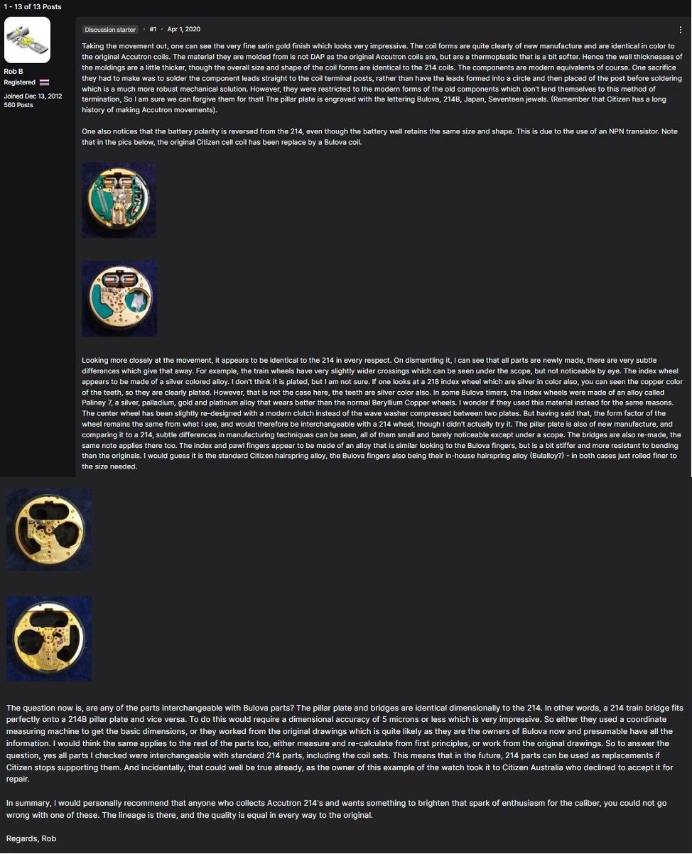 ·I had a 50th Anniversary Bulova Accutron Spaceview come my way for assessment, today. Limited edition # 9xx/1,000. Price on the tag was $4,000.00, but in whose currency, I don’t know. The movement showed some differences to the 214, but one of the most notable differences was that the movement is marked Made in Japan! I know Bulova is now owned by Citizen, so I shouldn’t have been surprised that this one was made in Japan. This one came to me without a cell. The cell cavity is marked on the floor, indicating a negative ground which differs to the Swiss Accutron. I tried a new cell with both polarities, and the circuit seems to indicate it is kaput. I have read elsewhere that the watch must go to Japan for service, as service centres turn them down. From what I have read, many of the parts in the 214B are not NOS, but of new manufacture. I have also read that Japan will not service these! A disappointment for the owner, I’m certain.