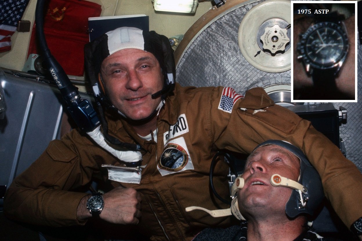 In July 1975, Stafford was commander of the historic ASTP Apollo-Soyuz Test Project mission, linking up for 47 hours with a Soviet-Russian Soyuz spacecraft of Alexei Leonov and Valeri Kubasov. In total, Thomas Stafford had worn five different NASA Omega Speedmaster chronographs, four of which effectively used during four spaceflight missions.