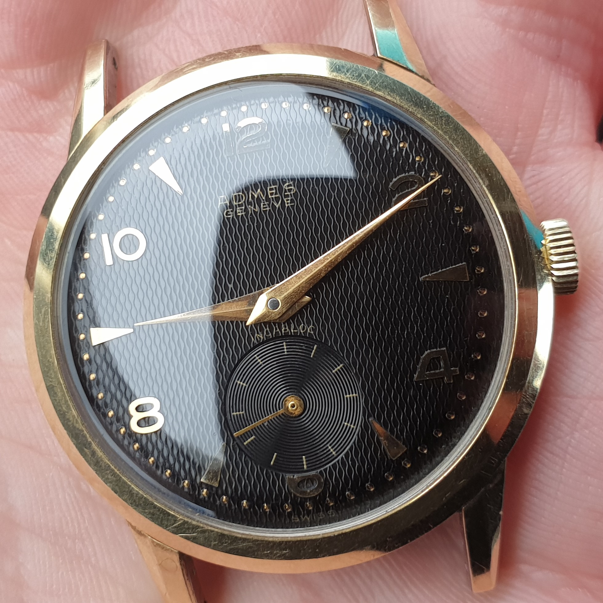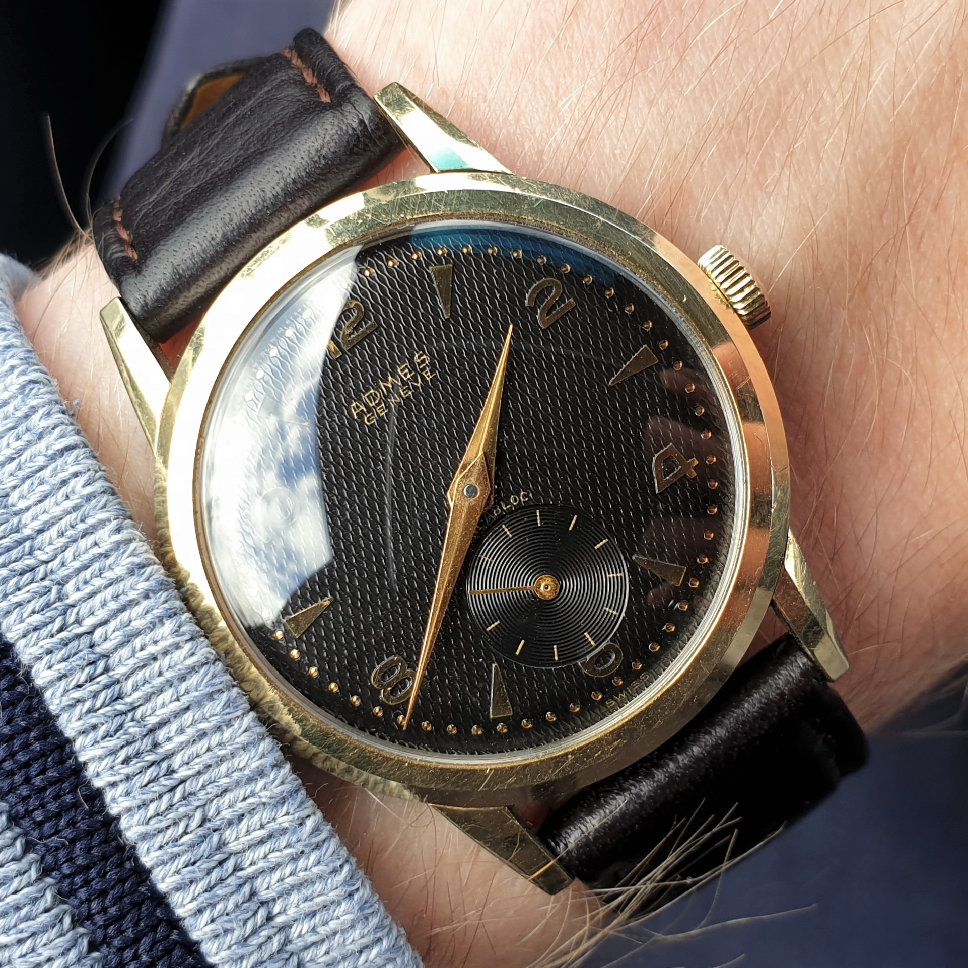 I acquired this watch earlier today at a watch convention in The Netherlands. I didn't know the brand, it just caught my eye and I decided to buy it based on its quality, which I could tell from the naked eye. It features a stainless steel gold capped case, a screw down caseback and it houses an ETA cal. 1124 movement.