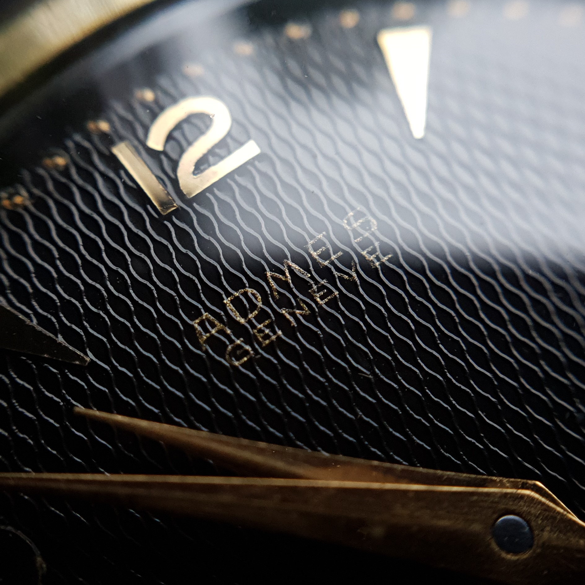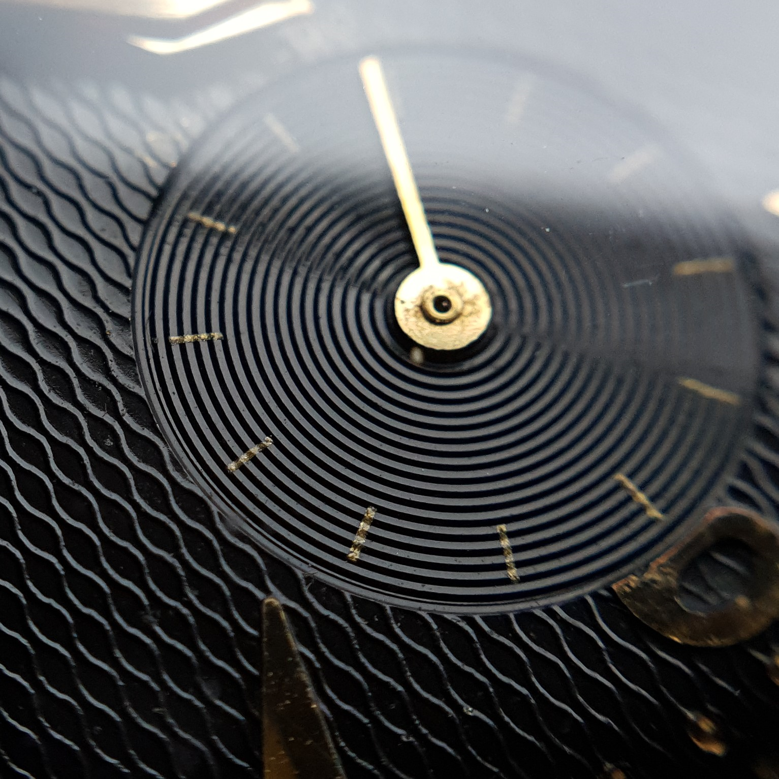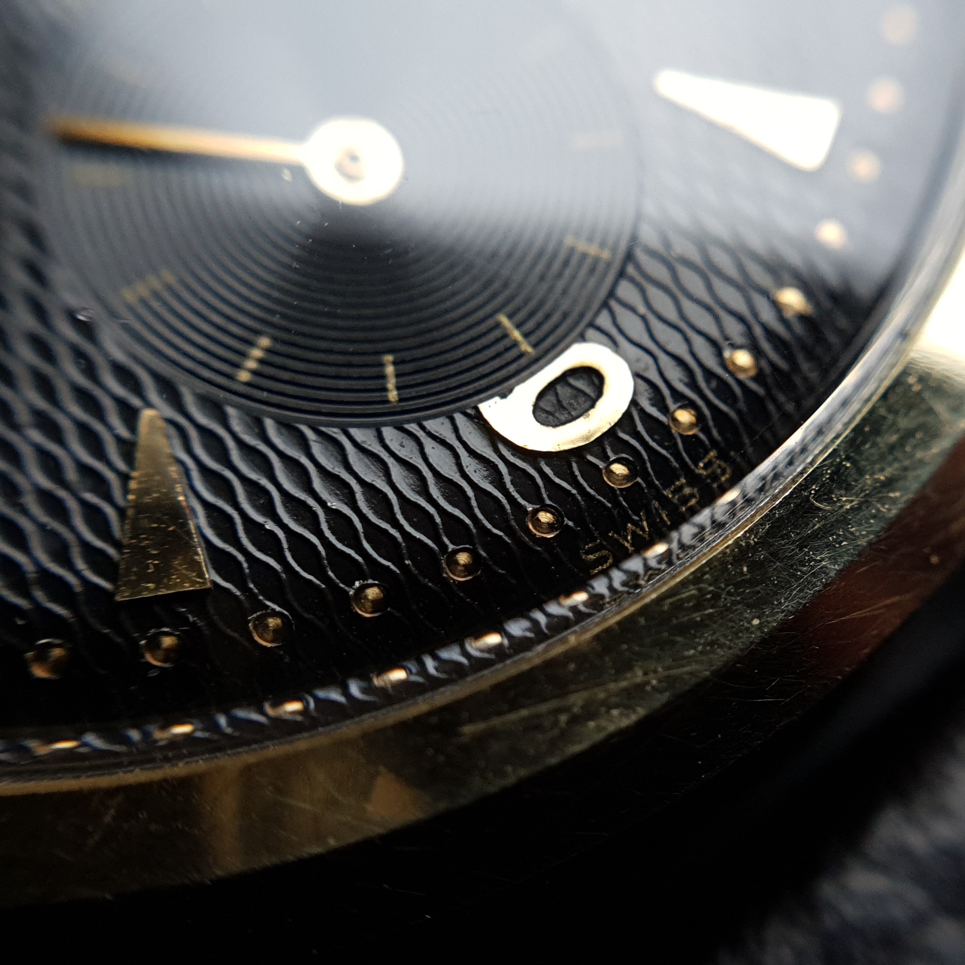 All in all it's in remarkable condition with no wear (only some minor scratching, which is to be expected) to the gold cap and a - dare I say it - a mint condition gilt dial. The dial pattern is remarkable. It's not waffle, it's not honeycomb ... I'm not sure what to call it. Any suggestions?