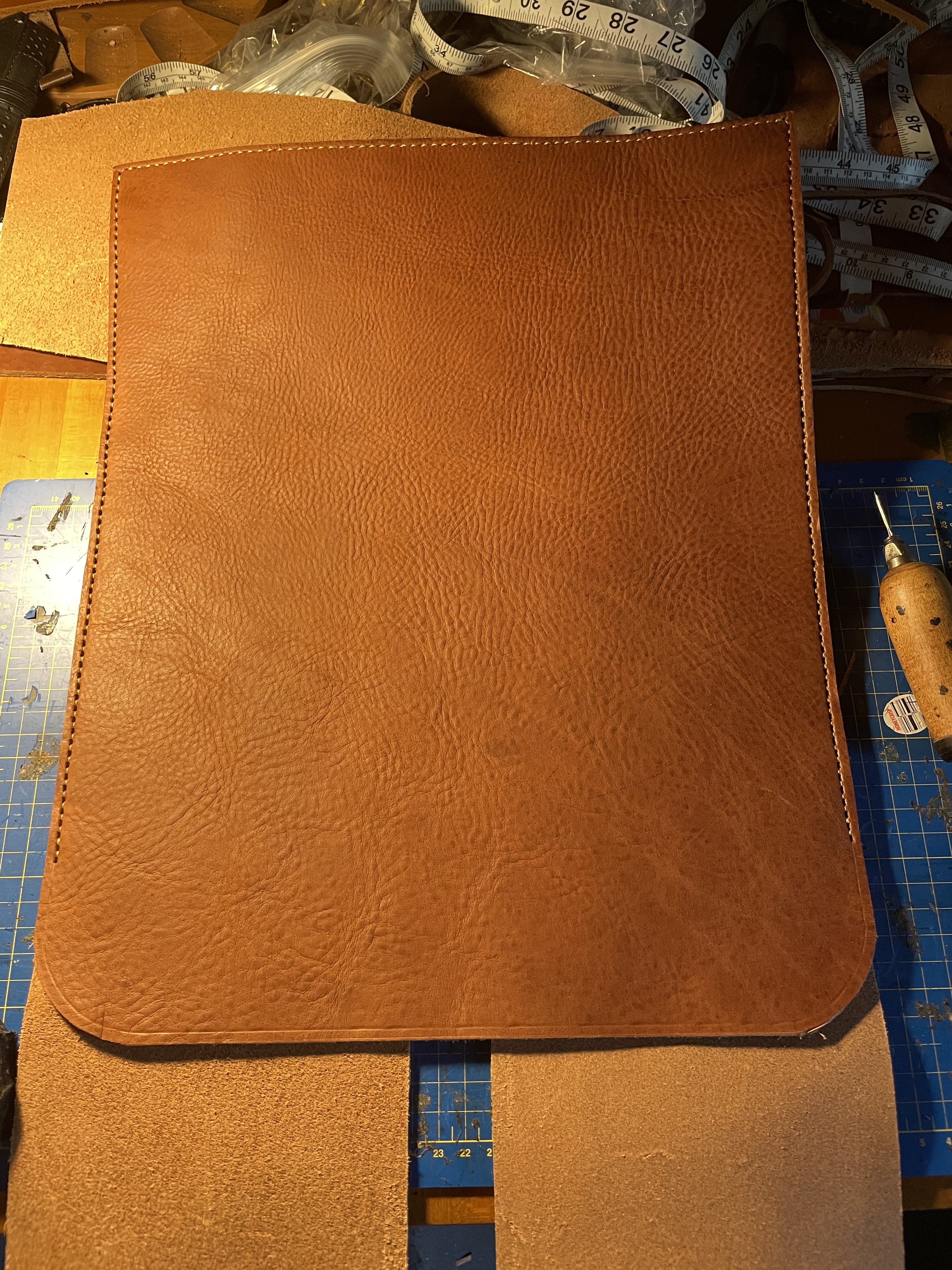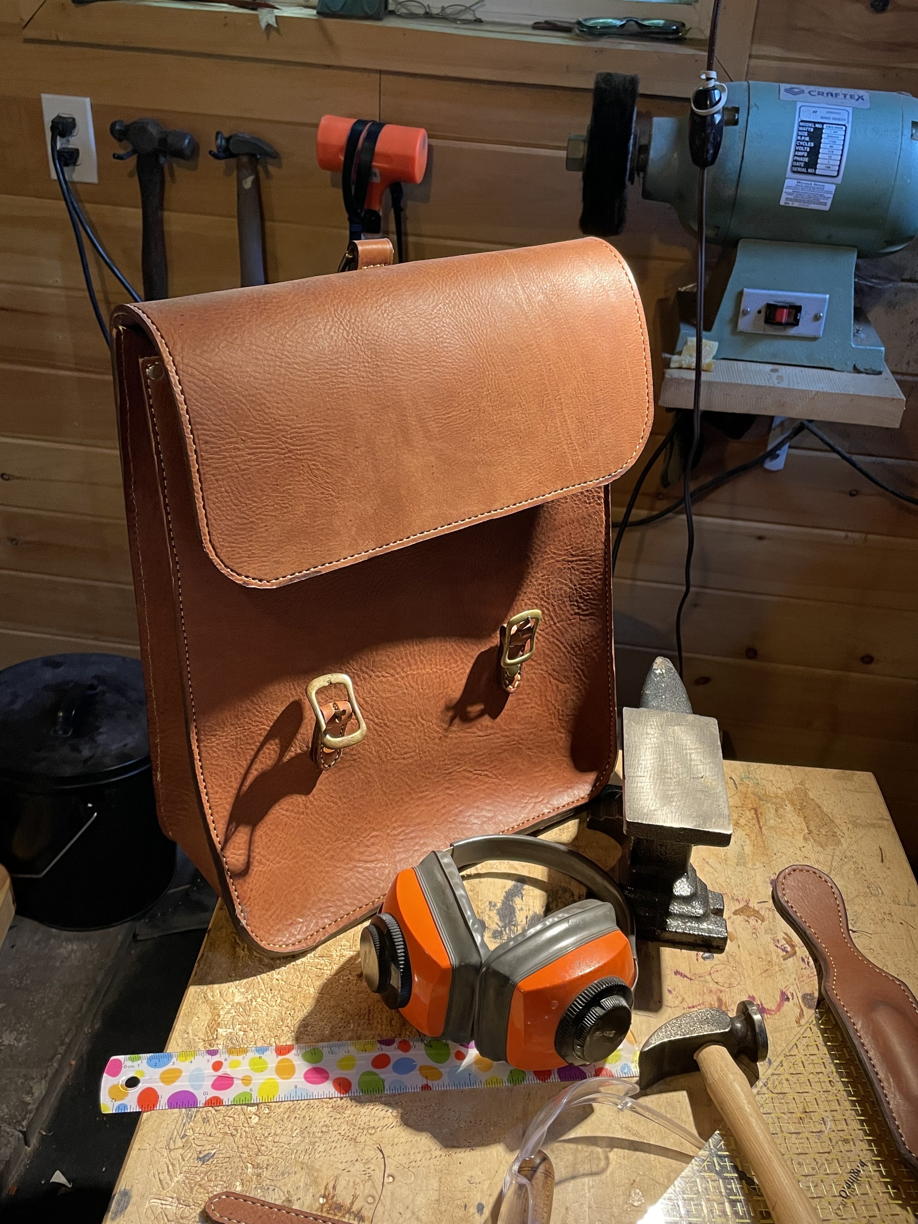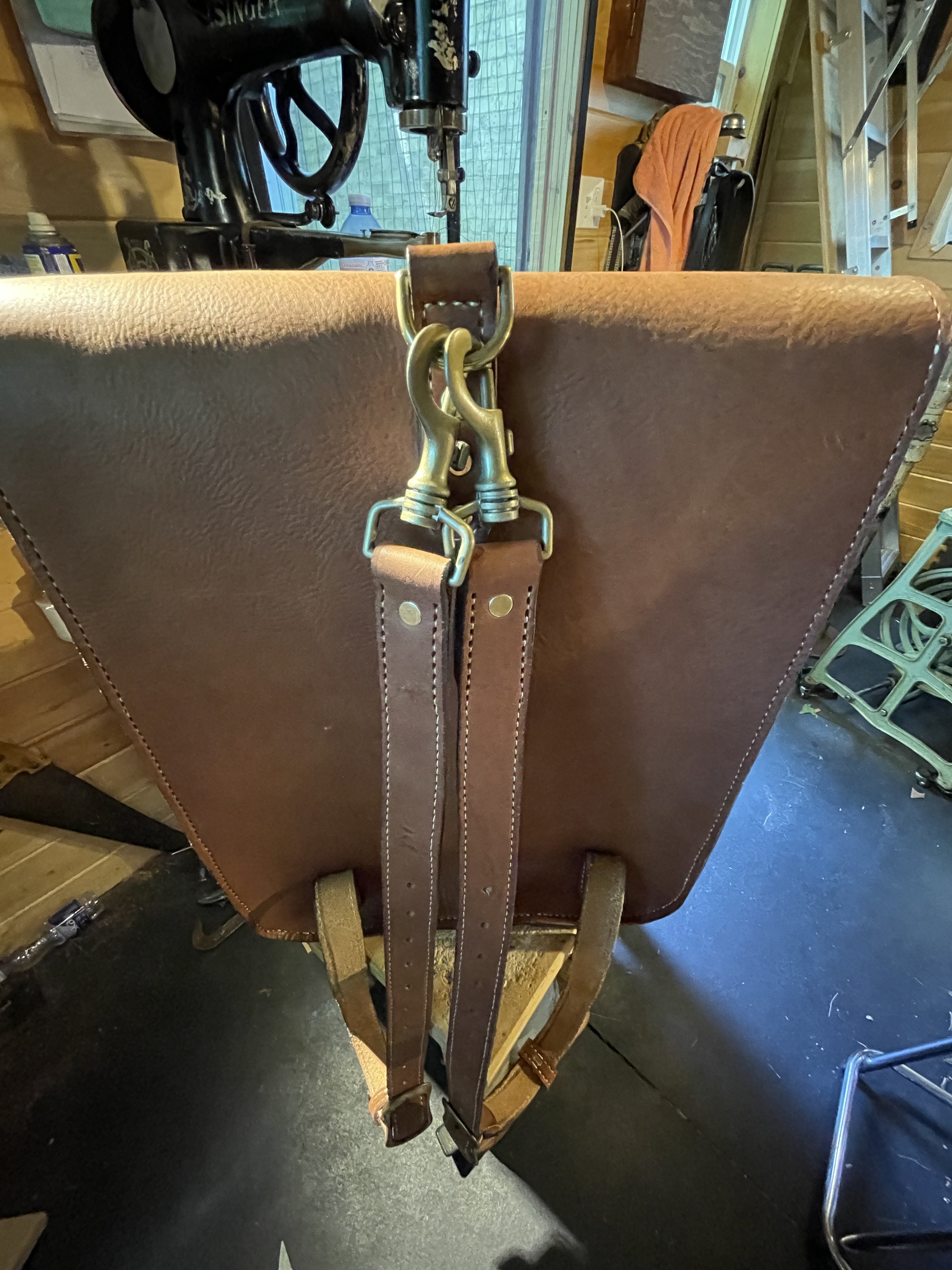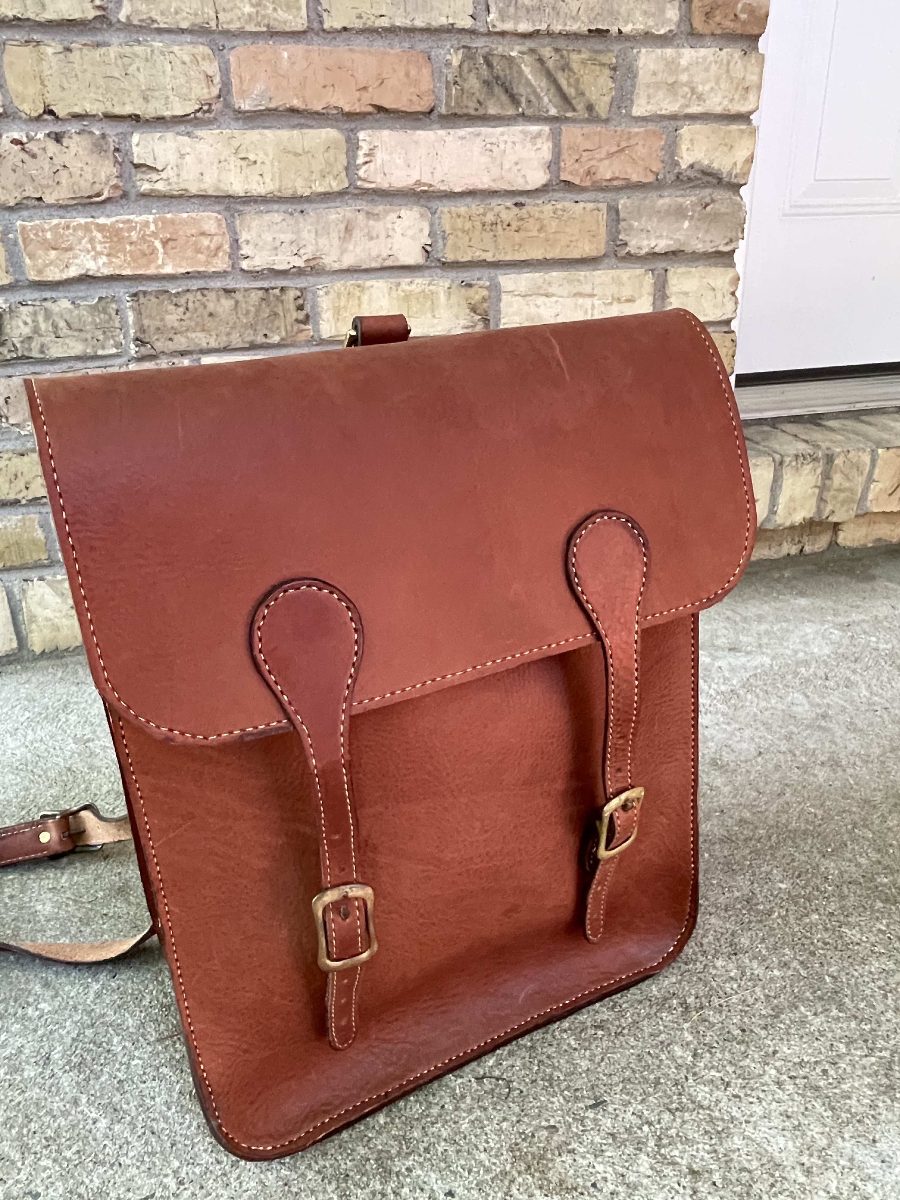Fred, I made a similar one in 2018 and used an old kids backpack for reference. They were like cardboard back then. I made it with much better leather. It’s about 14 inches wide by about 18 high, I think. I took the original one on my recent road trip and my friend wanted one. For reference, here are the two bags with a football. New one ships tomorrow. I hand stitched everything and to be honest, there is no money to be made here, it’s more of a piece of art. About a hundred hours spent hand stitching, and $350 in material. This has been more of a relaxing pass time.