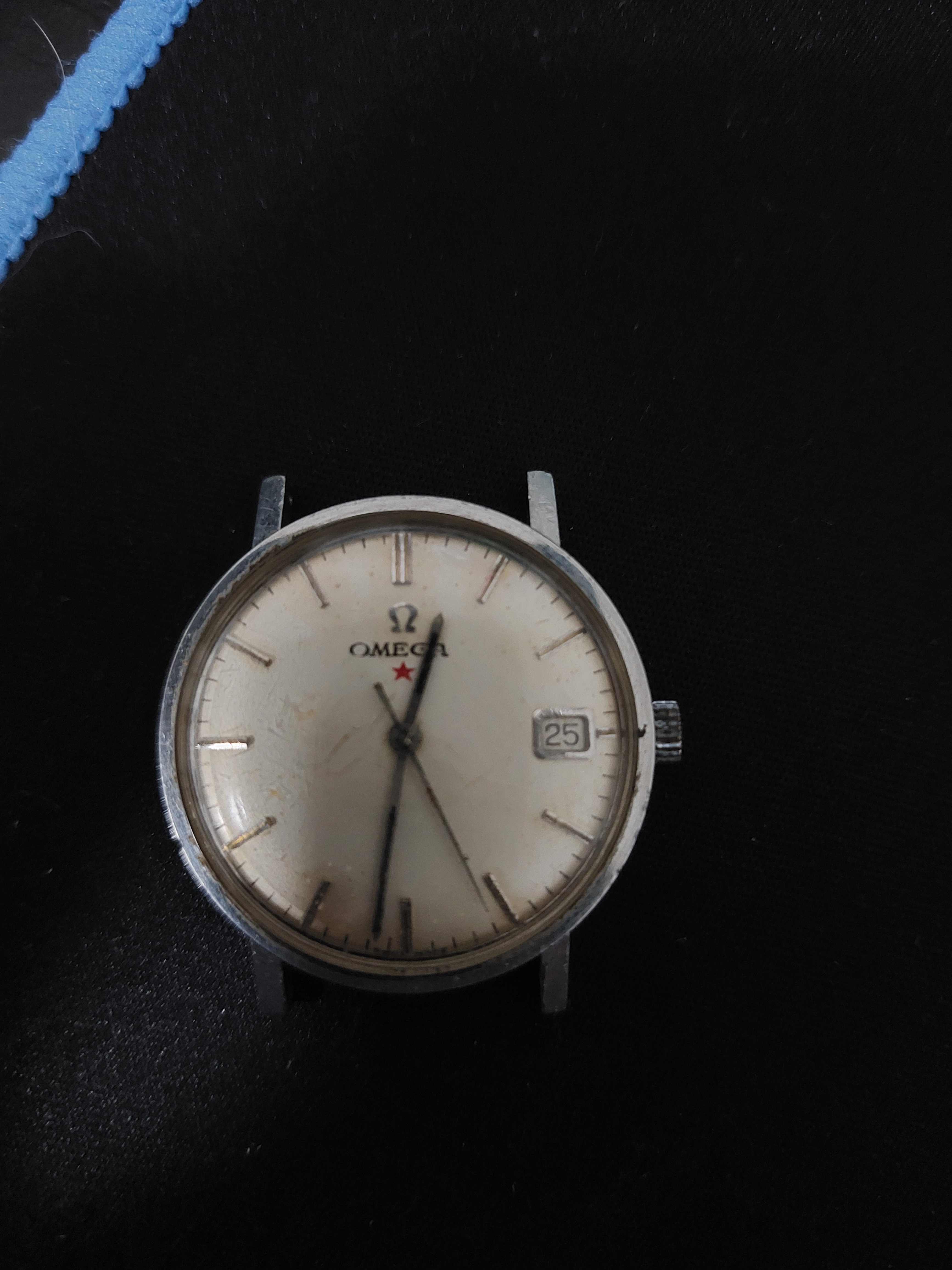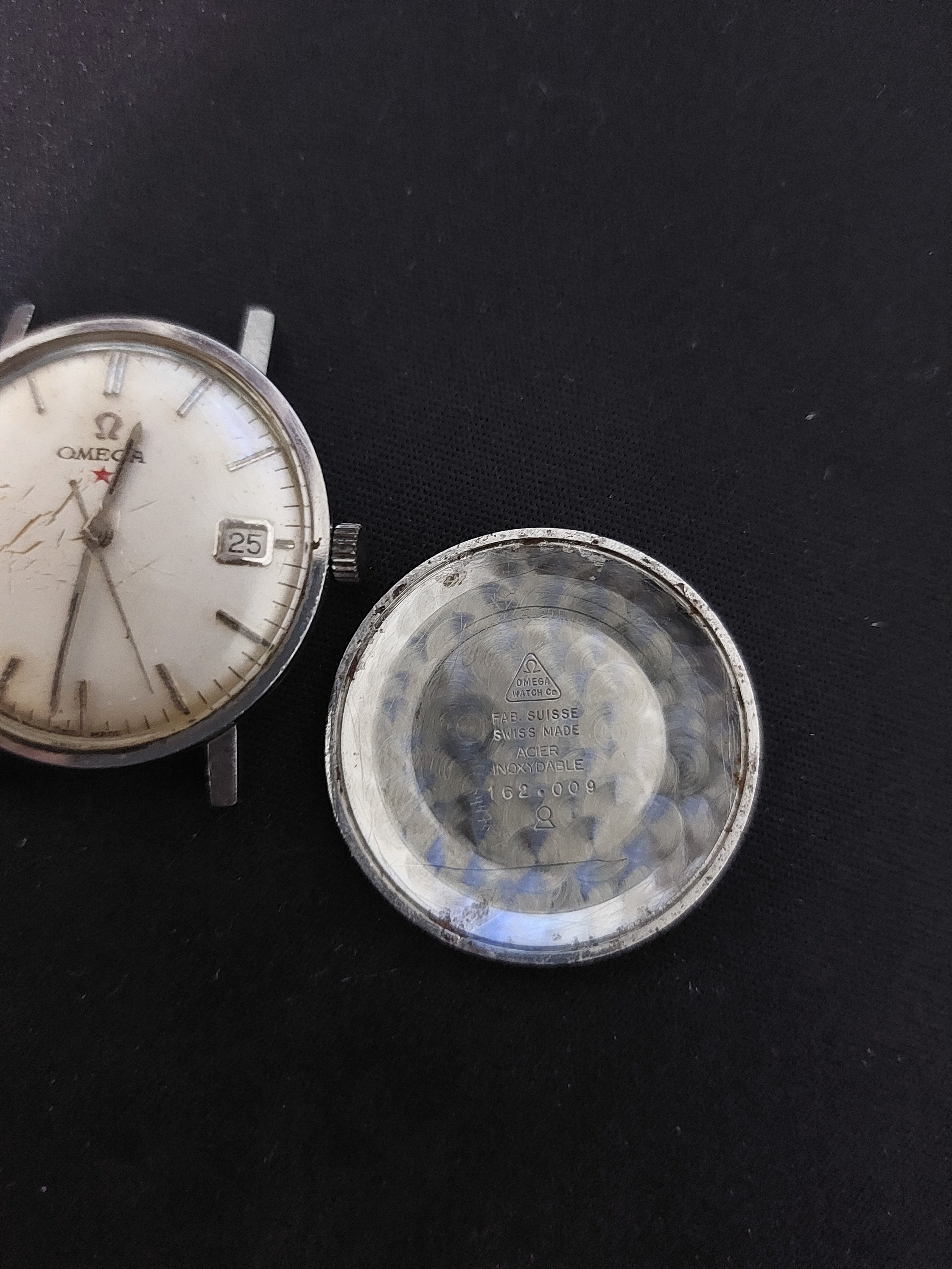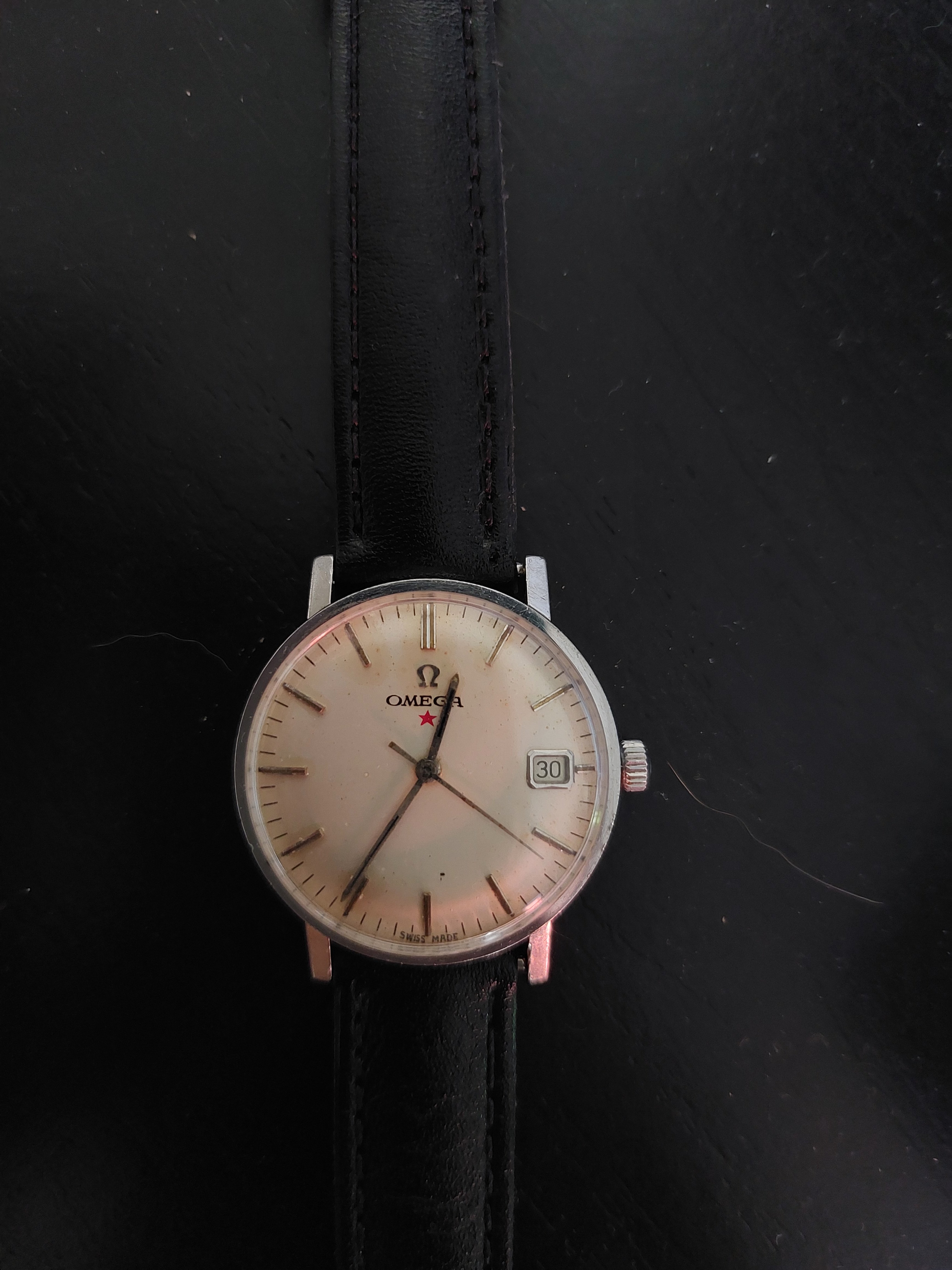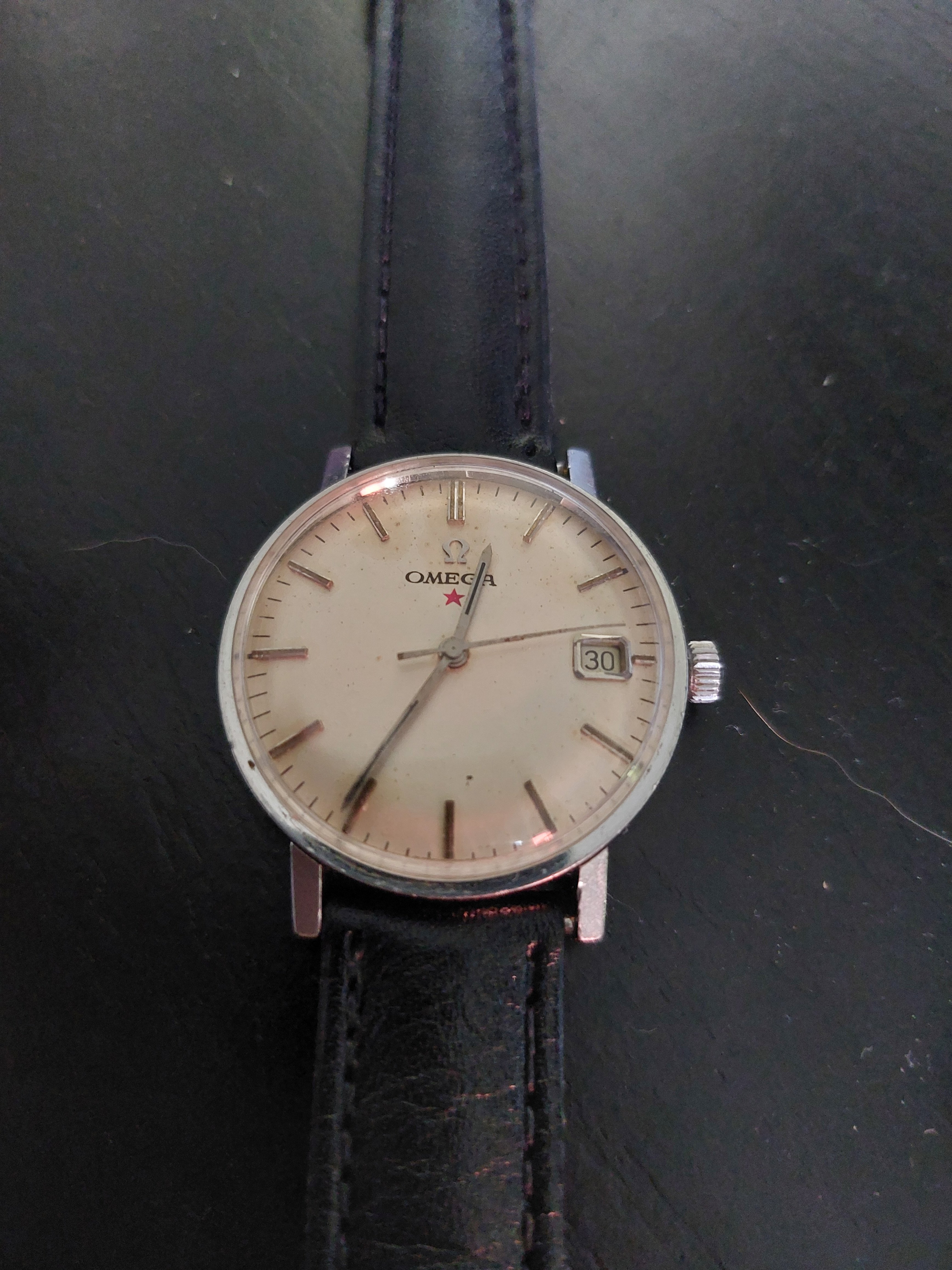 I just bought this omega 162.009 from a local dealer and it was not working. I sent it to change de acrylic and for lubrification. Its runnig great now. I also changed the crown for one with the omega logo, supposedly original. Do you guys have any idea if the dial is original? Seems so to me. I am from brazil, where the red star came in some models, but i couldn't find info about this one. The photos with the black strap on the watch are after the repair. Thank you in advance.