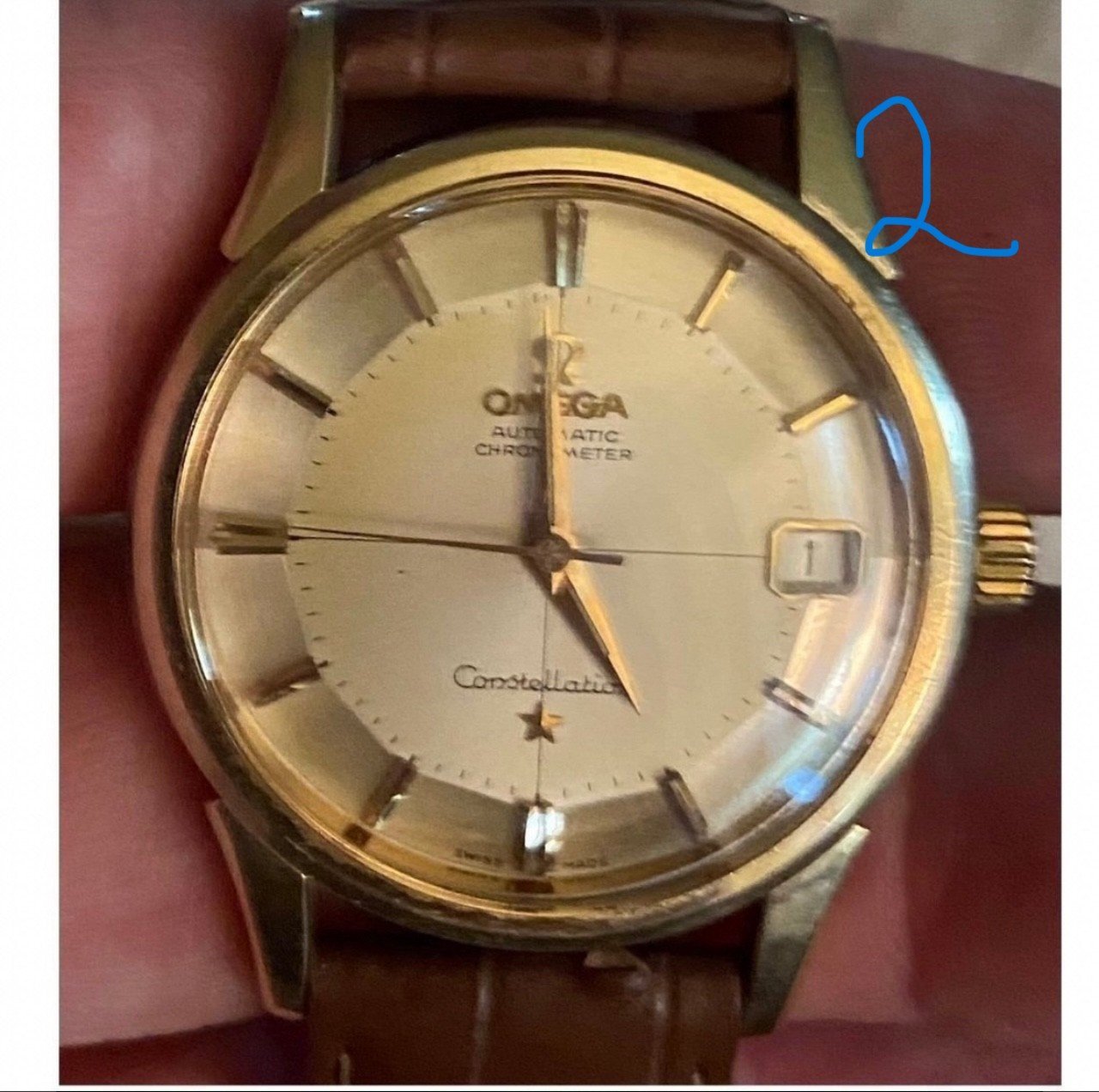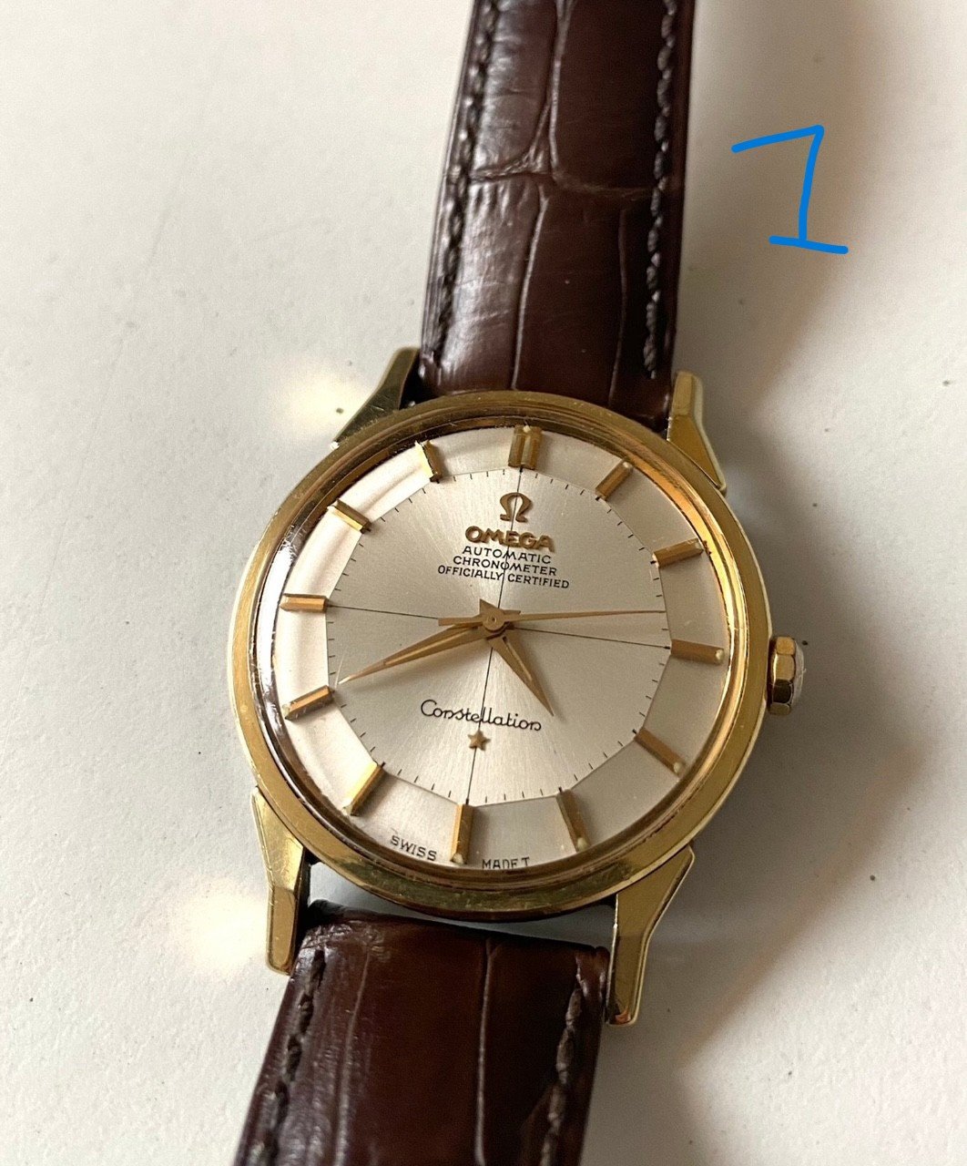 "For sale, one piece of Omega Constellation Pie Pan Gold/Steel. Cal. 561, 34 mm. Crosshair dial. Plexiglass with Omega logo. Comes on a brown Hirsch crocodile strap with Omega buckle. Tested today on Timegrapher. See pictures for condition."