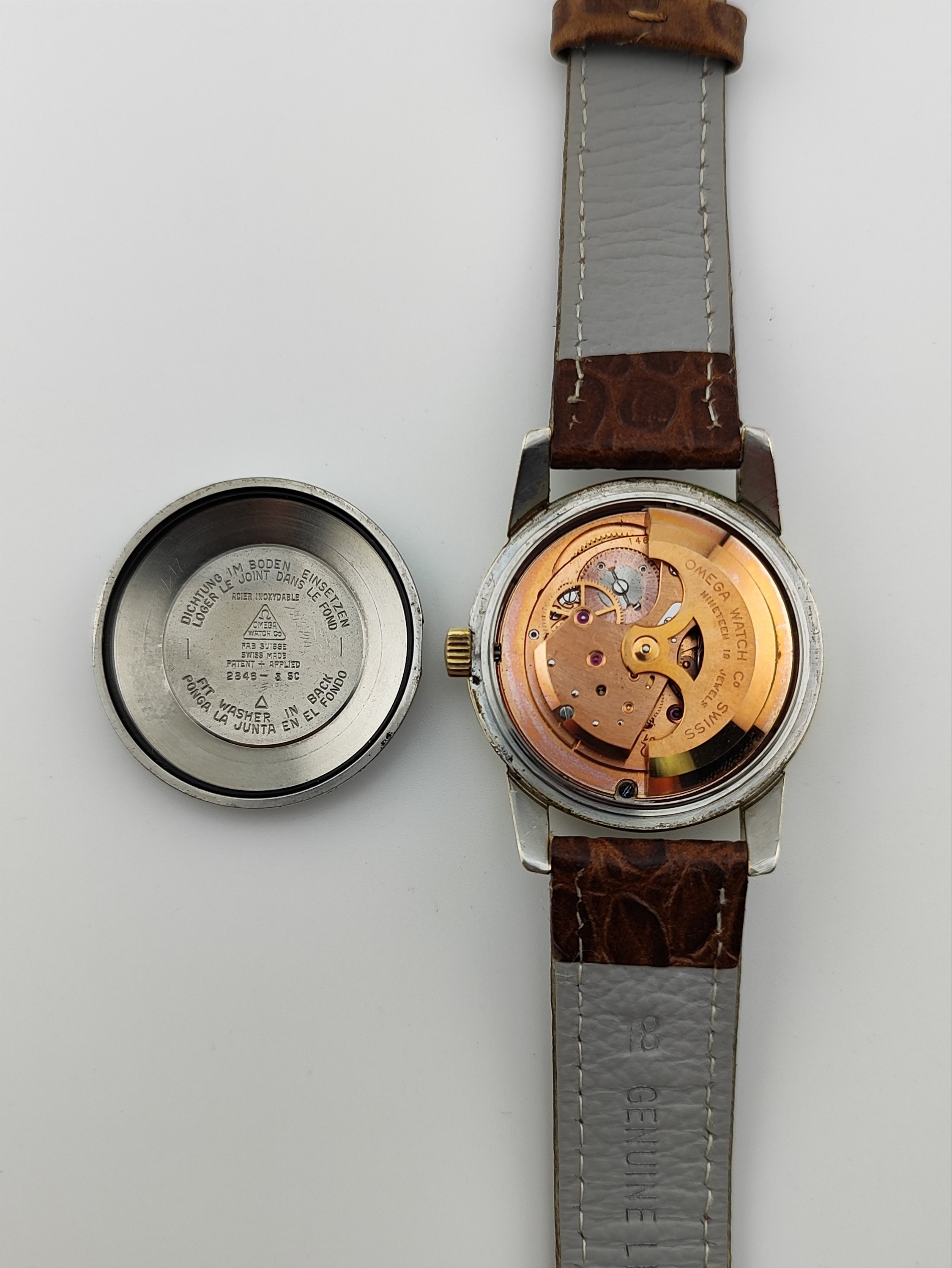 The crown and plexi are not Omega. Case looks a bit polished, but I'm not entirely sure. Back case has "Seamaster" and "Waterproof" texts barely visible. Dial looks generally good except a few spots around the Omega logo that may or may not be dust. Rotor can be heard rubbing and it's done so for a while, as there's discoloration on the plate.