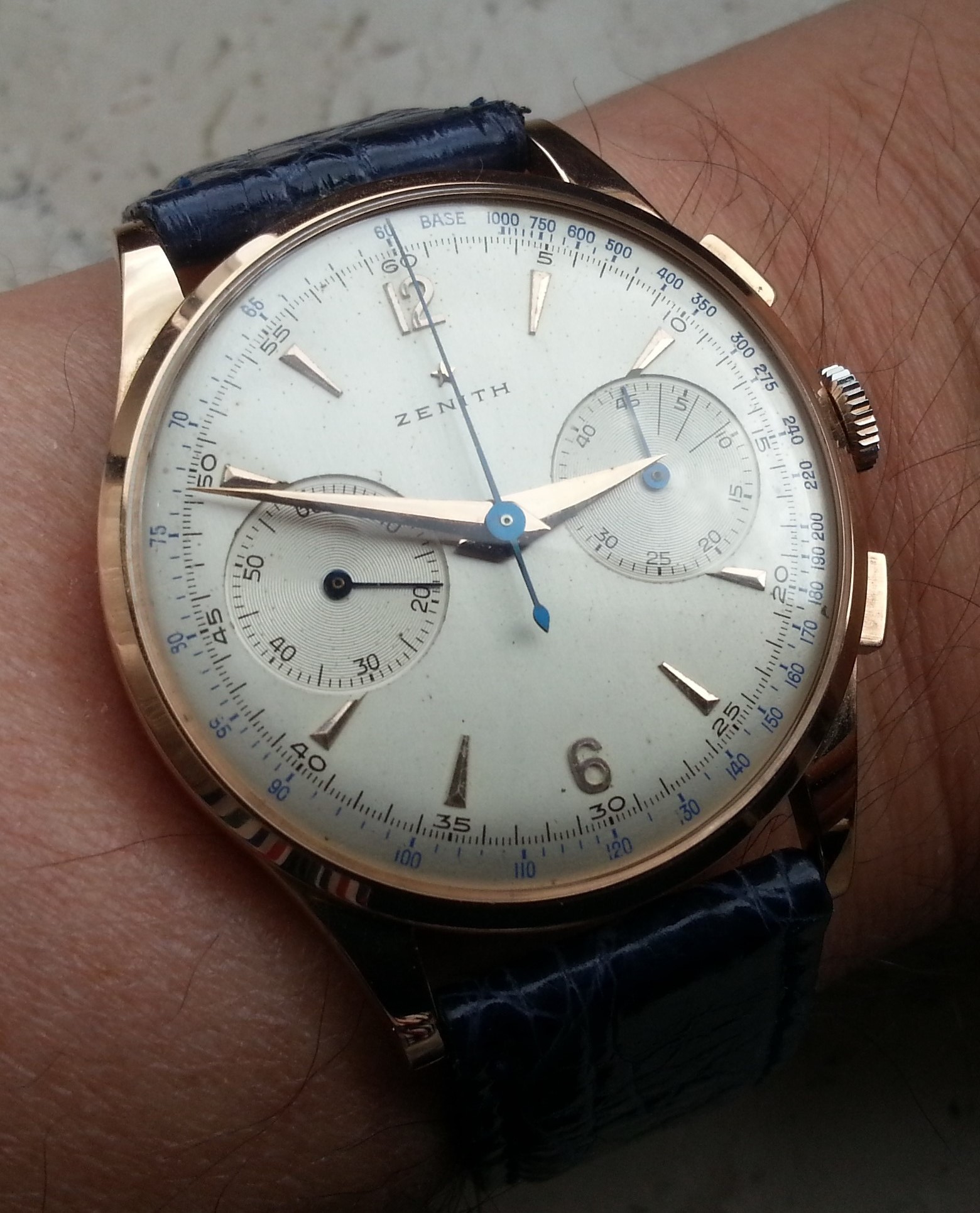 I'm in the market for a gold 37/38mm cream dial 2 register chronograph (3 register would be nice but probably outside my budget for now.) Looking at Zenith or UG (and I will post a WTB now). Just trying to educate my self, I came across these two.
