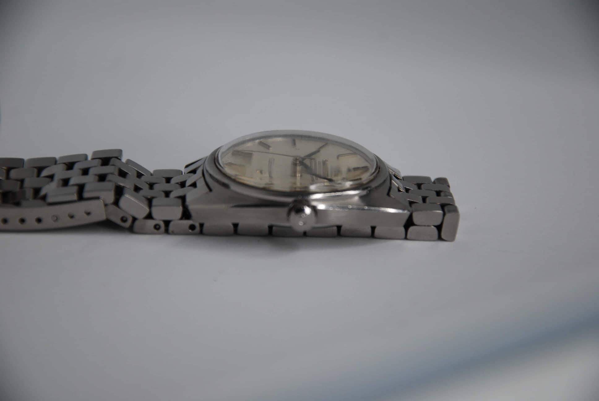 The only concerns I have is the green (moisture?) stain on the sides of the movement, and what appears to be a couple of dings on the lower left lug. Seller says that the watch has been lightly polished, and it appears that the chamfering on the edges is still visible. That said, I am no expert in spotting the symmetry of polished cases. And I am not sure about the correctness of the crown. Oh, and the asking price: US$920.00.