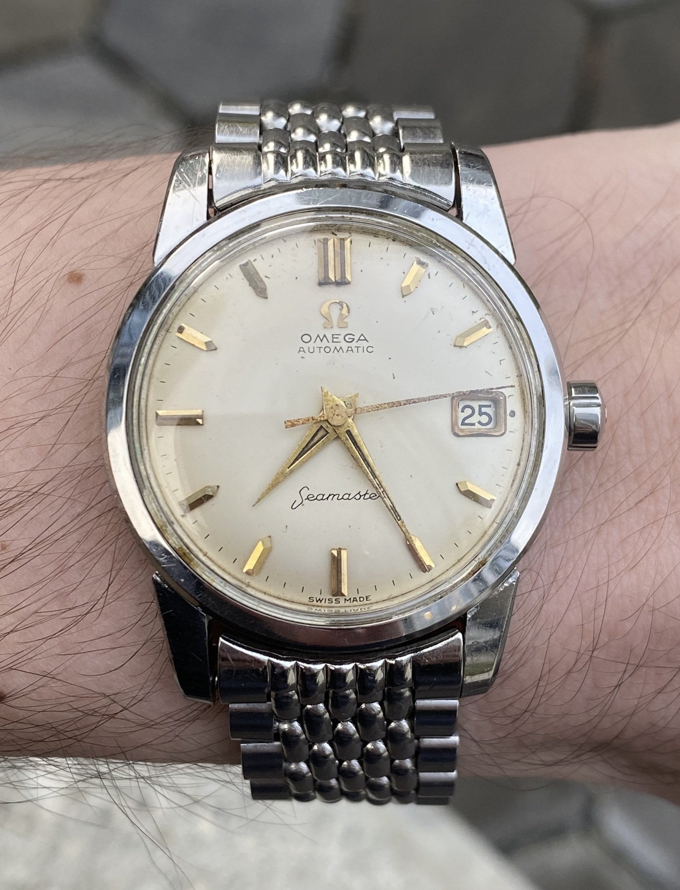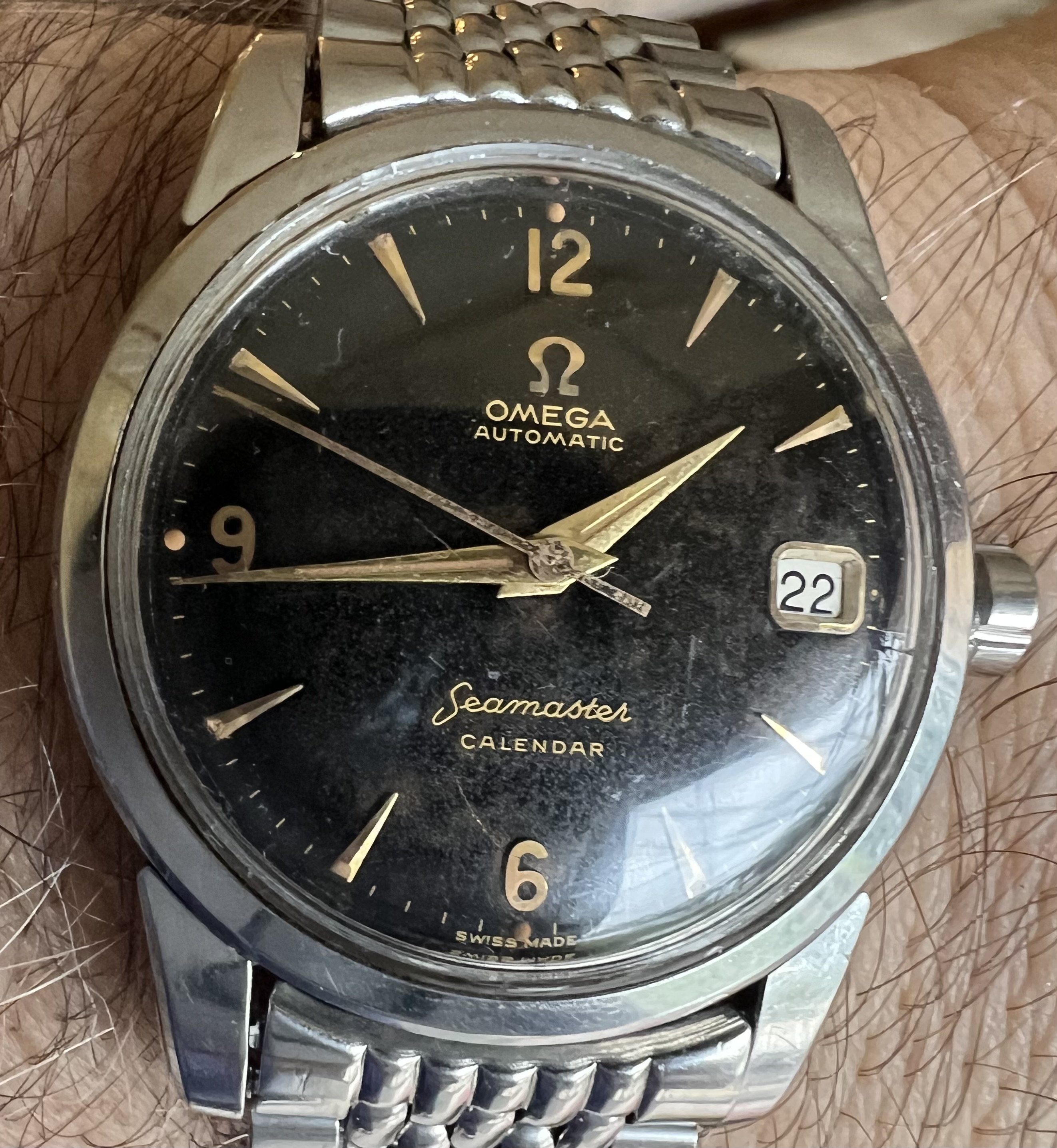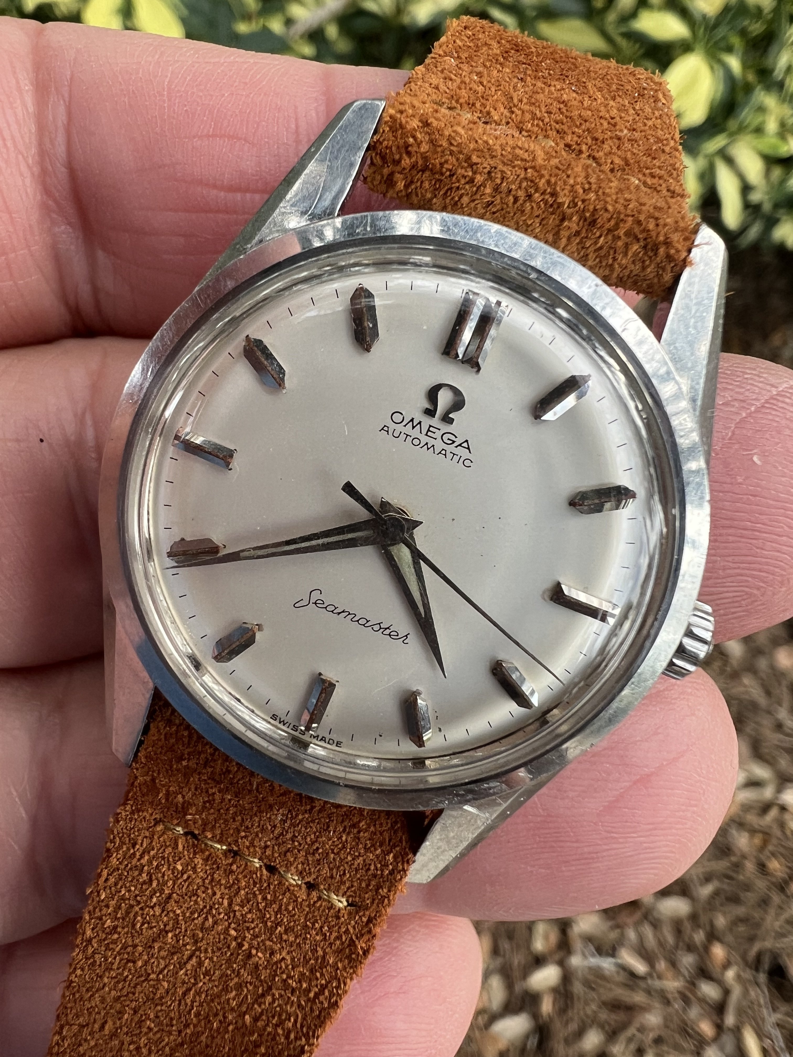 While searching my local vintage dealers, found this 2849. Is the dial too good to be true? No patina and fully intact lume. The "a" on the "swiss made" looks a bit suss. Advertised as near nos, with original calf leather strap (not sure this is correct for this reference). The case at least looks pretty sharp.