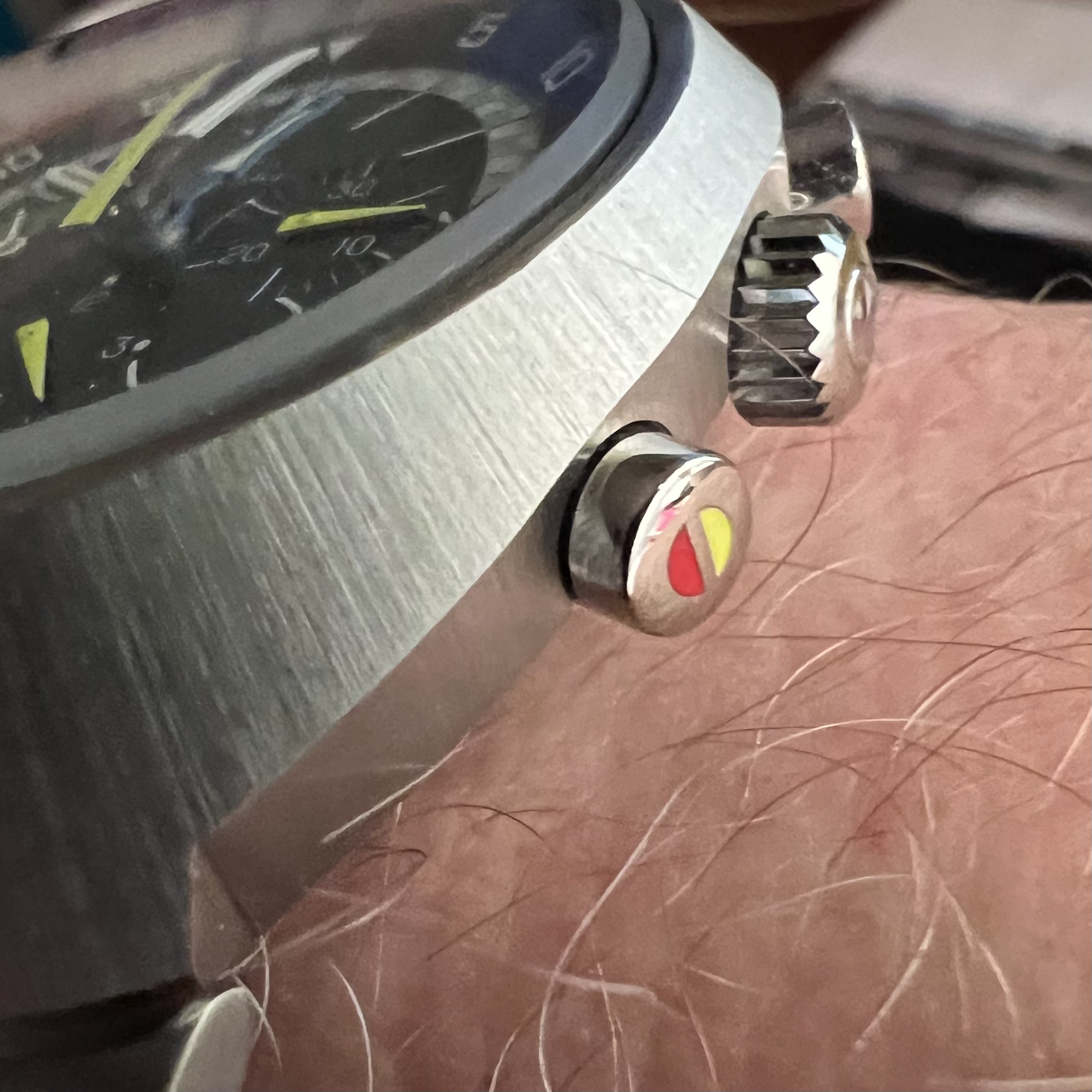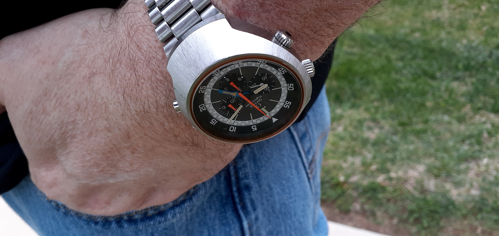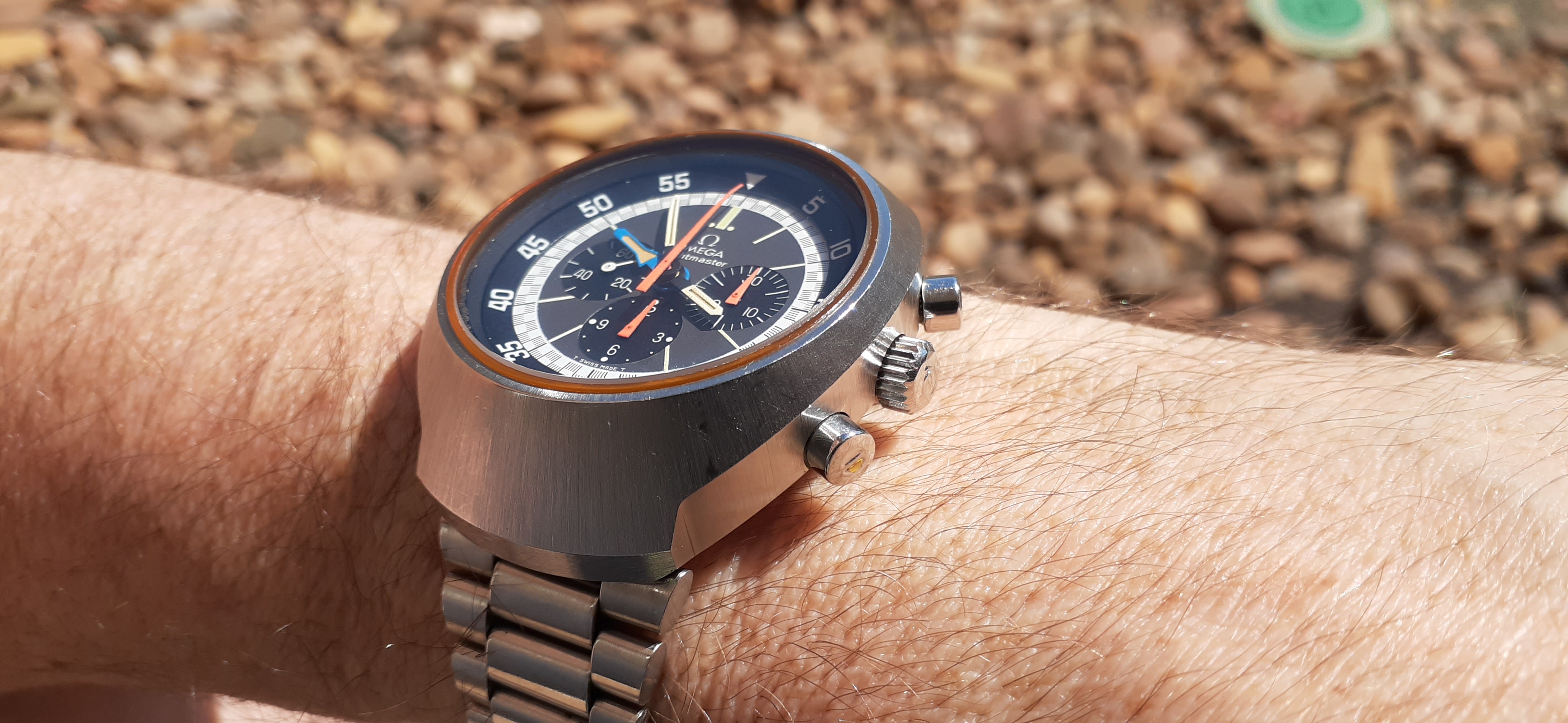 ·So, a colleague of mine mentions he inherited a Flightmaster from his dad (with original box and instructions), it's been kept in a safe for five years, he hates it (too chunky), and do I want to borrow it? And maybe buy it? He brought it into work and and I've been wearing it all day. I was expecting it to be huge... but it wears really comfortably! Definitely bigger than my usual vintages, even the 37mm Constellations, and I'm very tempted. Case seems great, coloured pushers intact, only trivial issue is the original clasp has been changed out for a crappy safety catch.
