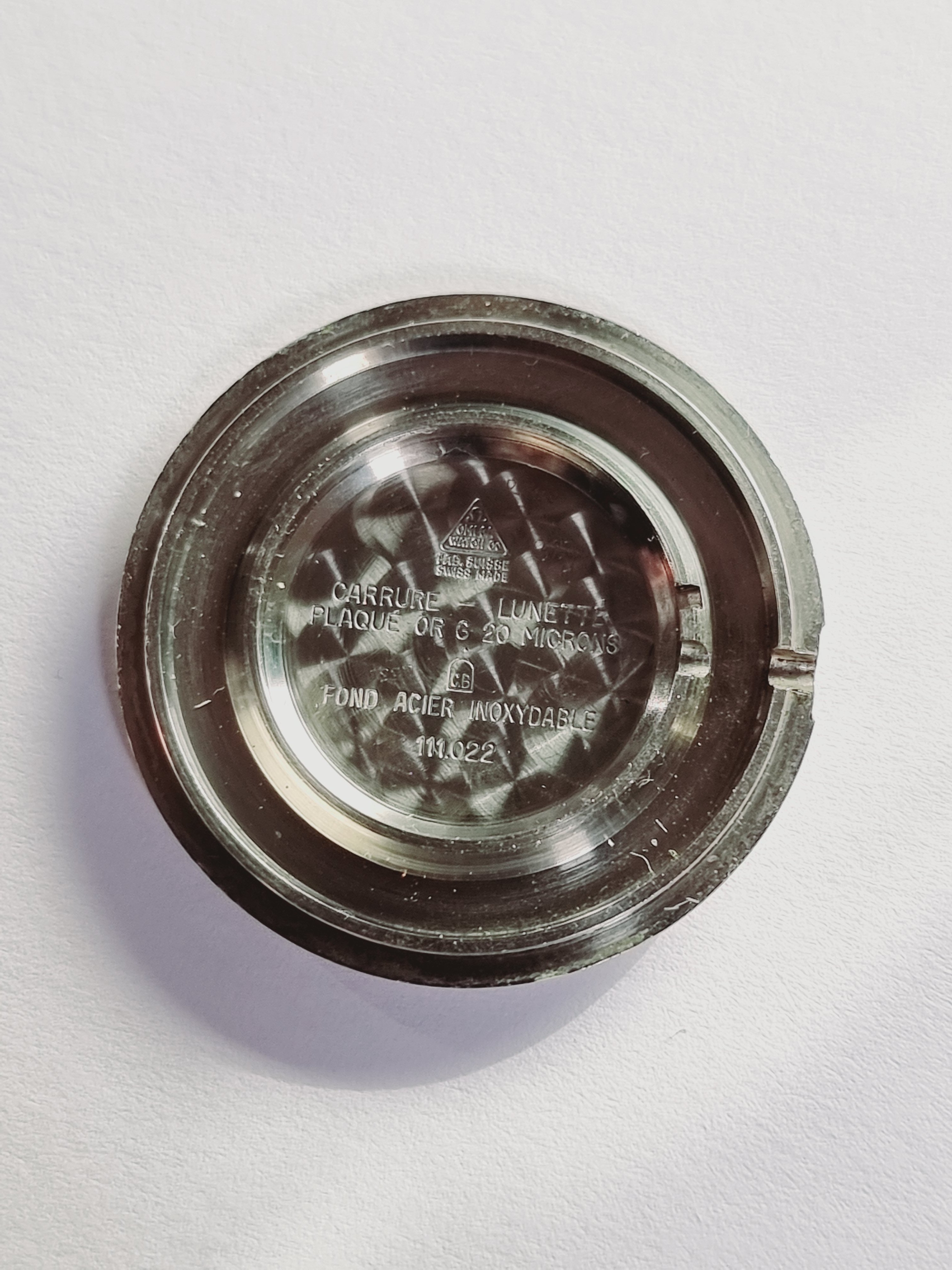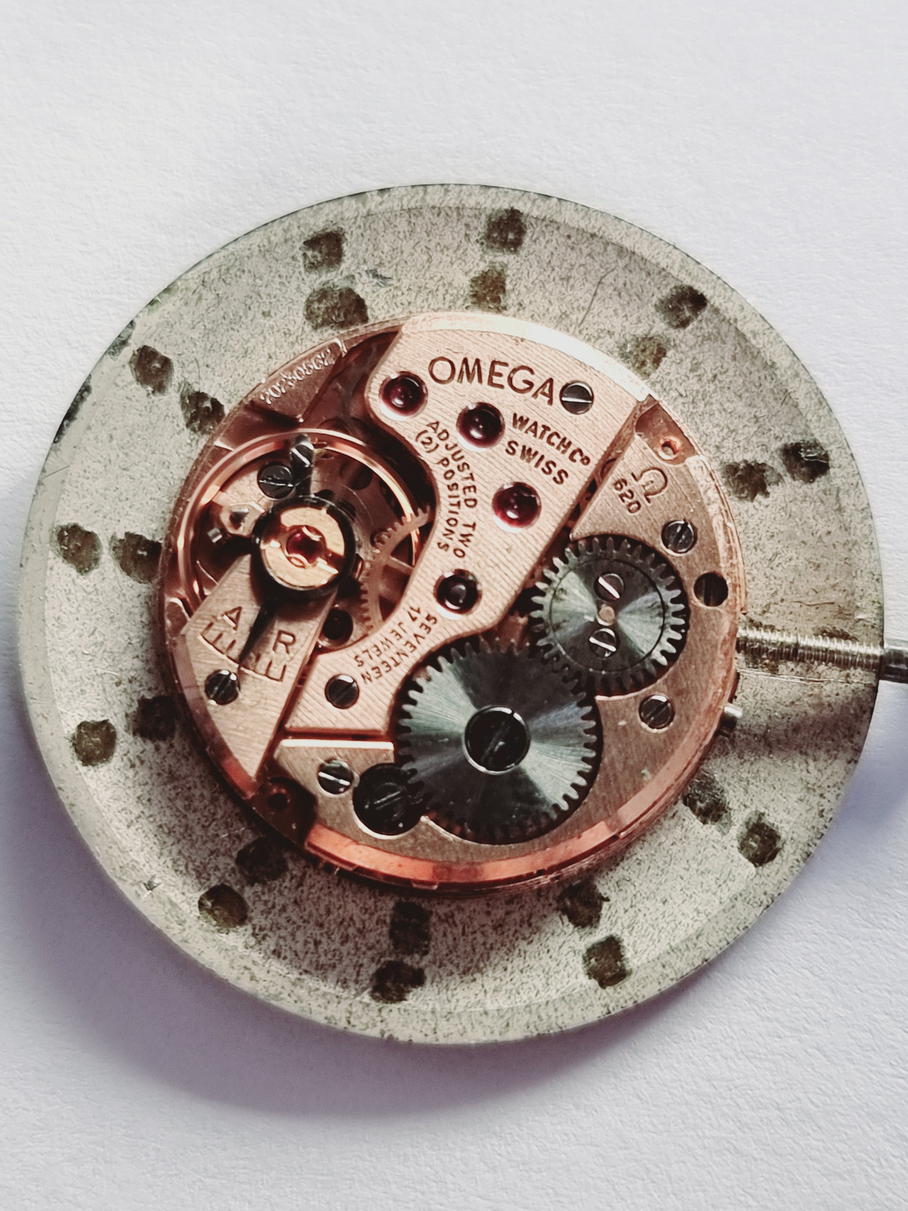 I can see a dark black (near) circle right under the Omega logo that is likely where the "G" in "OMEGA" once was. (Edit: actually that would not be the right position of the G, so I'm not sure what that is/was). Also, it may be coincidence, but some of the white specks around the perimeter seem to be remnants of minute markers - most notably between 6 and 7. (Edit: based on later comment, that must be coincidence!)