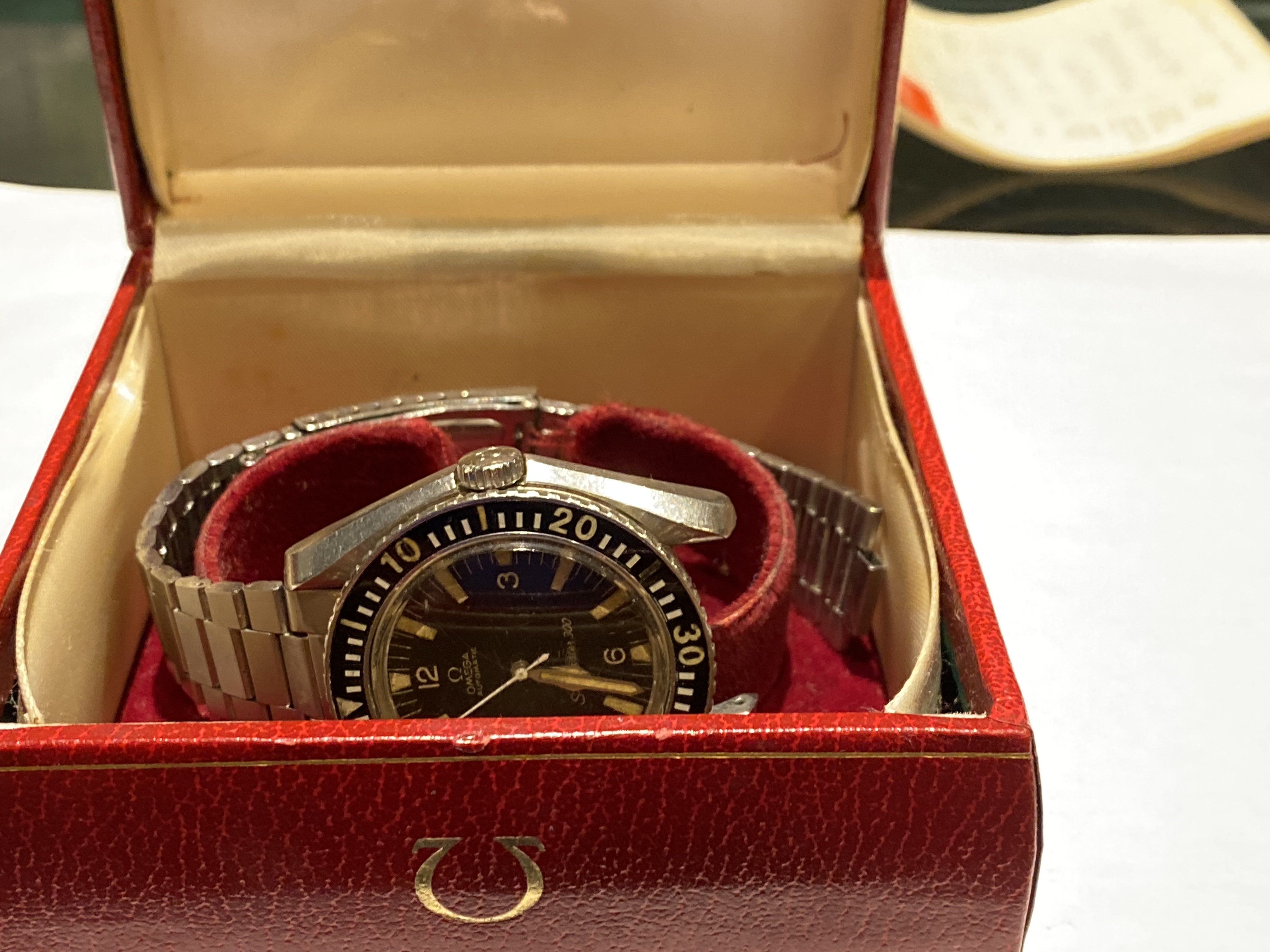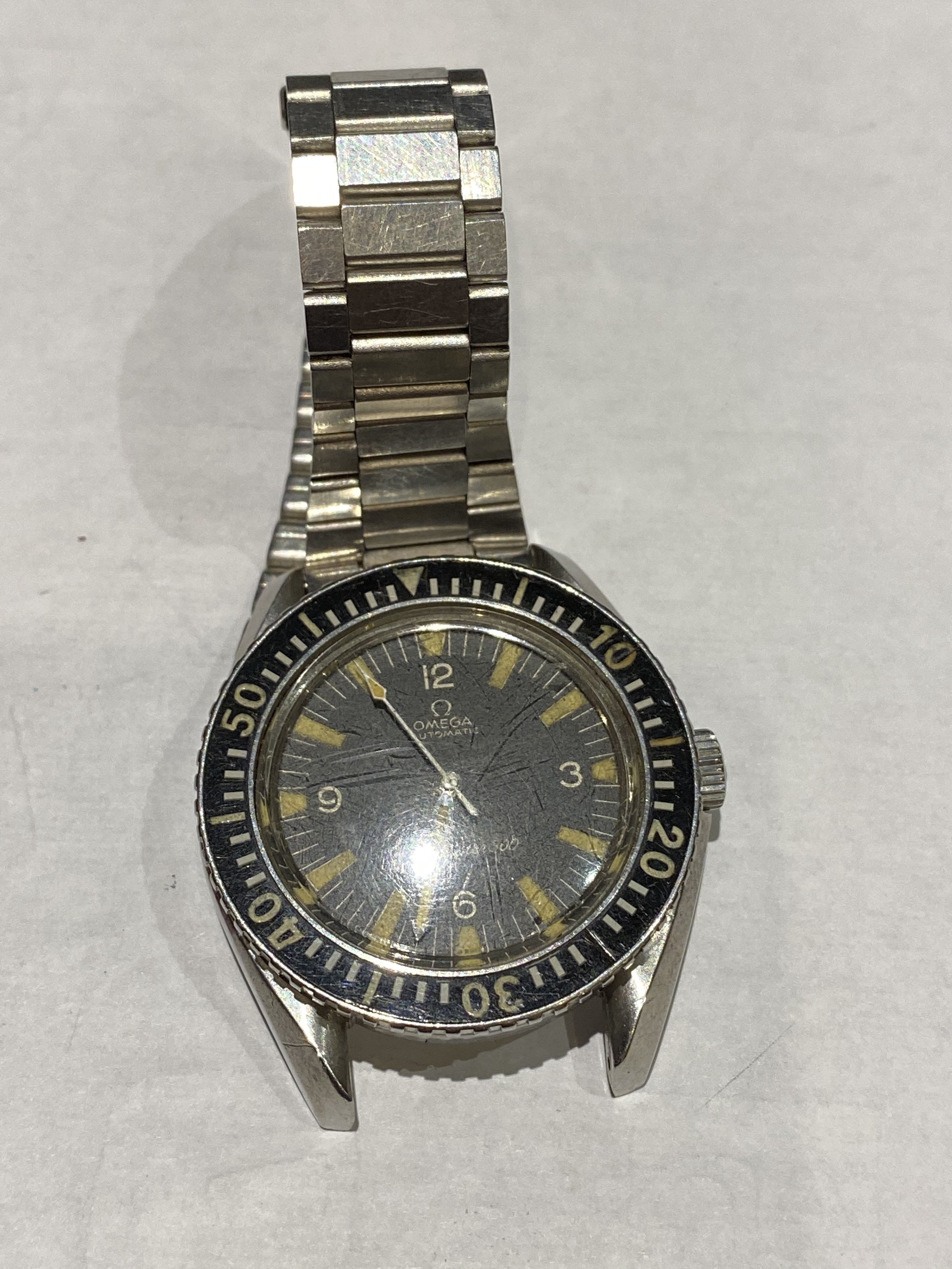 This watch has been well worn and looks like it needs some restoration and maintenance. The pin on the strap is missing and some maintenance of the crown is required. However, the watch is working fine.