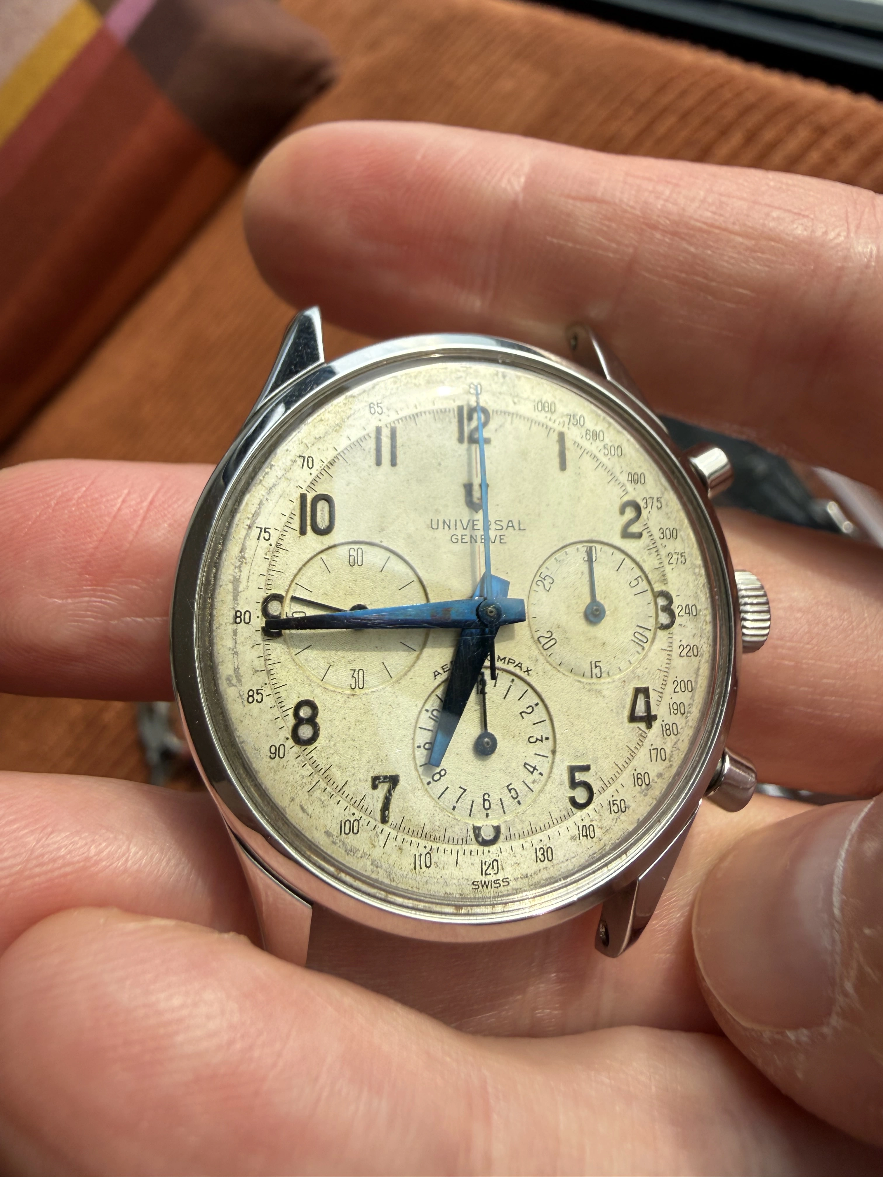 I‘ve owned this Aero Compax for a few years now and always wondered whether the hands got tinkered with at some point in its life. They are shimmering in a dark blue and seem to have been sanded. There‘s no lumen at the tips either. Date of production around 1950.