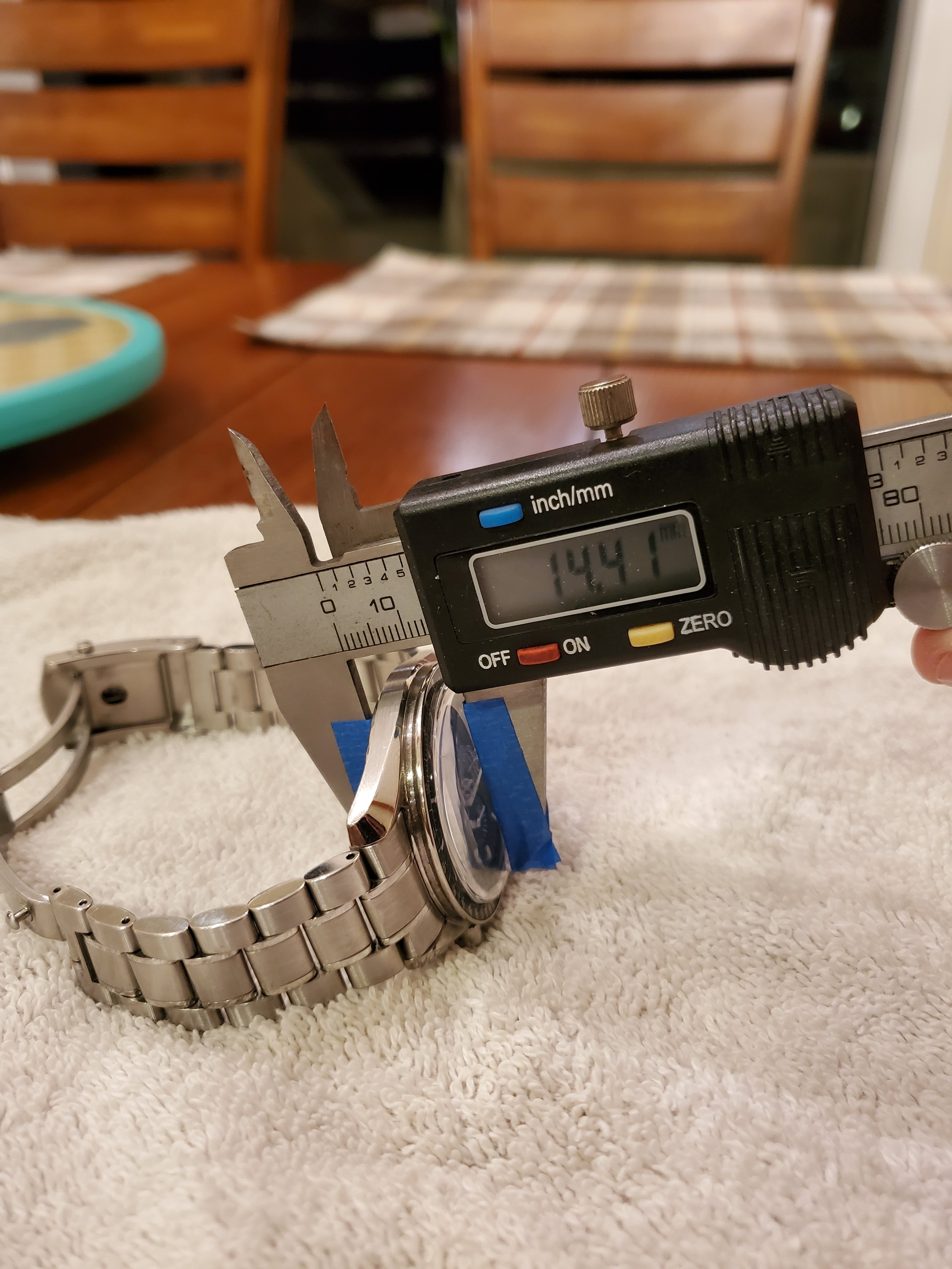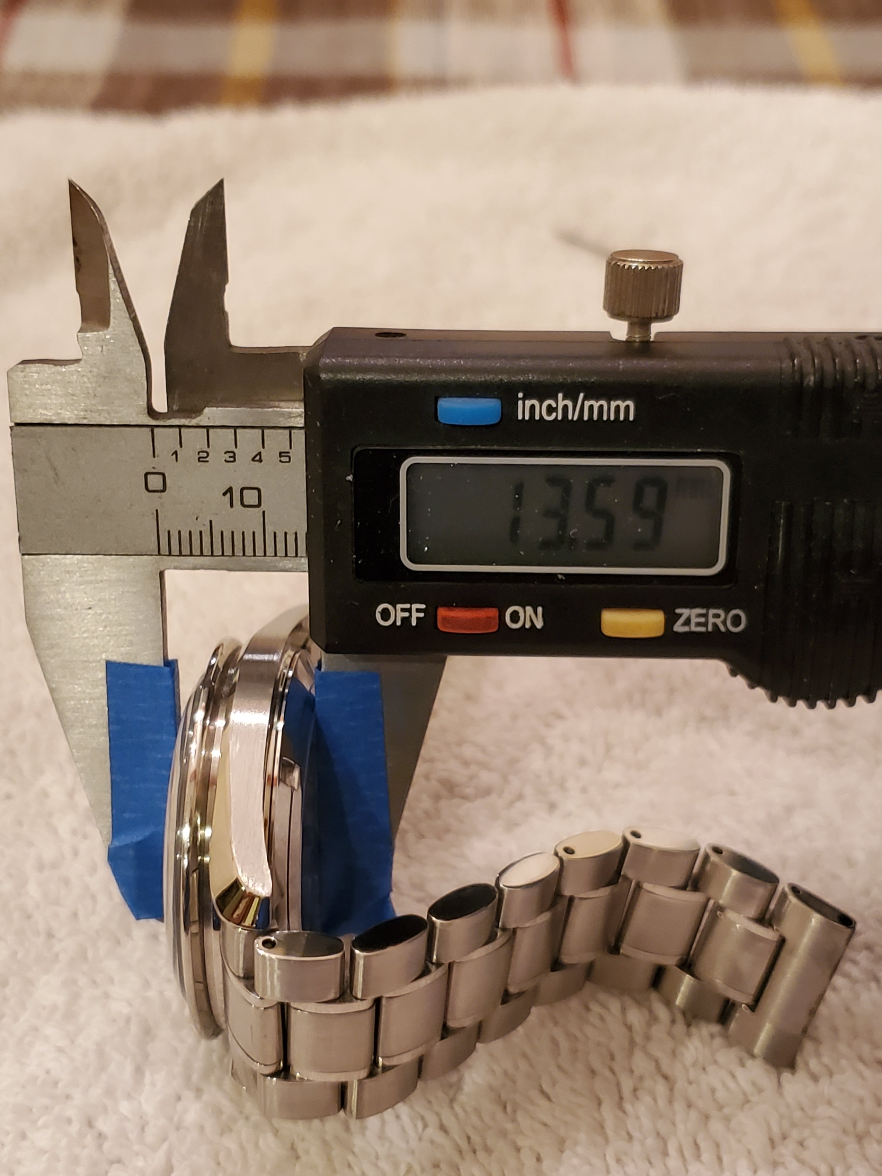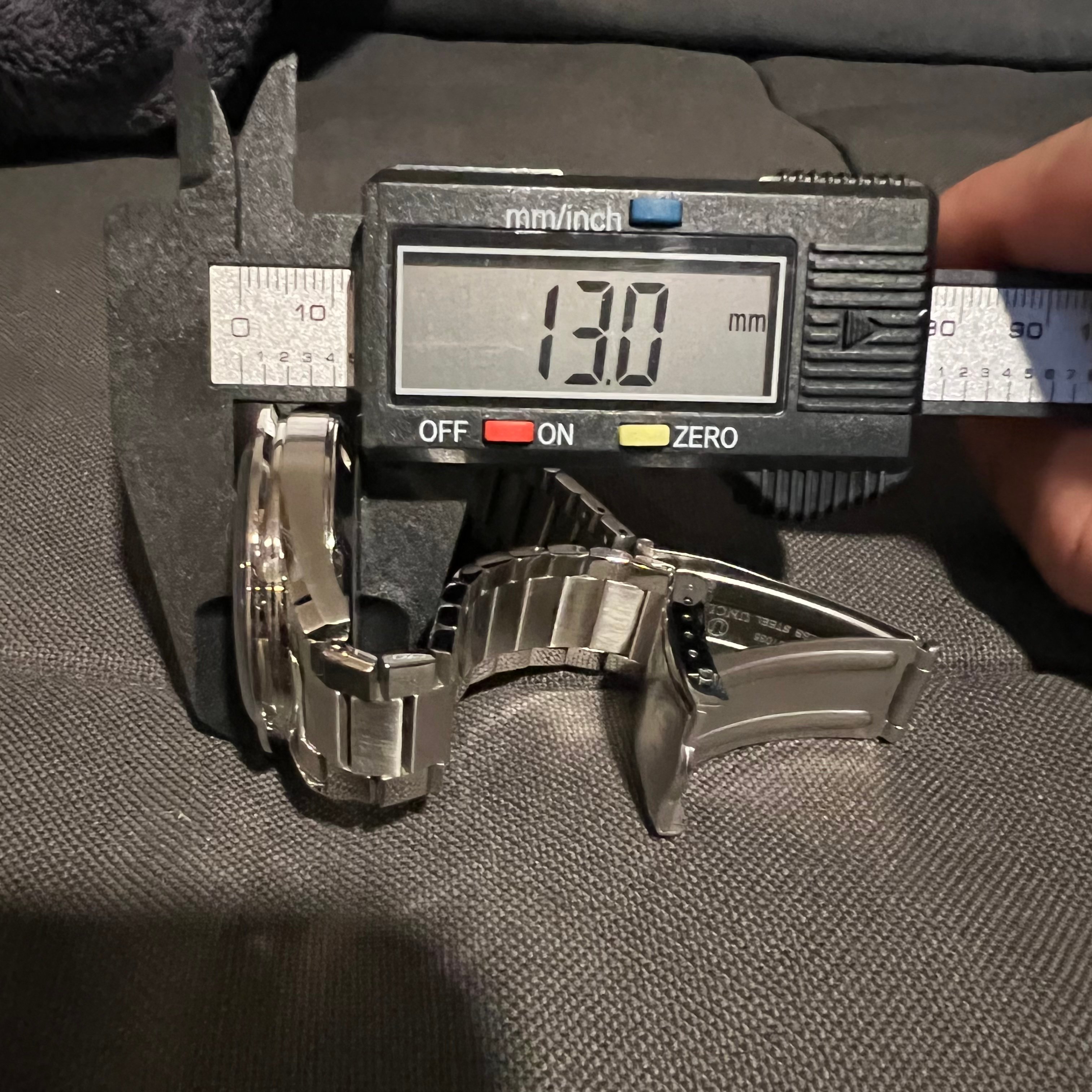 As to the thickness measurement of 13.0mm, here's the picture. I did not measure the original thickness and did not bother putting the original case back on to compare. The 14.5mm was based on searches online and may not be accurate. Some website listed it as 14.0mm. It'll be great if someone can measure it to confirm. Please note that the FOIS original case back is a bit thicker than a standard moon watch to accommodate the deep engraving.