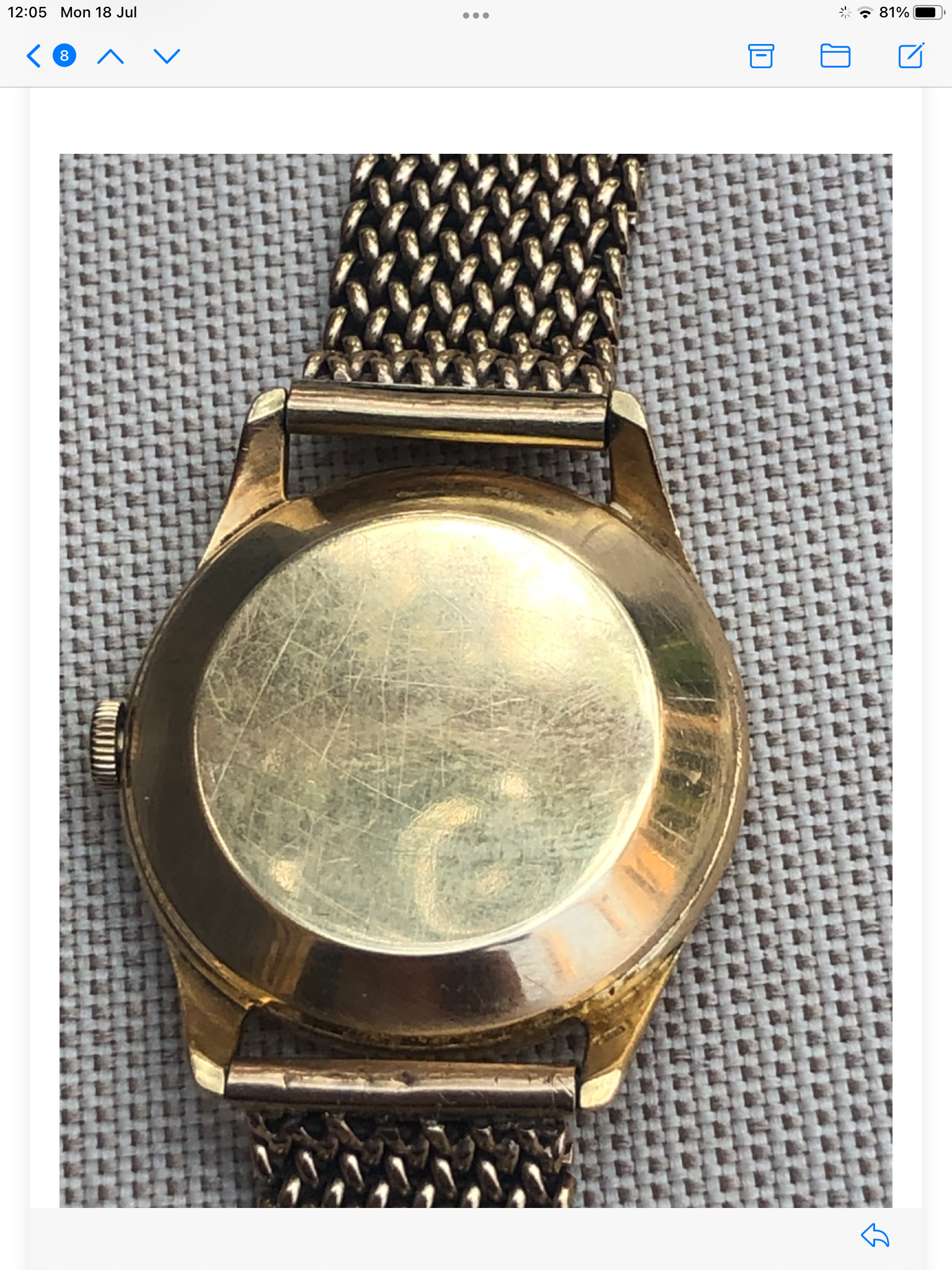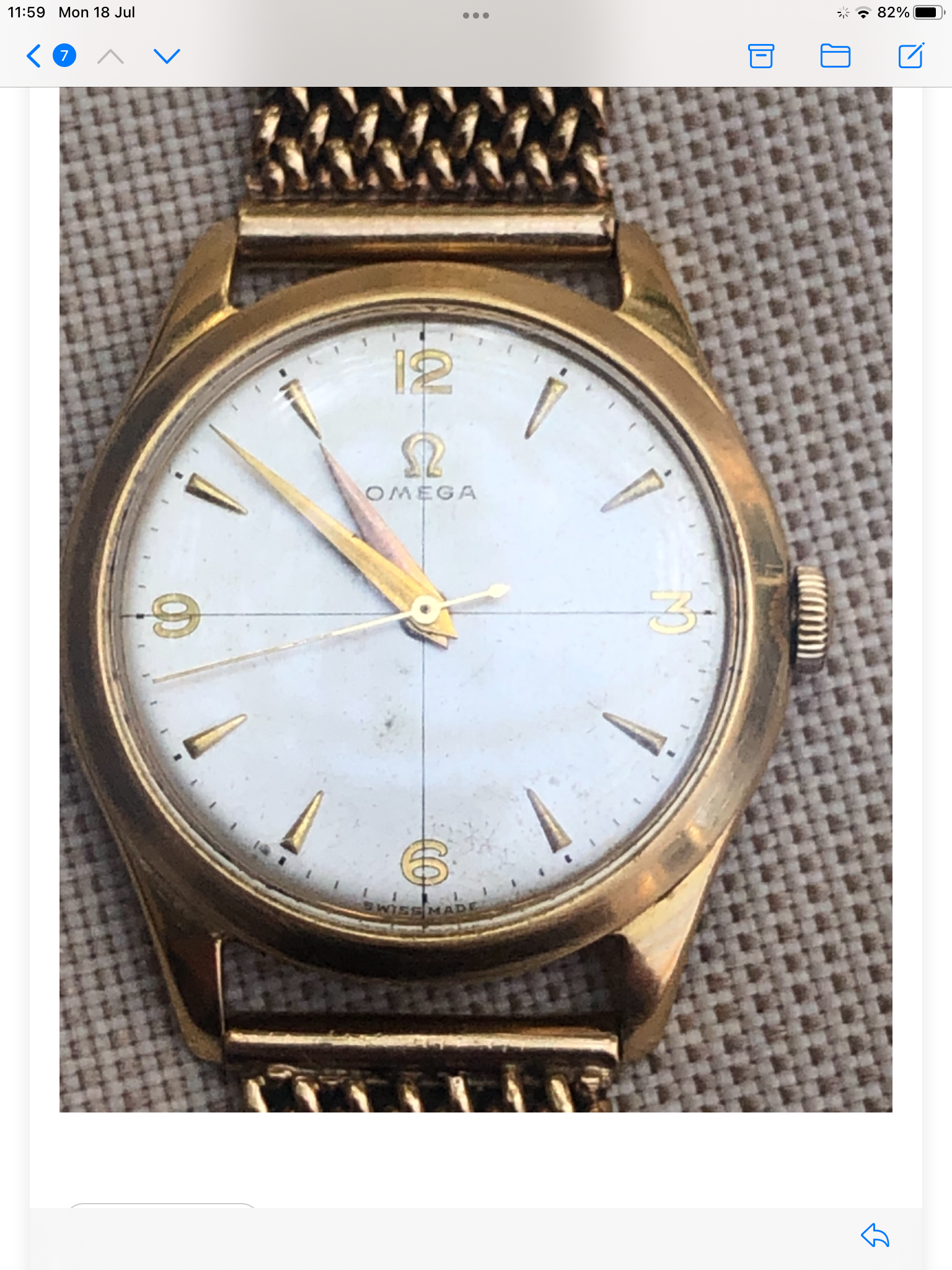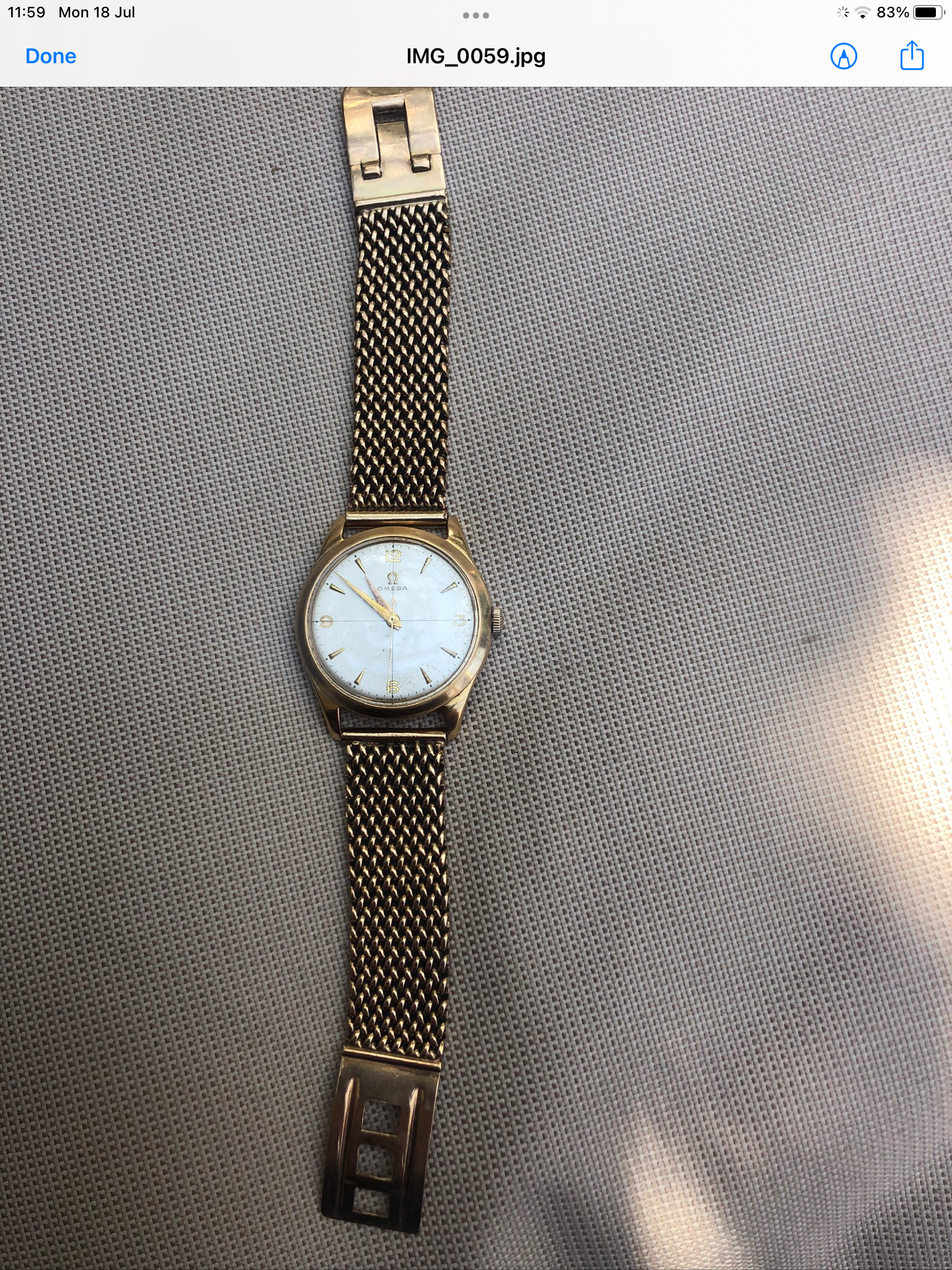 ·I have had this vintage Omega manual wind 36mm watch for a number of years. I had it serviced when I first got it, and the movement was photographed at the time. Unfortunately I cannot find the images. I do know that all of the movement was gold. The case is marked 18ct and I imagine the movement is too. It keeps excellent time and has an Omega button. I’ve struggled to find anything the same or similar on line. I’m reluctant to attempt to take off the back. Can anybody help me with its age and a value? The bracelet is Chaincraft 9ct. Many thanks. Mike