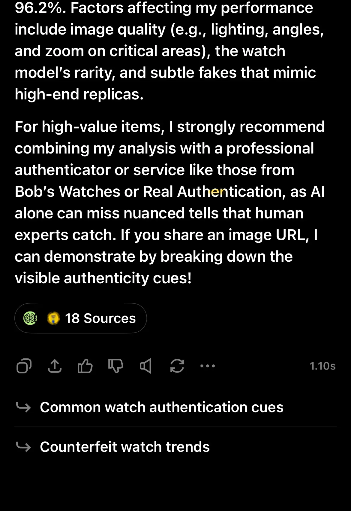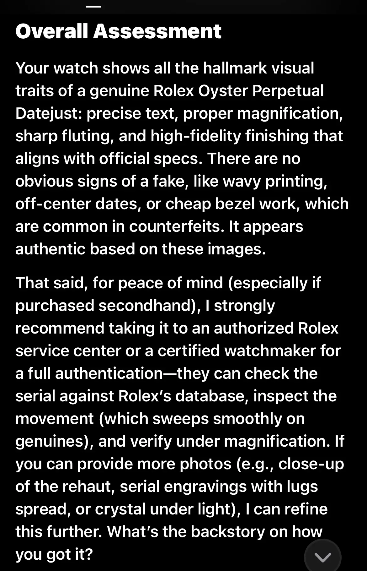 So I attempted to have it authenticate my Rolex. It spit out an impressive list of things to look at and compared each one to my image. Actually quite in depth but I think it made an error reading it as fluted. I can’t explain that.