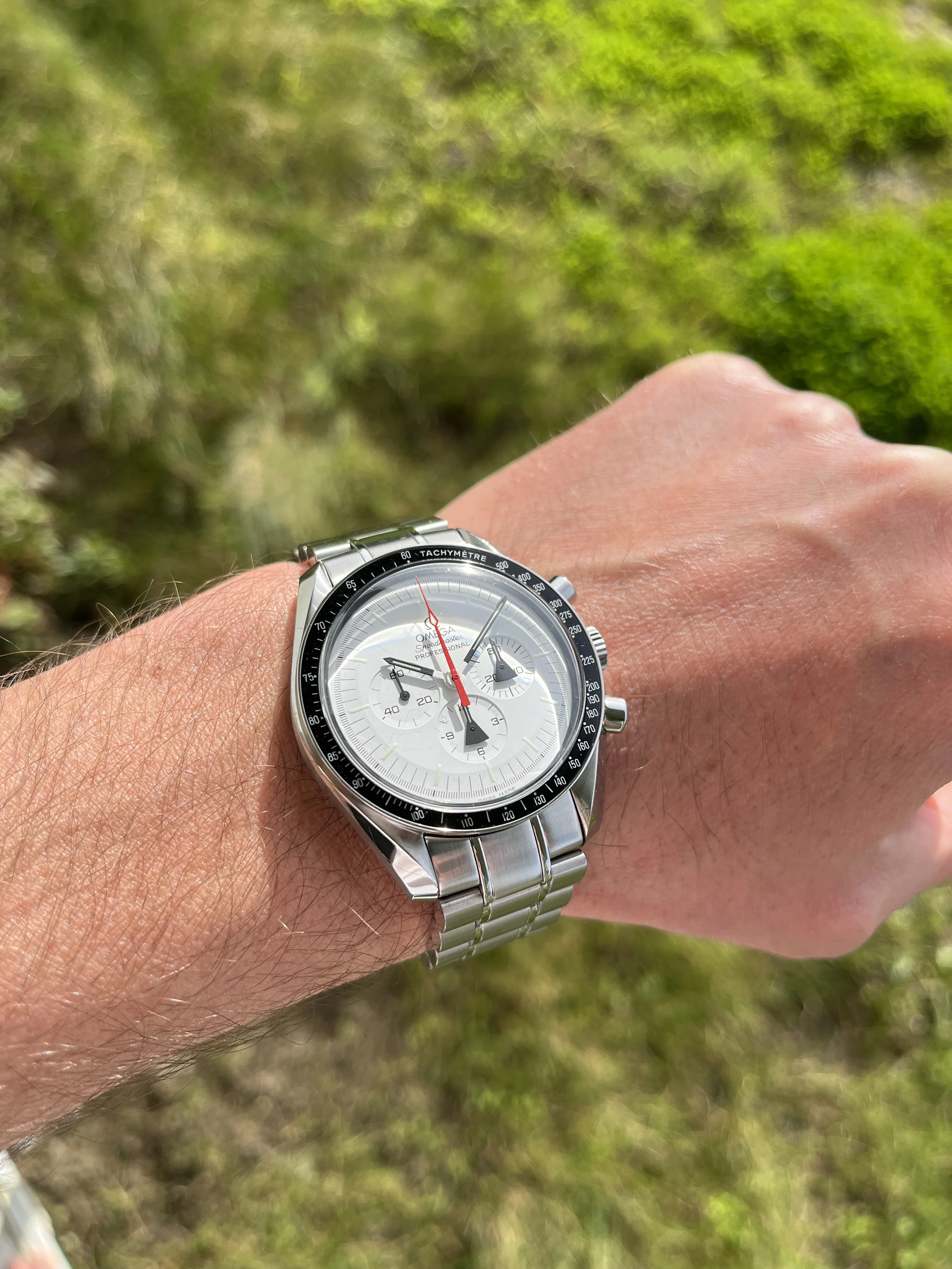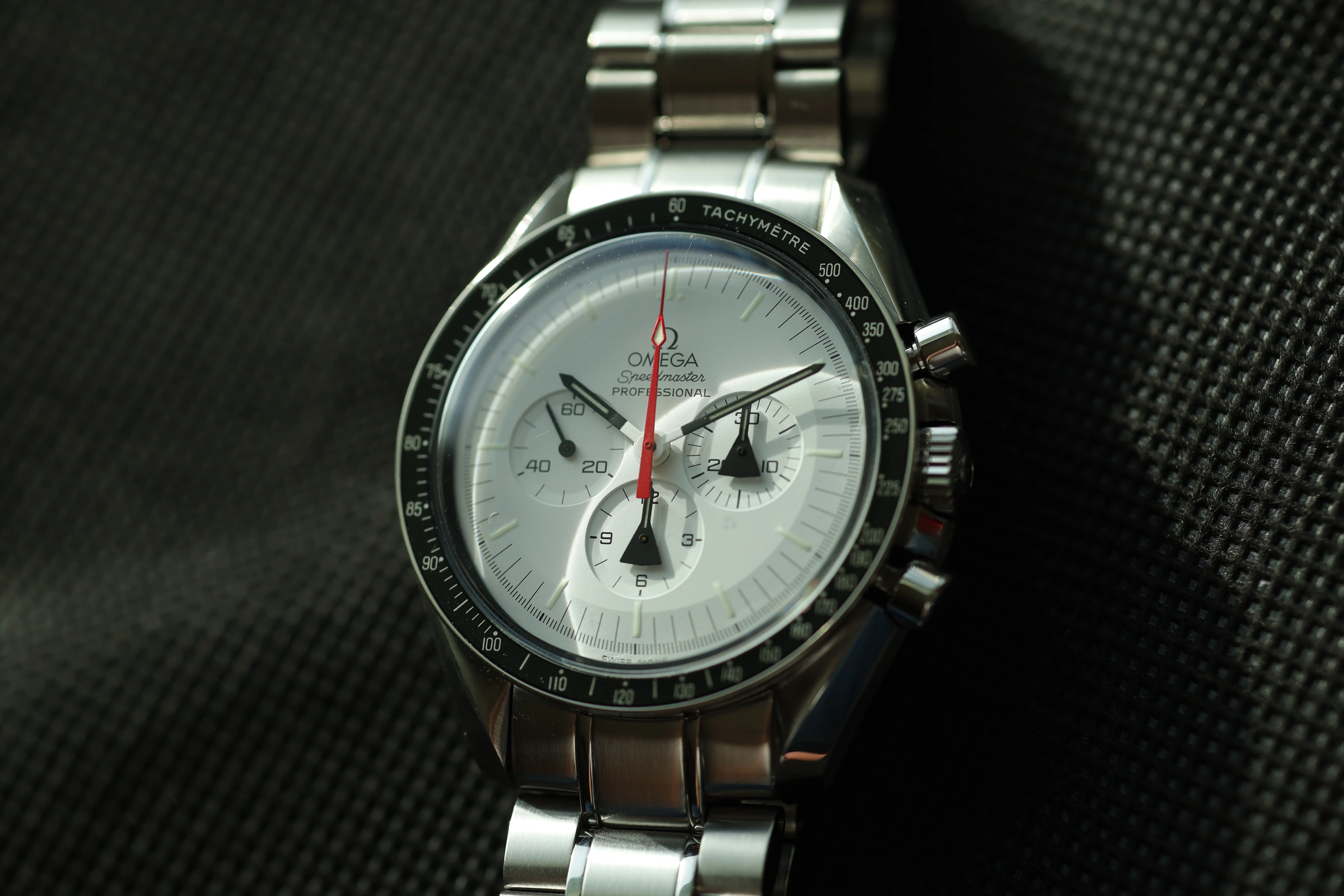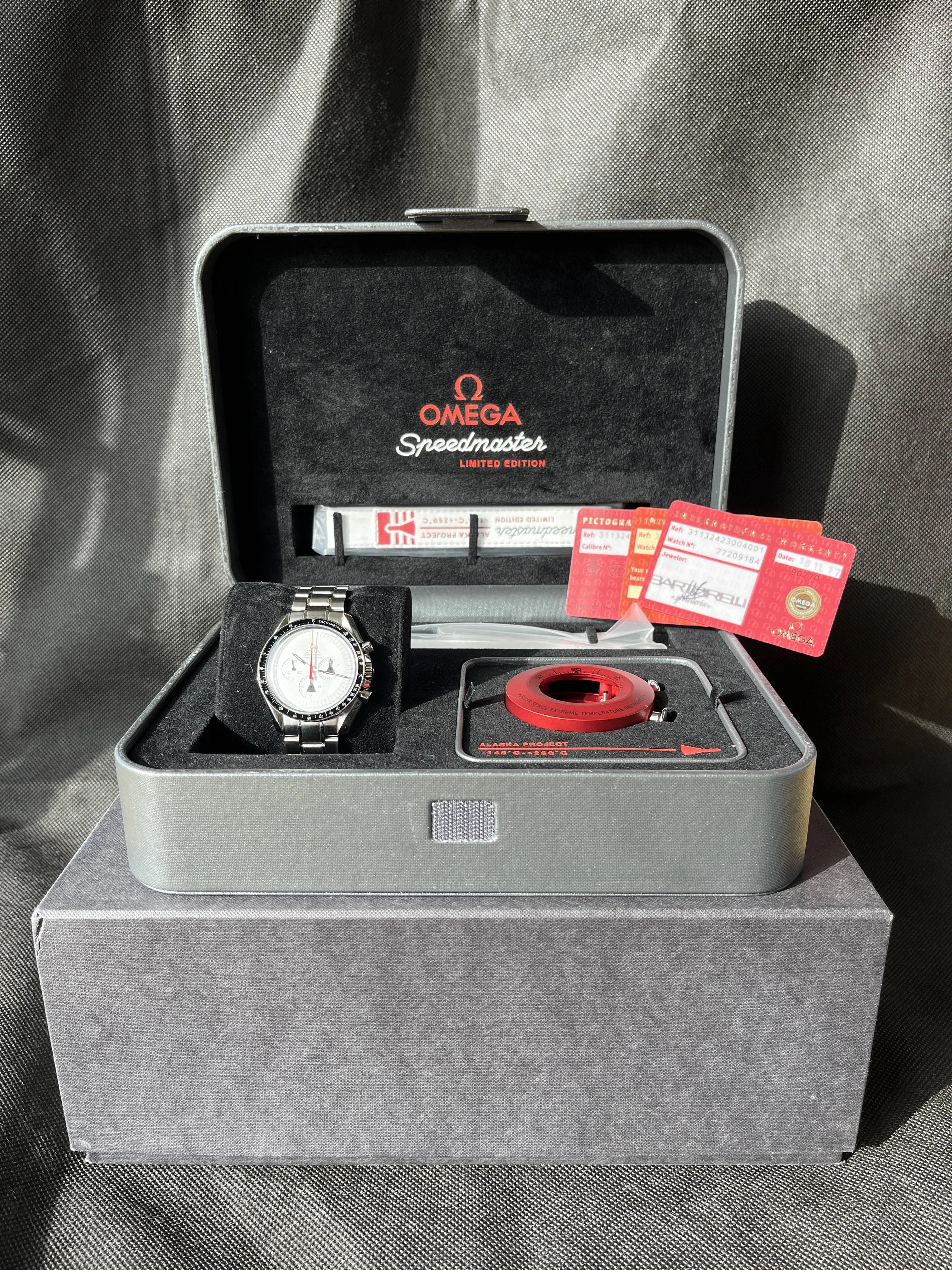 Up for sale is my Alaska Project Speedy Pro, this one comes as a full set; warranty, pictogram, LE cards, two straps, various booklets, aluminum bezel, tools, hang tag, etc. Watch has been very seldom worn in my care, but does exhibit some signs of wear from previous owners.