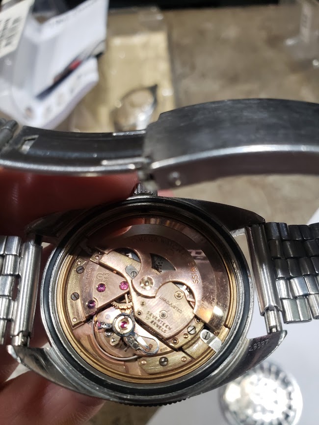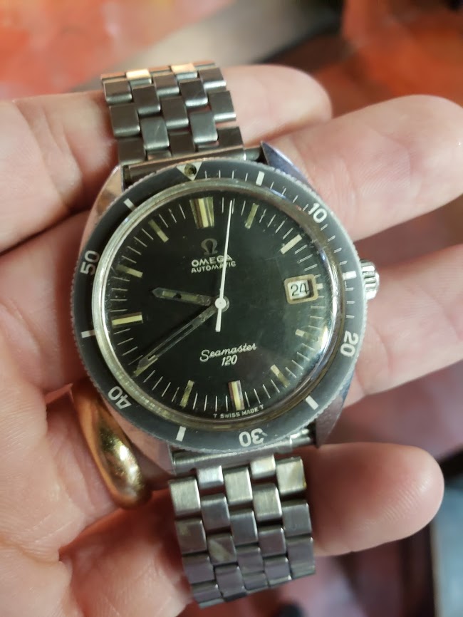 With each watch, I'll the parts he has available/stock. For example a new bezel for the 120, the correct crowns, gaskets, a new Omega 18mm strap, and a 16mm stainless daployant clasp.