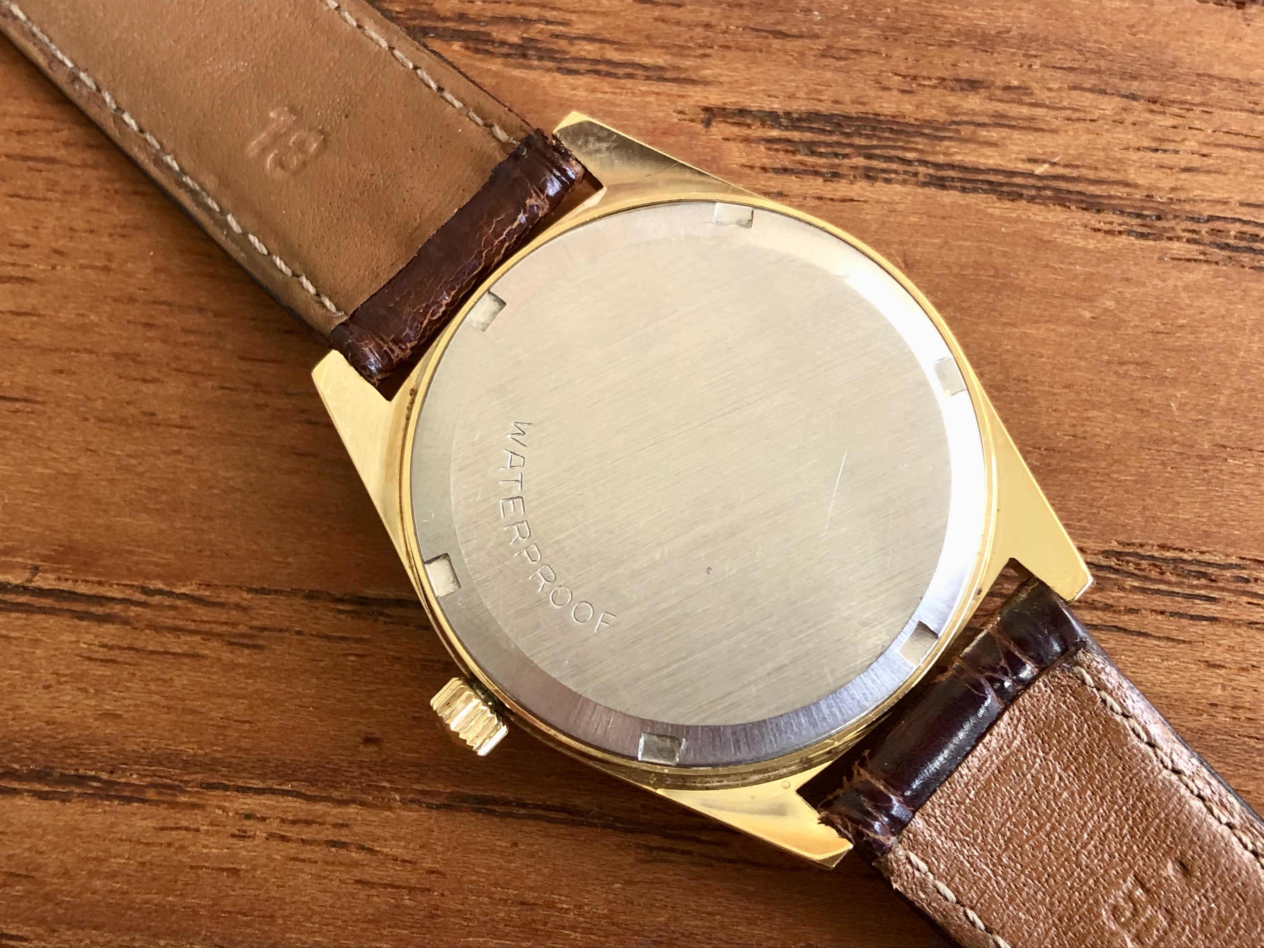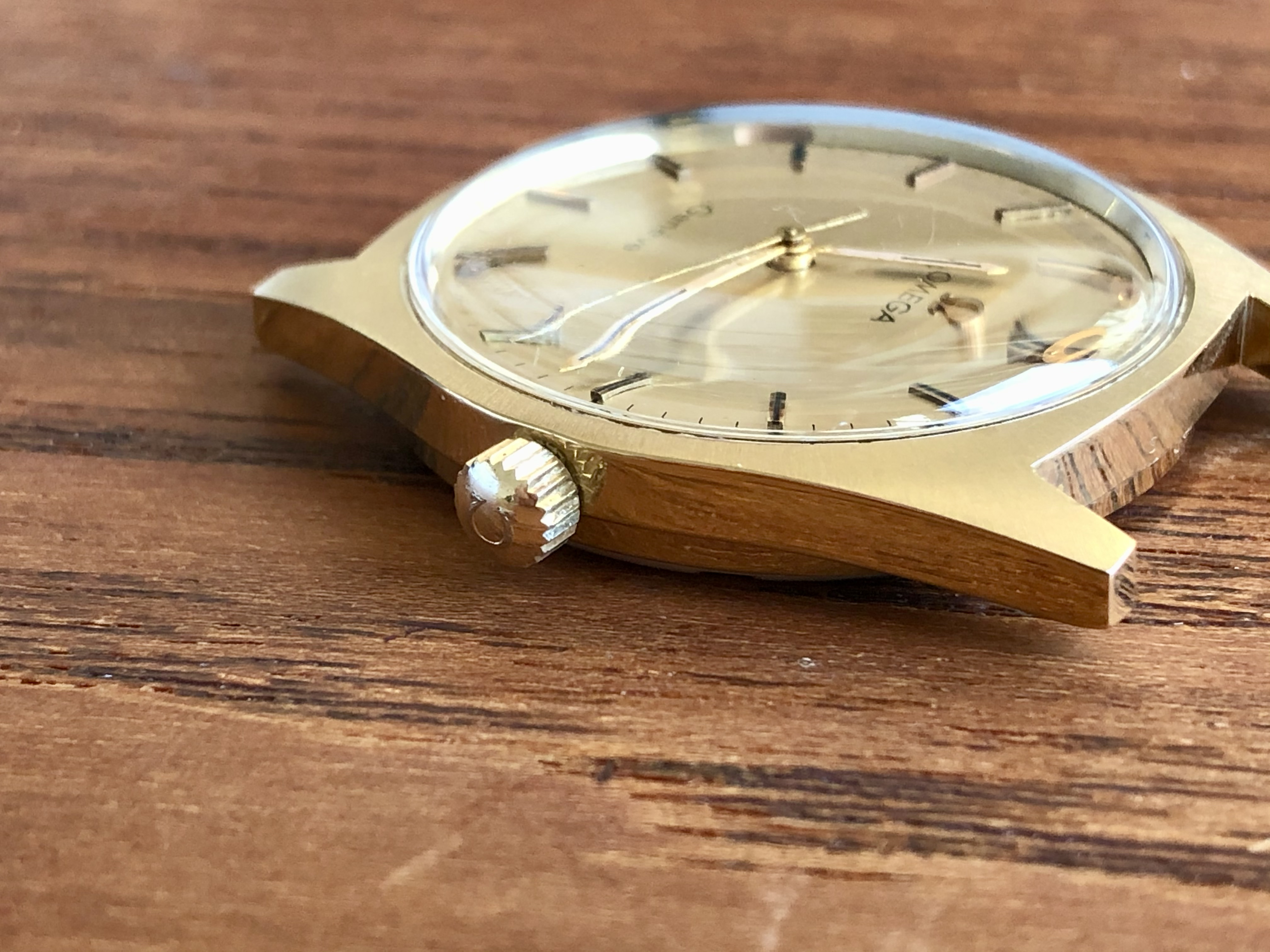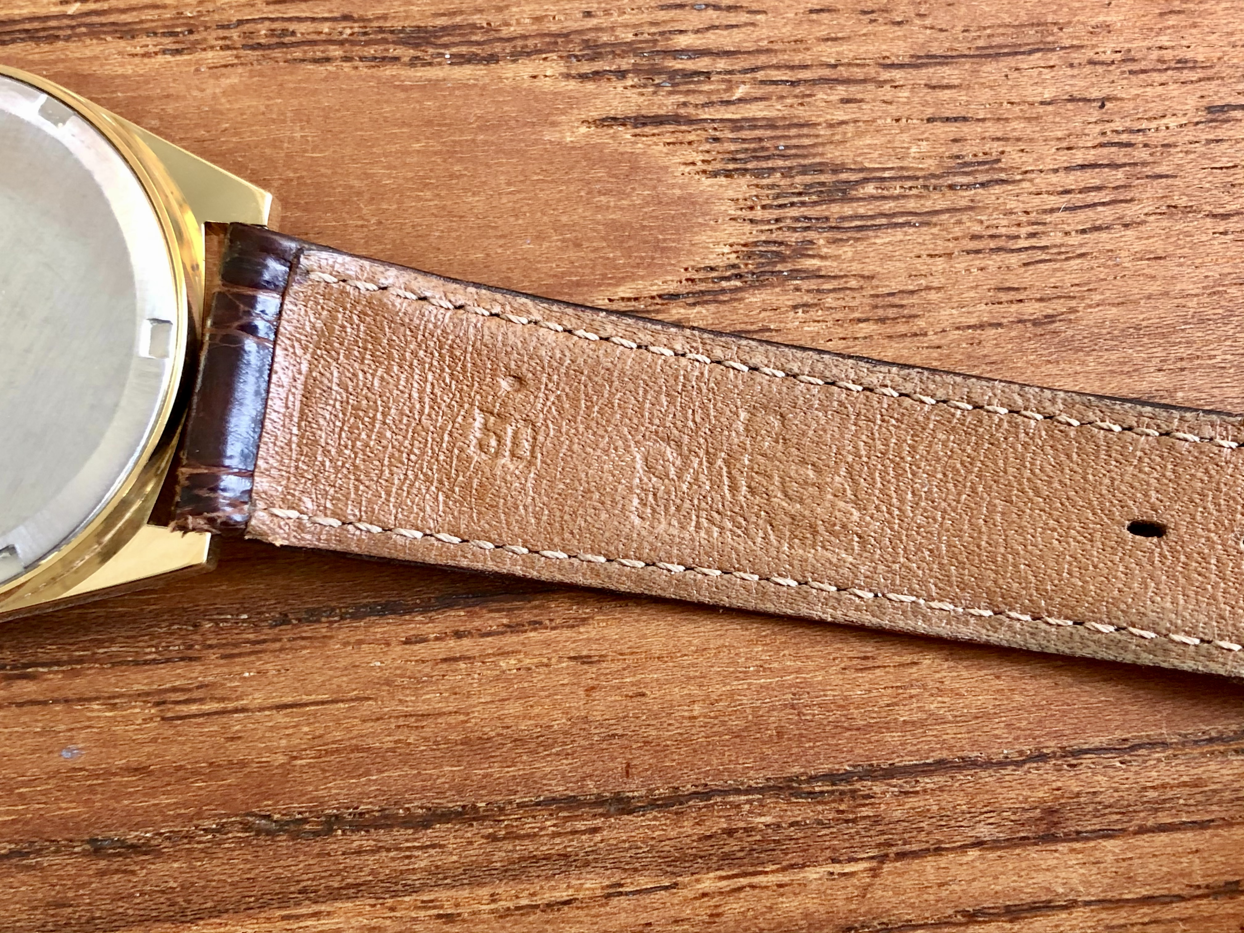 The watch is in great condition and features original Omega signed glass, crown, strap and buckle. The case is one of the sharpest gold plated cases I have ever seen and I almost dare calling it NOS. The sunburst finish on the front is clearly visible and the back cover is also unpolished.