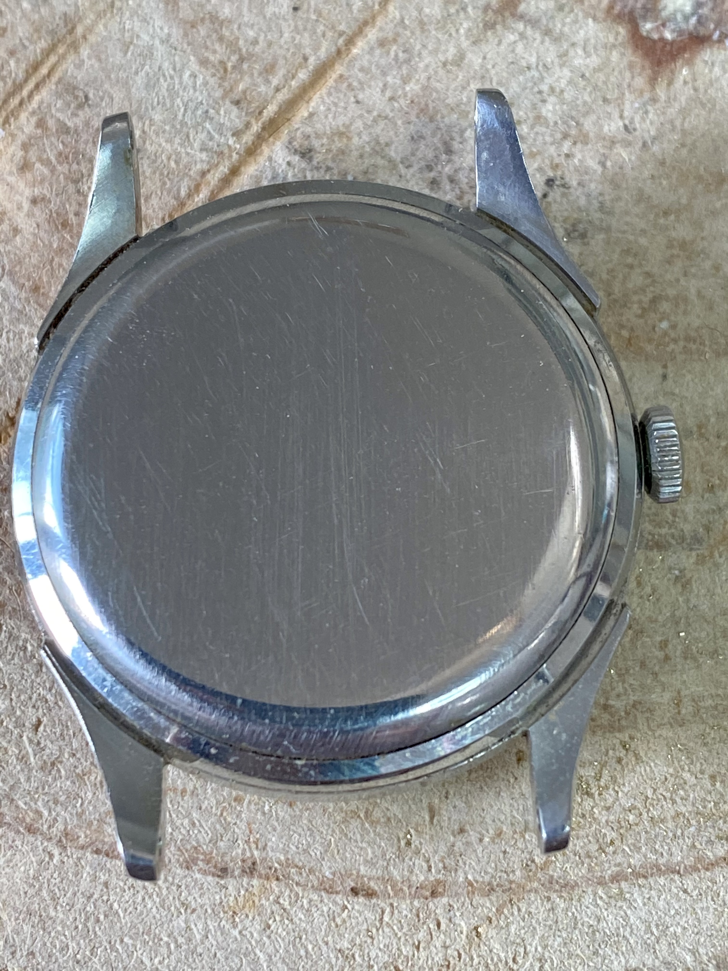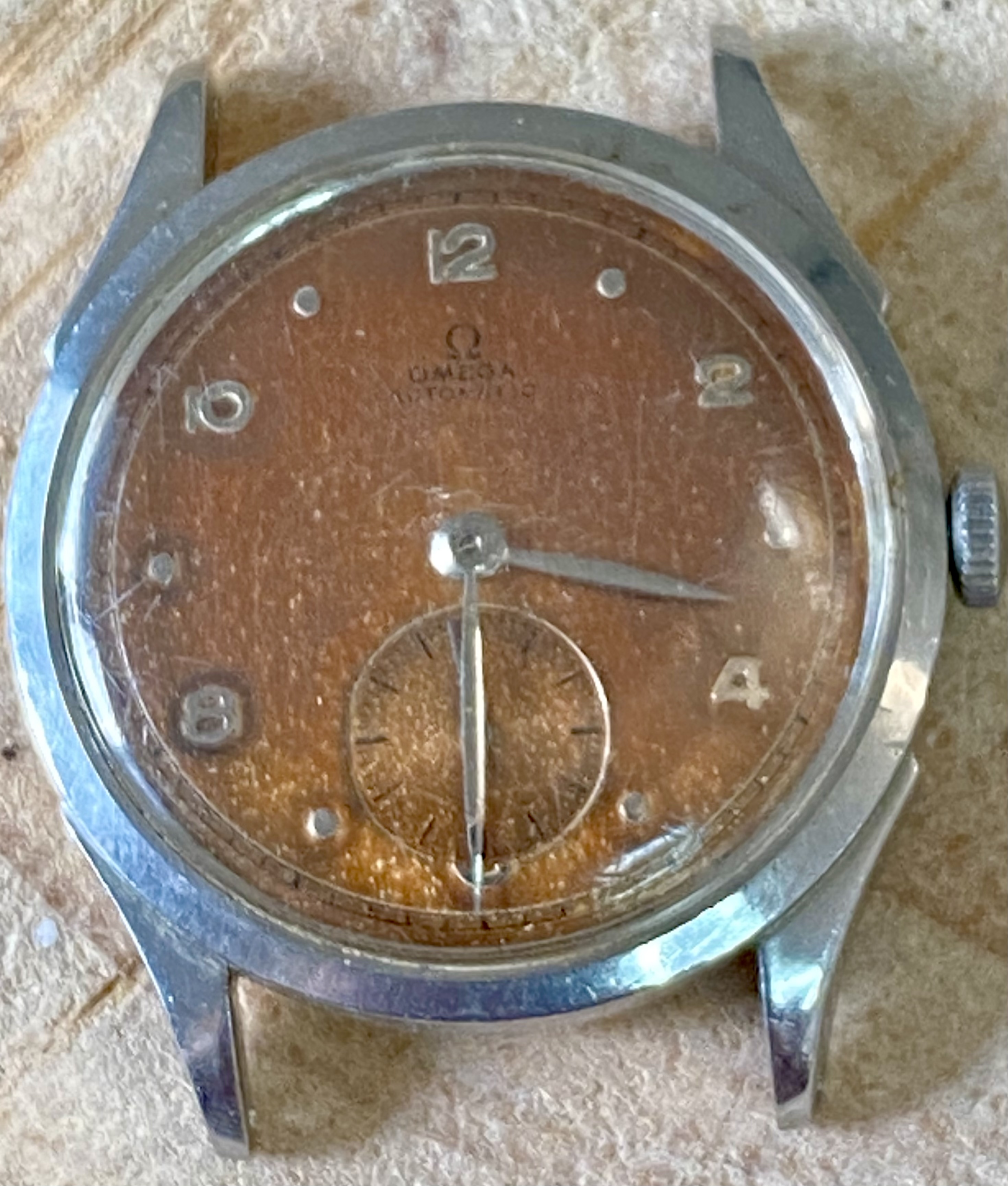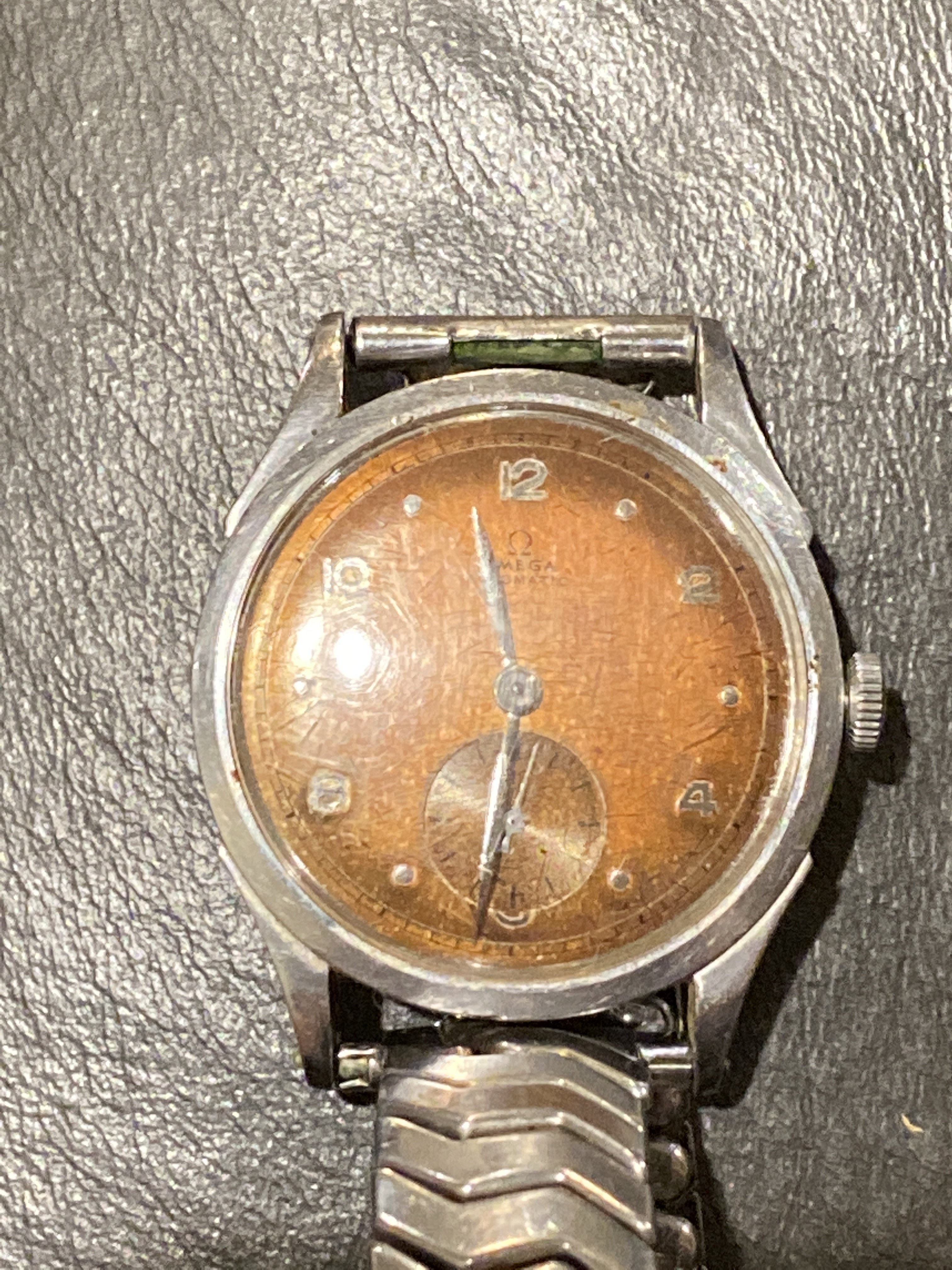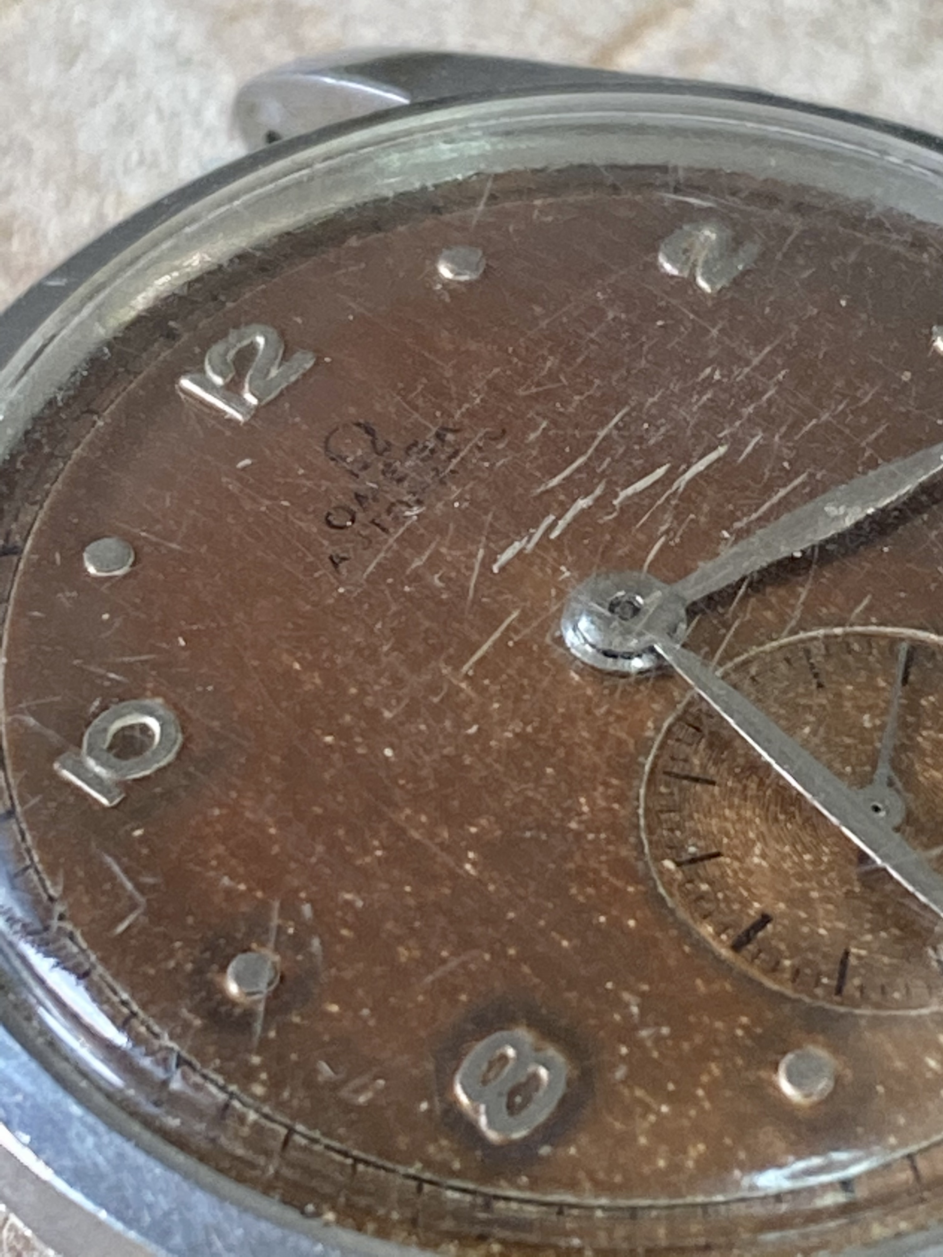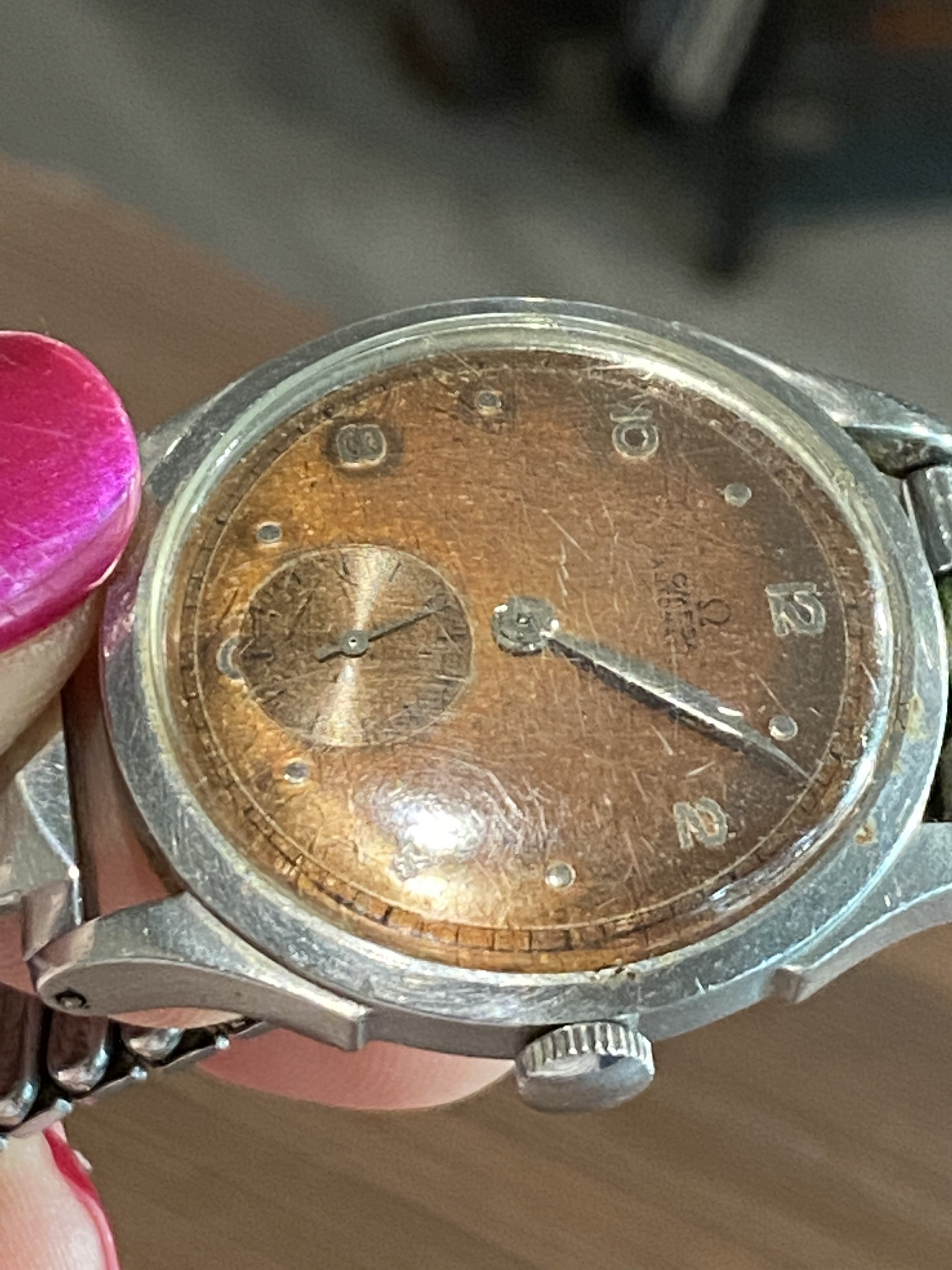 Are you sure that it is a salmon/copper coloured dial and not just very even, dark caramel discolouration? There looks to be slight haloing around the numbers and hour dots, but then again the crystal is too scratched to be sure of much. Either way it's the bargain of the week.