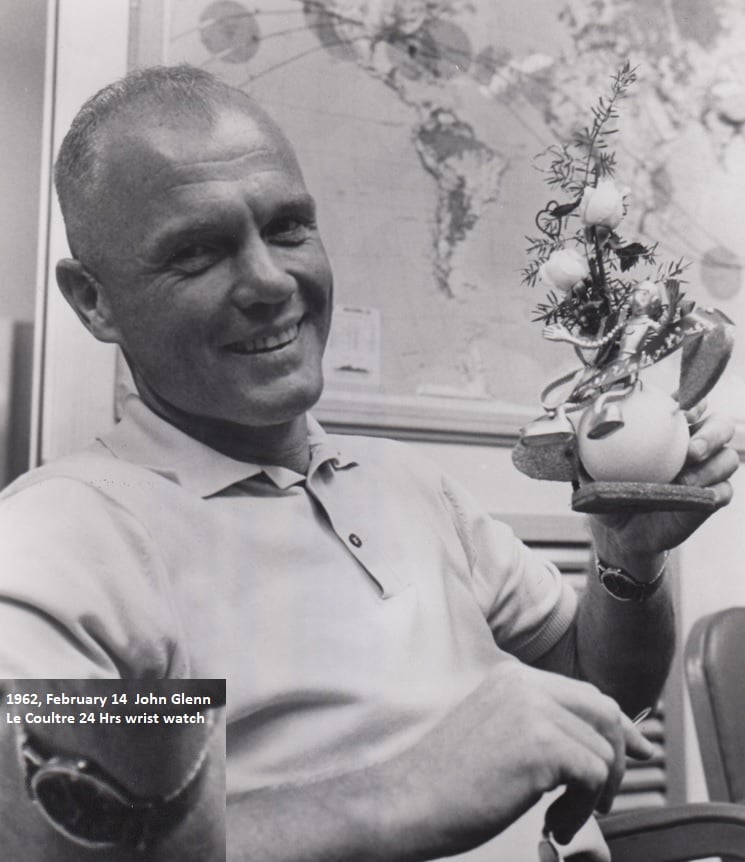 February 1962, mission delay for NASA astronaut John Glenn wearing a 24 hours dial Le Coultre wrist watch