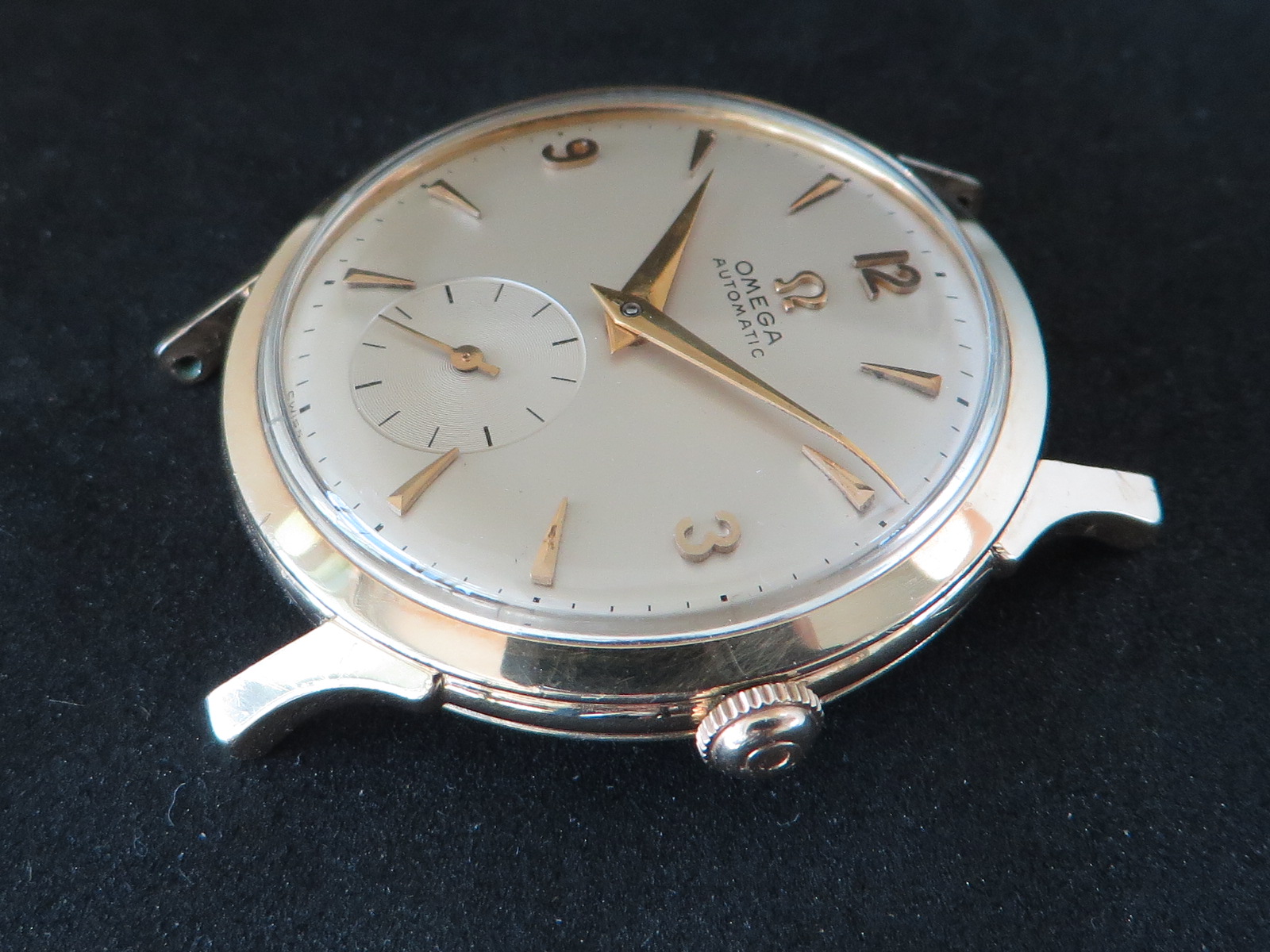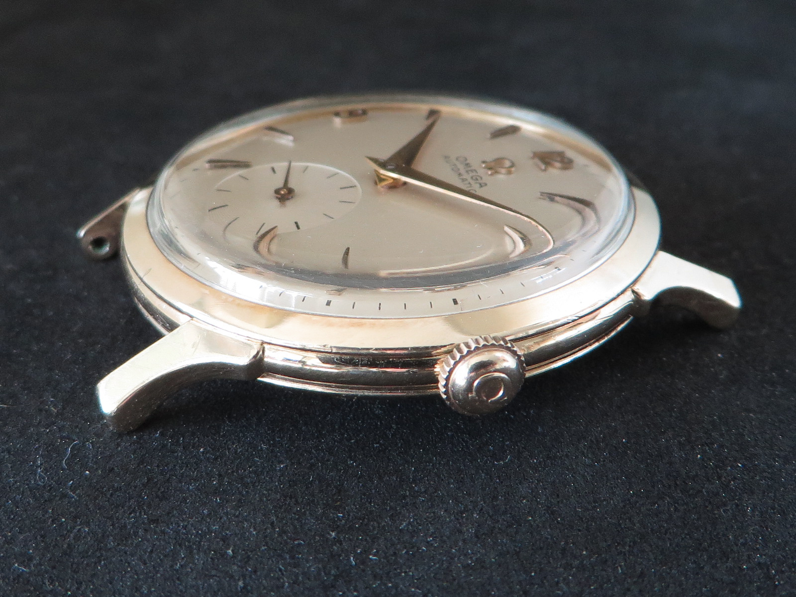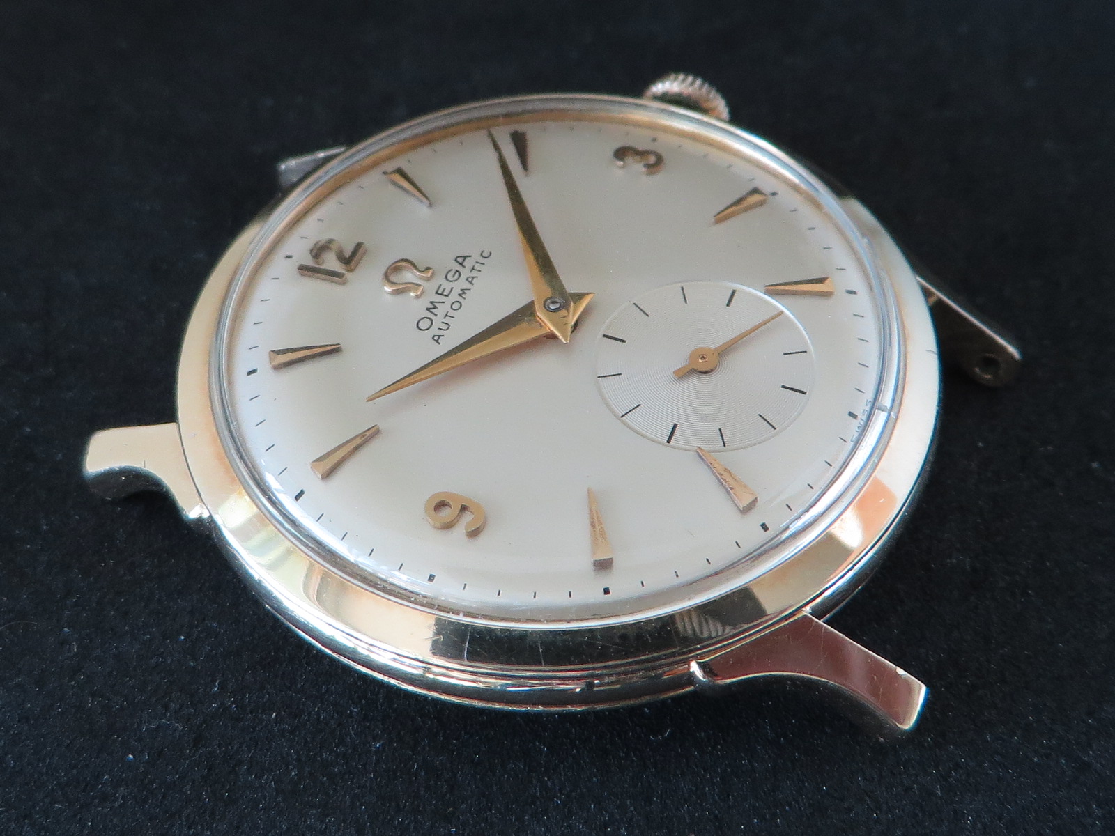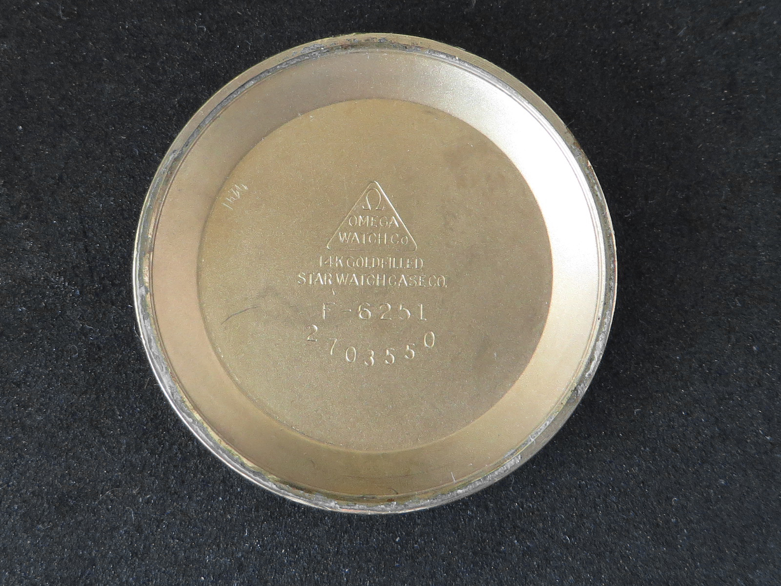 Very sharp reference F-6251 14K gold-filled snap back case with fancy lugs, original Omega crown, correct low dome crystal, unsigned, but many of these US references weren't signed. Case shows some light marks most notably a nick on the back between three and four but no wear through even on the lug tips.