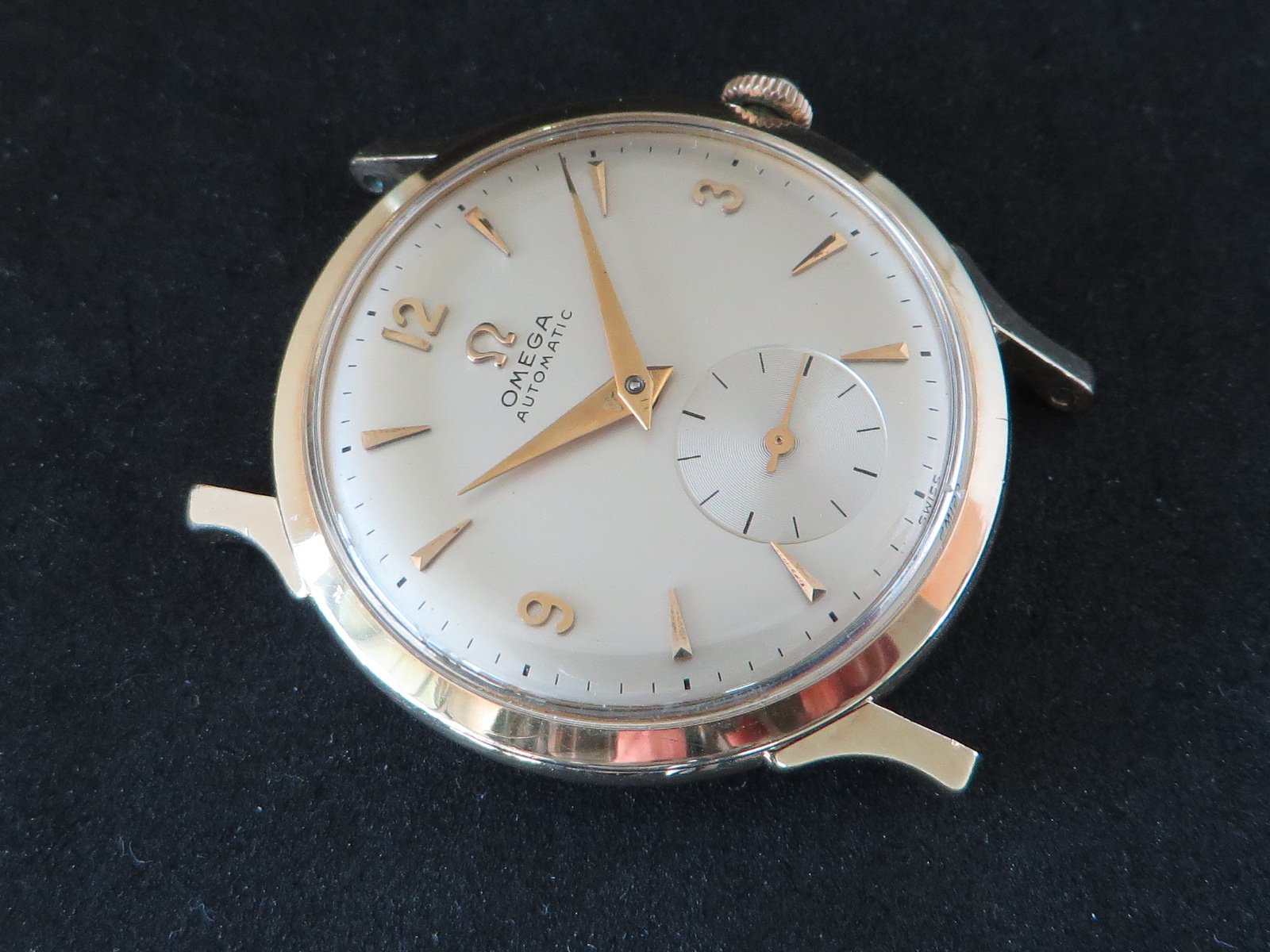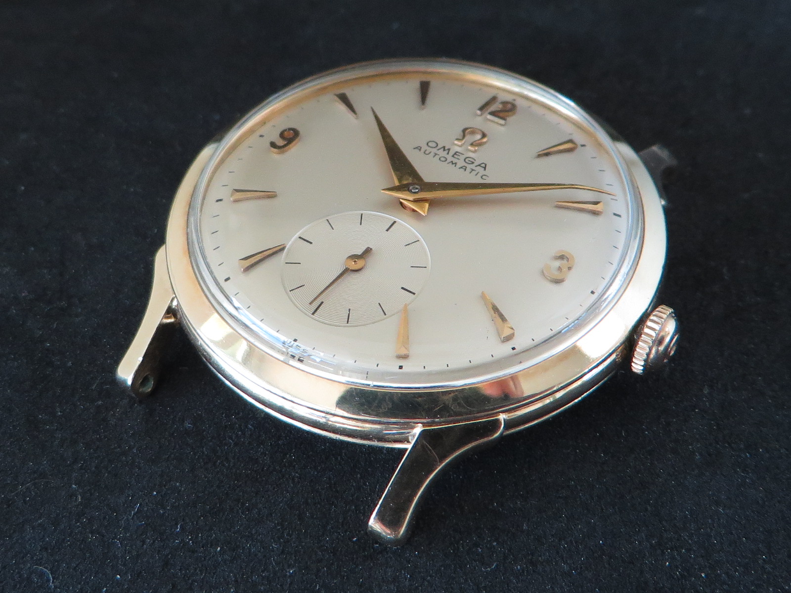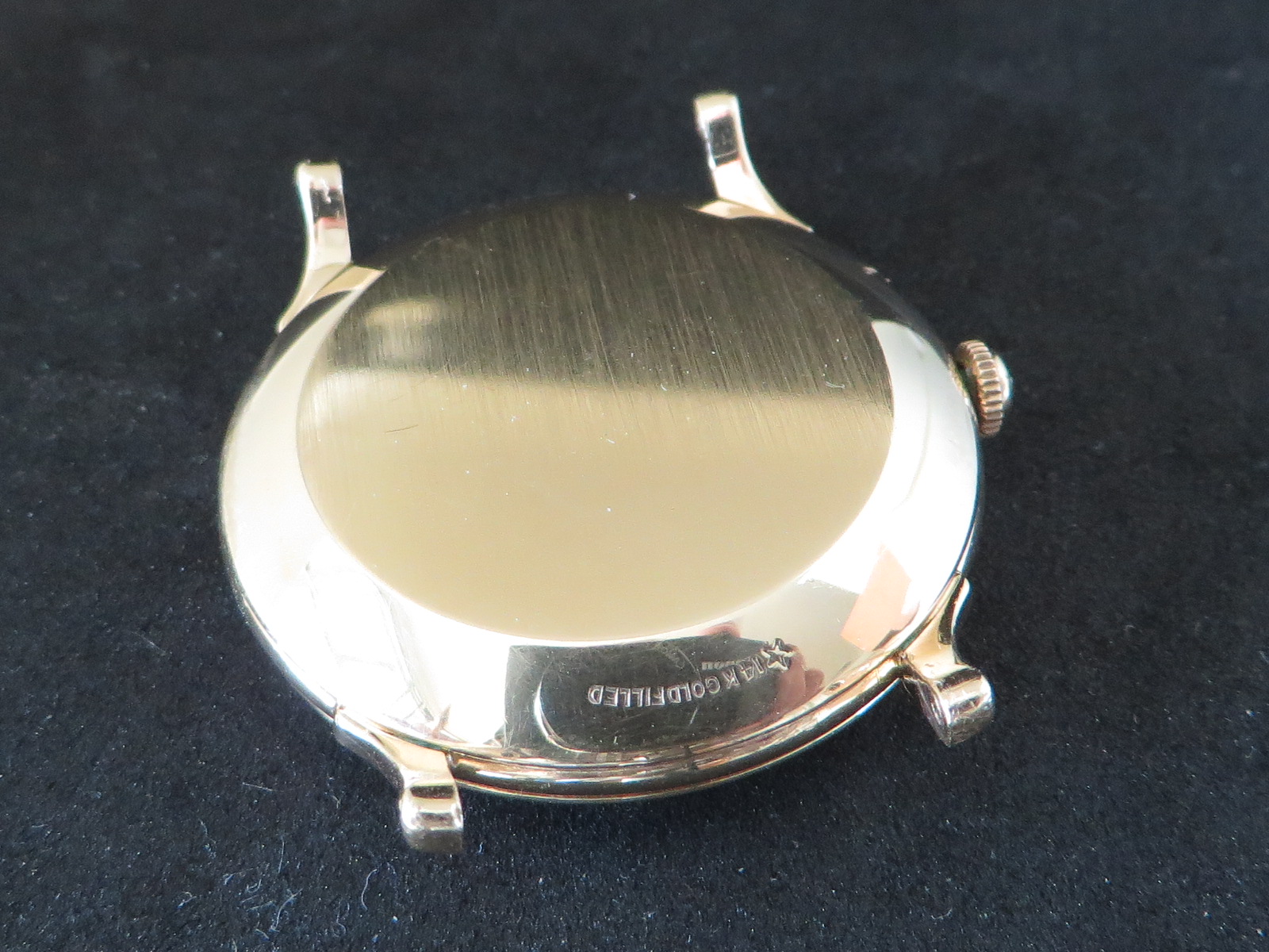 Very sharp reference F-6251 14K gold-filled snap back case with fancy lugs, original Omega crown, correct low dome crystal, unsigned, but many of these US references weren't signed. Case shows some light marks most notably a nick on the back between three and four but no wear through even on the lug tips.