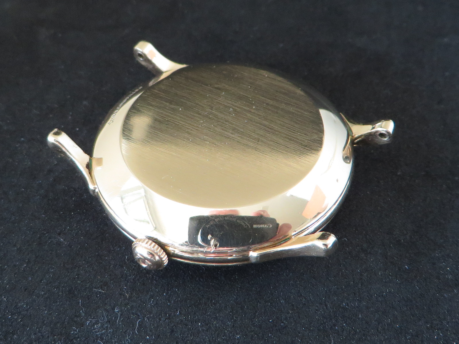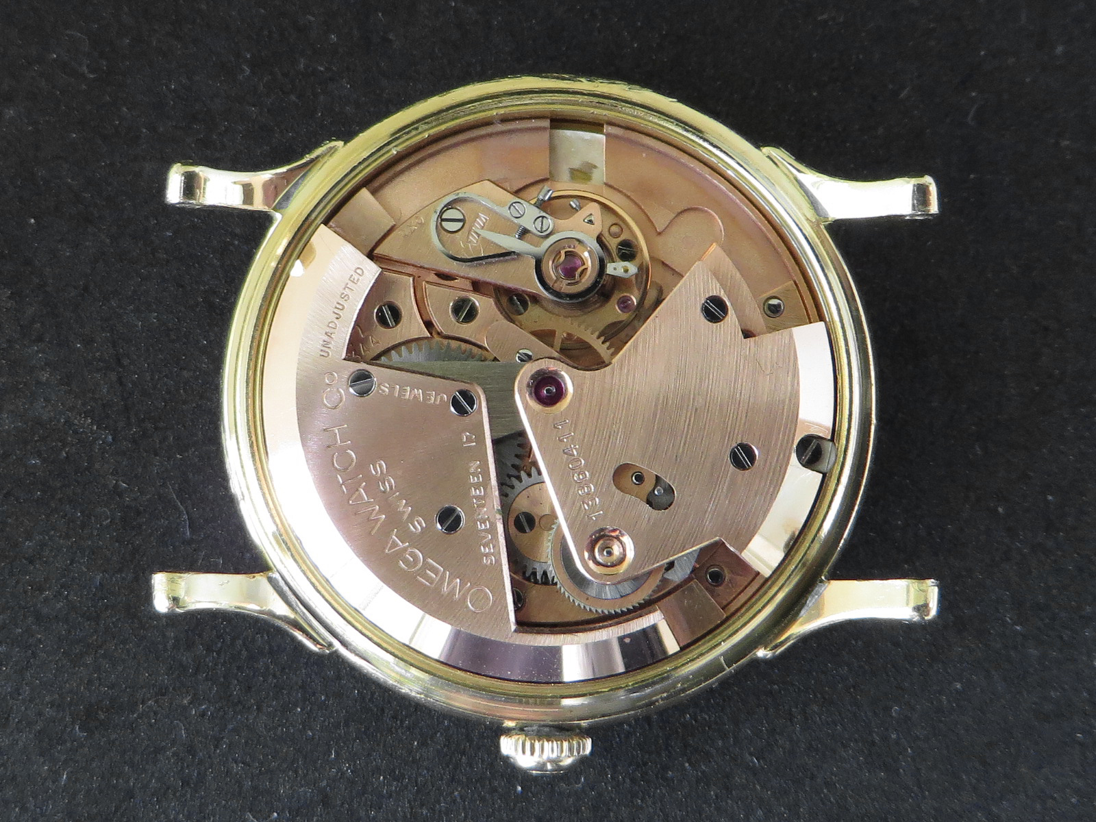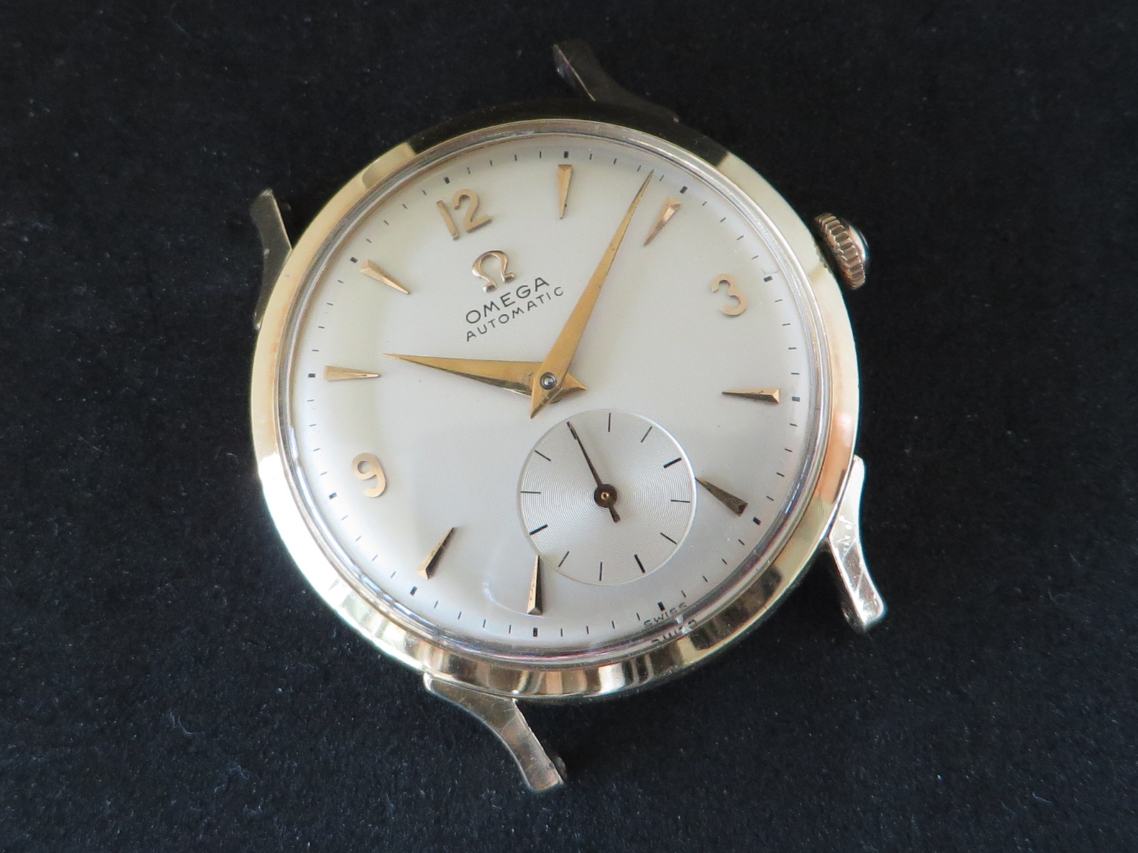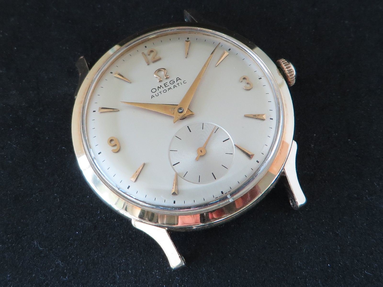 Very sharp reference F-6251 14K gold-filled snap back case with fancy lugs, original Omega crown, correct low dome crystal, unsigned, but many of these US references weren't signed. Case shows some light marks most notably a nick on the back between three and four but no wear through even on the lug tips.