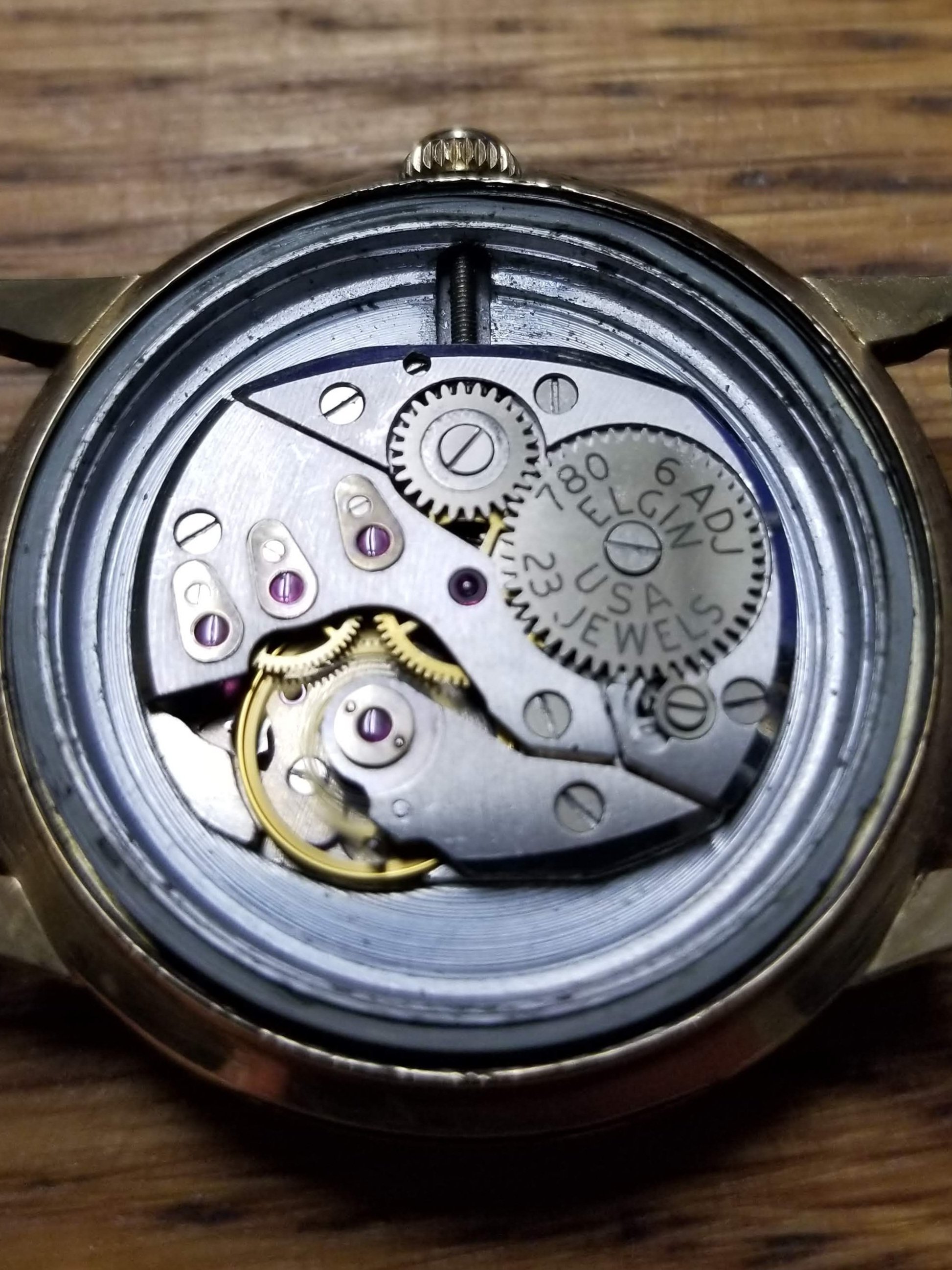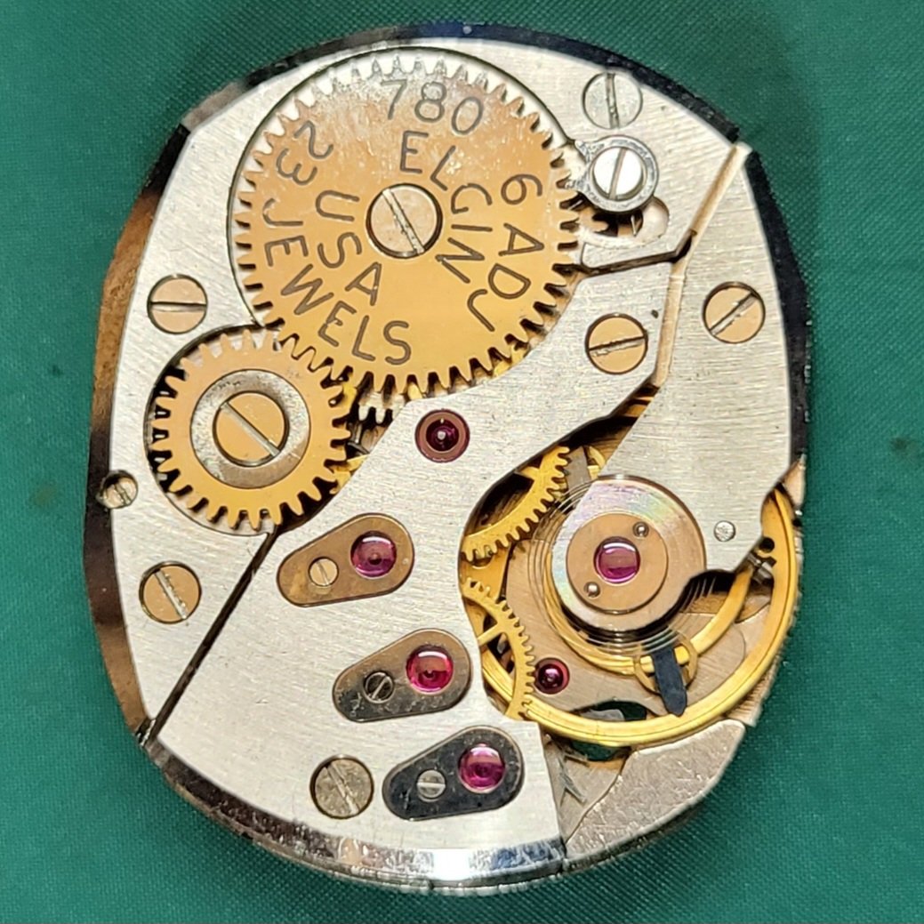 I apologize for the poor quality of the photos, but here is my B.W. Raymond wrist watch with the Elgin 780 movement. As @Canuck points out the watch is round while the movement is tonneau shaped. Unfortunately the watch is running in the photo, so you can only get an idea of the durabalance from the photo. The first and easiest thing to notice is the lack of an external regulator. You will also notice that the paint on the dial has started to peel from the soft iron dial in places. I really need to find a decent dial refinisher and have them repaint this one.